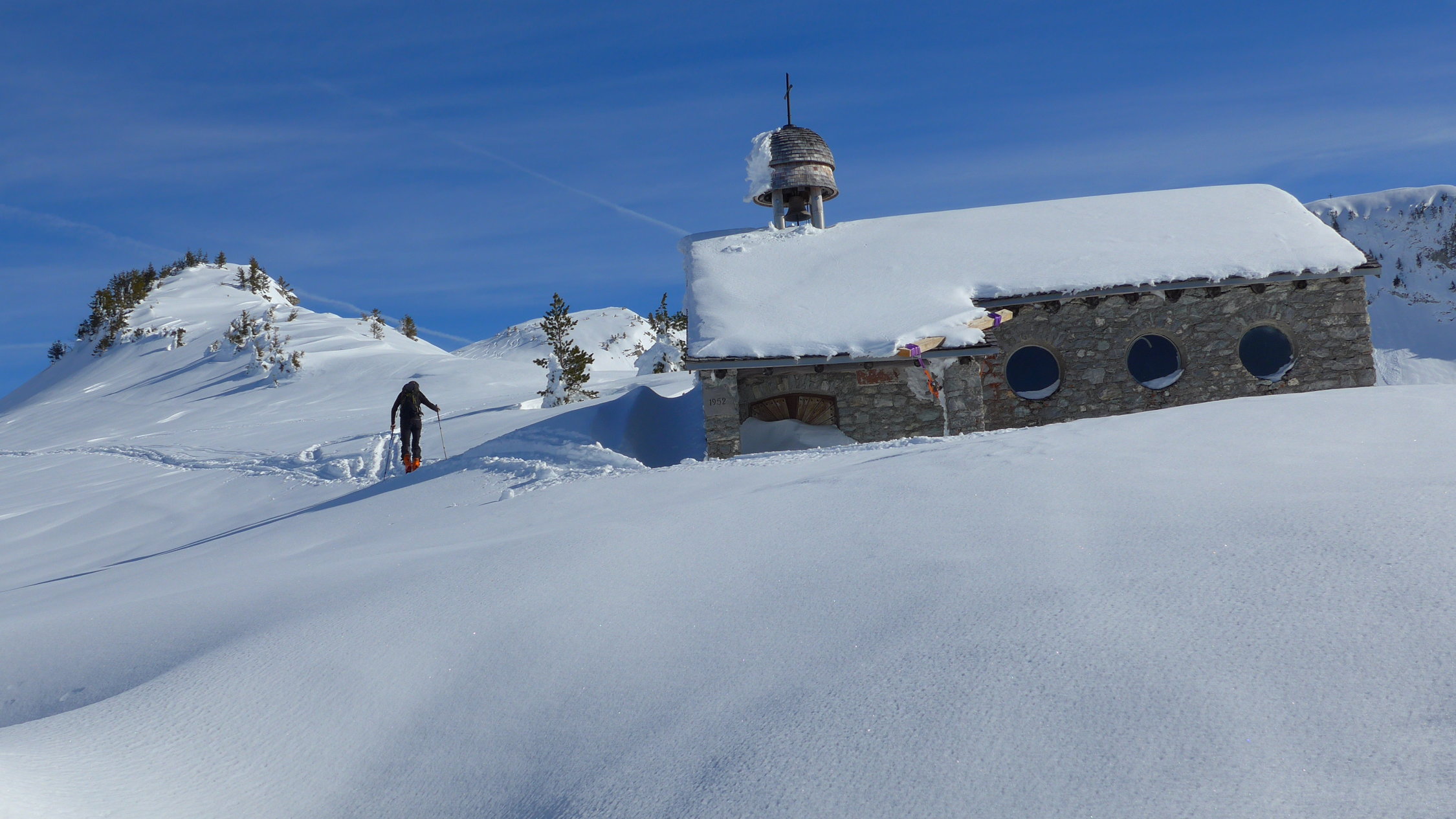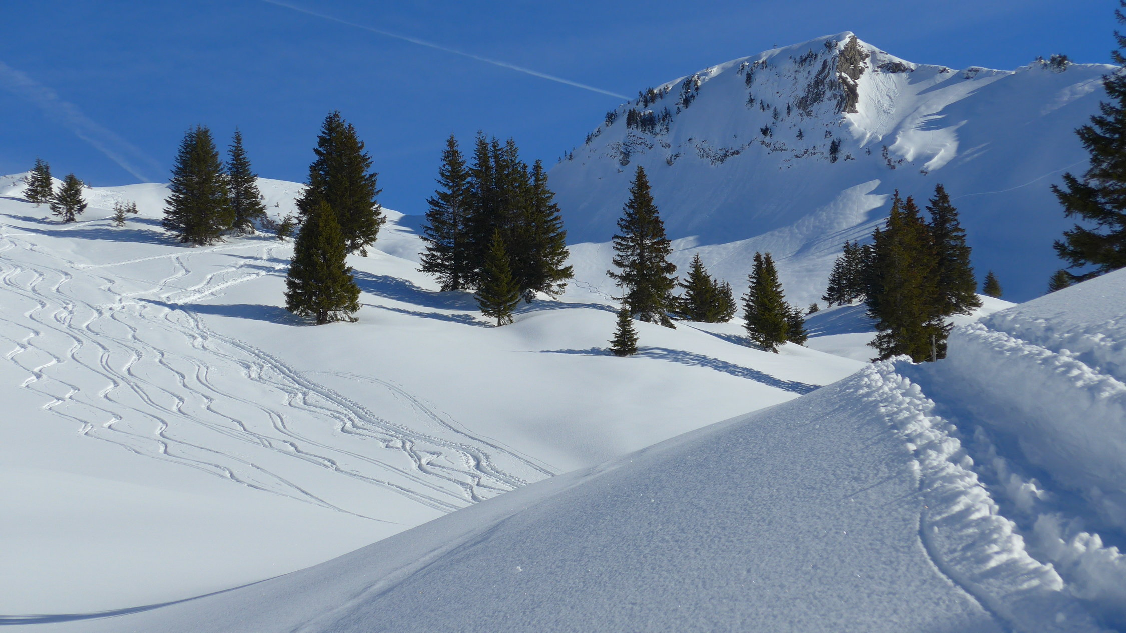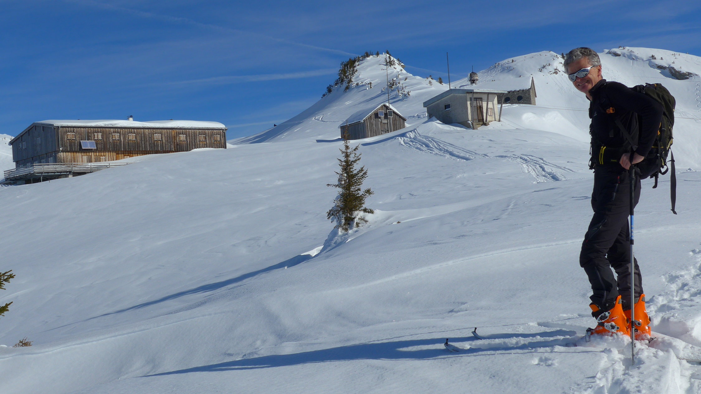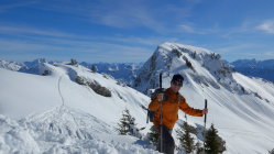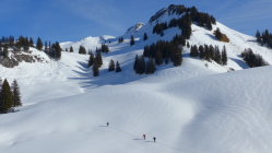 Die Mellenköpfe zwischen dem Hohen Freschen und der Matona haben bei Genusstourengehern einen hohen Stellenwert. Hier kann man aus dem Skigebiet Laterns starten, mit der Tourenkarte alle Lifte einmal fahren und so auf mittlerer Höhe des Nob-Schleppliftes losmarschieren. Schnell ist die Untere Saluveralpe erreicht. Der weitere Anstieg über das Freschenhaus ist herrlich sonnig und ein wunderbares Wintermärchen. Lange könnte man am Gipfel noch sitzen, doch die Mellenköpfe sind heute ein Pulverschneetraum. Viel zu schnell ist man wieder unten, beim kurzen Gegenanstieg nach der Saluveralpe und der Schlepplift bringt uns wieder zurück ins Pistengebiet.