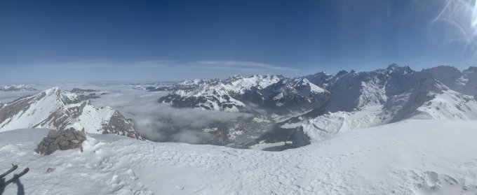 Im Aufstieg voll sonnig, aber wegen der für mich überraschend starken Bise kein Sulz bis am Mittag. Teils unangenehm starker Wind. Abfahrt dann nordseitig, da ich gehofft hatte (wie in der Ostschweiz) dort noch Teils Piäulver zu finden. Aber von oben bis unten eher sehr unschön zu fahren. Verfahren u knüppelhart.