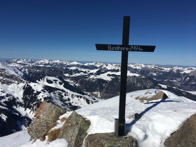 Abfahrt kurz nach dem Mittag, Westflanke sulz pur, dann beim Wanderweg alle Schneearten angetroffen, danach zwischen Presspulver und sulz je nach Hanglage. Genug Schnee. Mit den Skis bis zum Gipfel. Wird noch so bleiben. Wärme beachten.