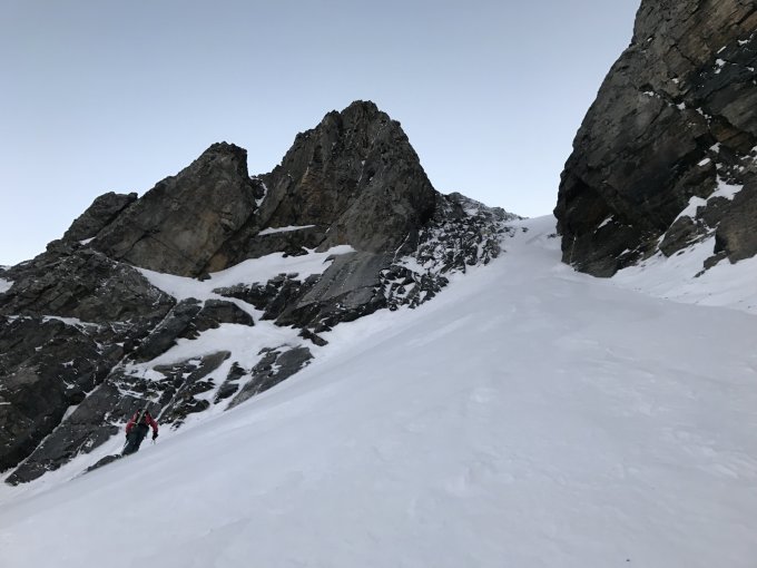 Die Abfahrt auf dem Gletscher ruppig. Mein Kollege ist vom Gipfel abgefahren (inklusive der Blankeisstelle unter dem Sattel und dem schmalen, steilen Couloir). In der Fläche oberhalb von der Hütte noch ein paar Schwünge in schönem Powder. Darunter wieder hart oder nass. Abstieg (zu Fuß) nach Filfalle.