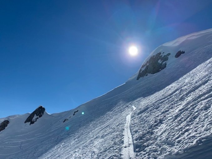 In der Abfahrt teils Pulver, leichter Deckel und schöner Sulz. Die Rutsche in den Sonnenseiten sind noch nicht so gravierend.
