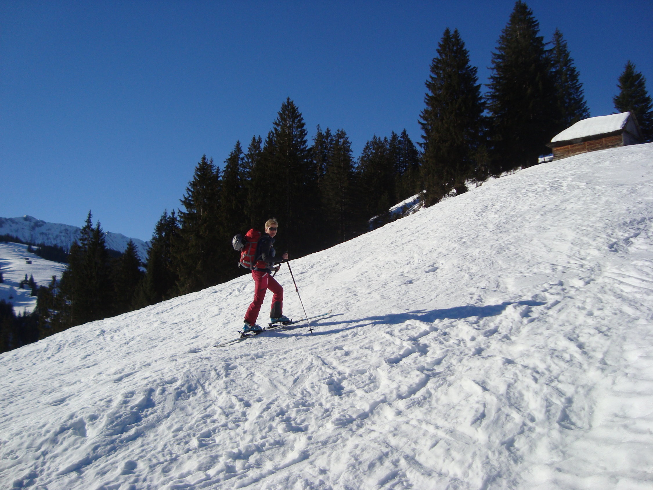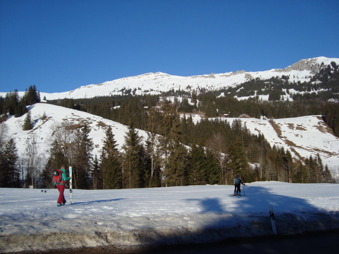 Start der Tour gegen 9.00 Uhr bei -4°C am PP Hirsegg. Sonne pur, kein Wind. Die Ski können grad unten montiert werden.