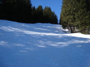 Abfahrt dann gut aufgesulzt. In den wenigen Schattenbereichen etwas krustig bis hart. Der letzte Hang zur Brücke hinunter, sehr hart und ausgefahren.