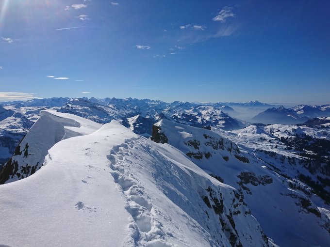 Der Weg bis um die Kante (Talseite) guter Trittschnee. In Ermangelung von Steigeisen und Pickel wurde es ab hier ziemlich Ernst und ich habe auf dem langen Weg zum Gipfelkreuz mehrfach inne gehalten und mit dem Gedanken gespielt, die Sache abzubrechen...Aber irgendwie zieht der Gipfel dann doch und irgendwie ging es dann auch. Alte Spuren waren schwer zum Lesen und es hatte teilweise bodenlosen Griesschnee. Der Gipfelgrad ist an mehreren Stellen stark verwächtet. Deshalb ist genügen Abstand ein zu halten. Irgenwie hab ich es dann doch bis zum Kreuz geschafft. Das Panorama liess die ganze Plackerei schnell vergessen.