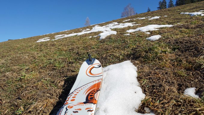 Obwohl ganz Unten der Schnee allmählich davonschmilzt, würde ich die Verhältnisse immer noch als Gut betrachten. Die aperen Stellen sind sehr kurz (siehe Bild). Weiter oben genügend Schnee aber erwartungsgemäss ziemlich verfahren. Und trozdem fand ich bei der Abfahrt in den Nordhängen tatsächlich noch unberührter Pulver! Oben schöner Sulzschnee geradezu perfekt. Ich bin um 14:00 Uhr abgefahren, vielleicht spät aber dafür wie gesagt, bester Sulz.