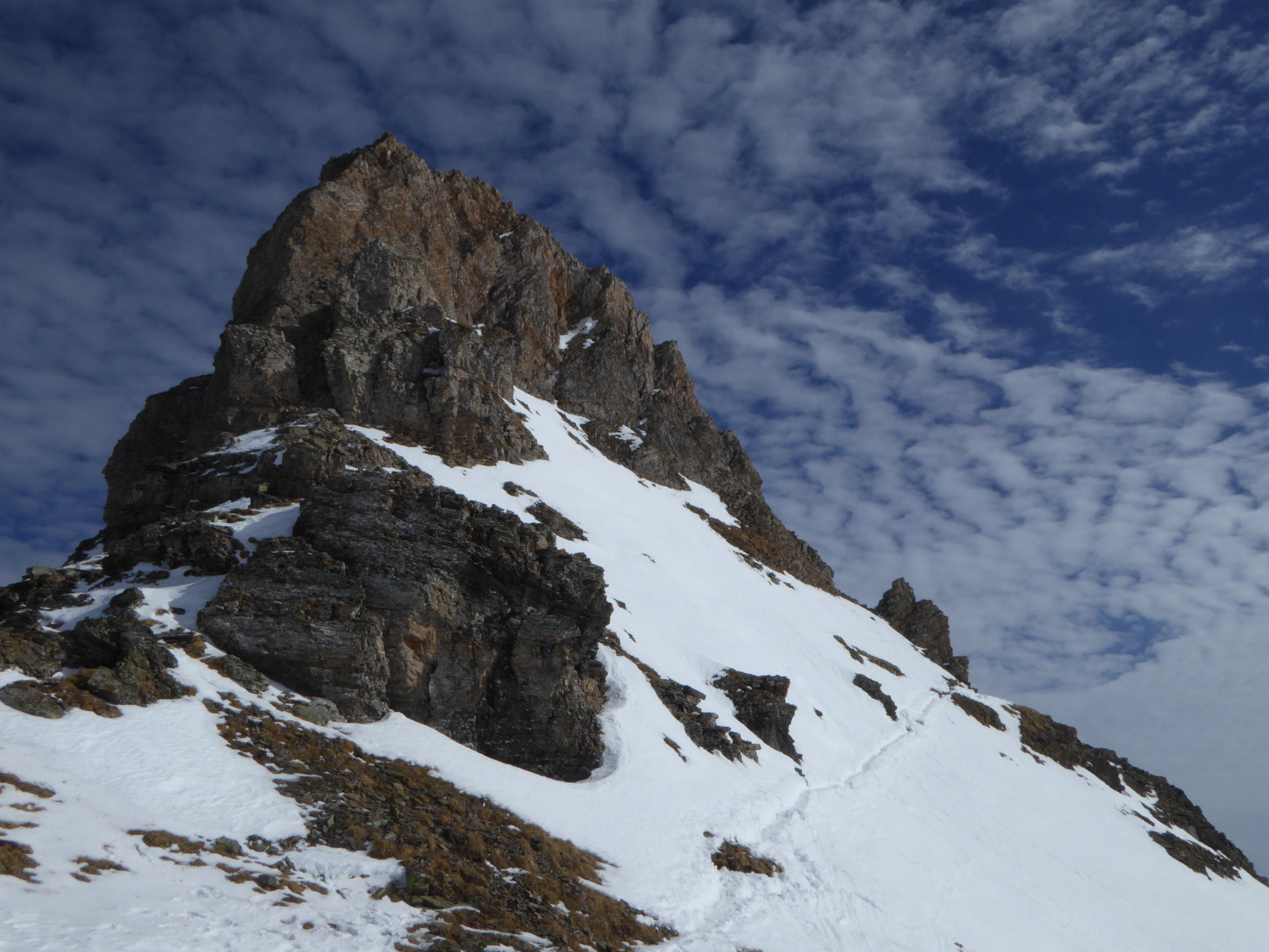 wolenloser, blauer Himmel, windstill, sehr warme Verhältnisse bereits morgens um 9 Uhr. Ab Alp Fursch leichter Wind von Ost. Auf dem Gipfel kräftiger und kühler Ostwind. Da Exposition grössenteils nordseitig, bleibt der Schnee trotzdem bis Mittag gut. Im oberen Teil der Route zunehmend eisig (Harscheisen). Ab Mittag von Osten aufkommende Bewölkung und zunehmender Wind von Ost.