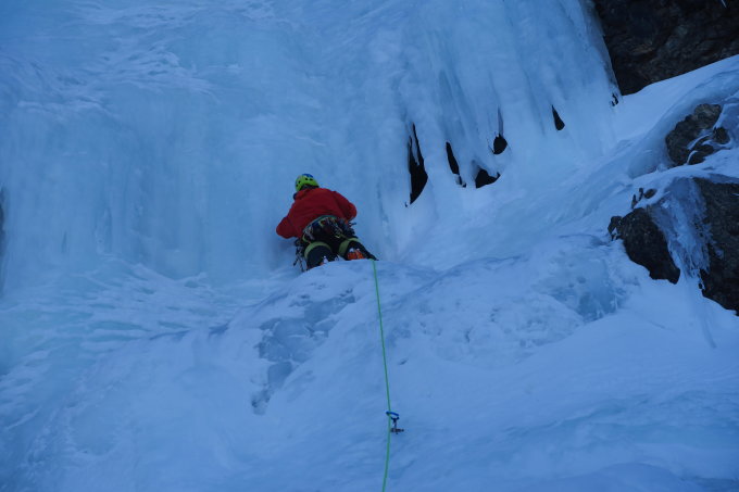 Originaleinstieg rechts gut möglich (2 kurze Eisstufen WI 2-3, sonst Schnee), aber heute ausgelassen und direkt über Rinne zum Eisfall. Stand am Ende der Eislänge besteht nur noch aus einem Schlaghaken => noch im Eis an Schrauben Stand machen.