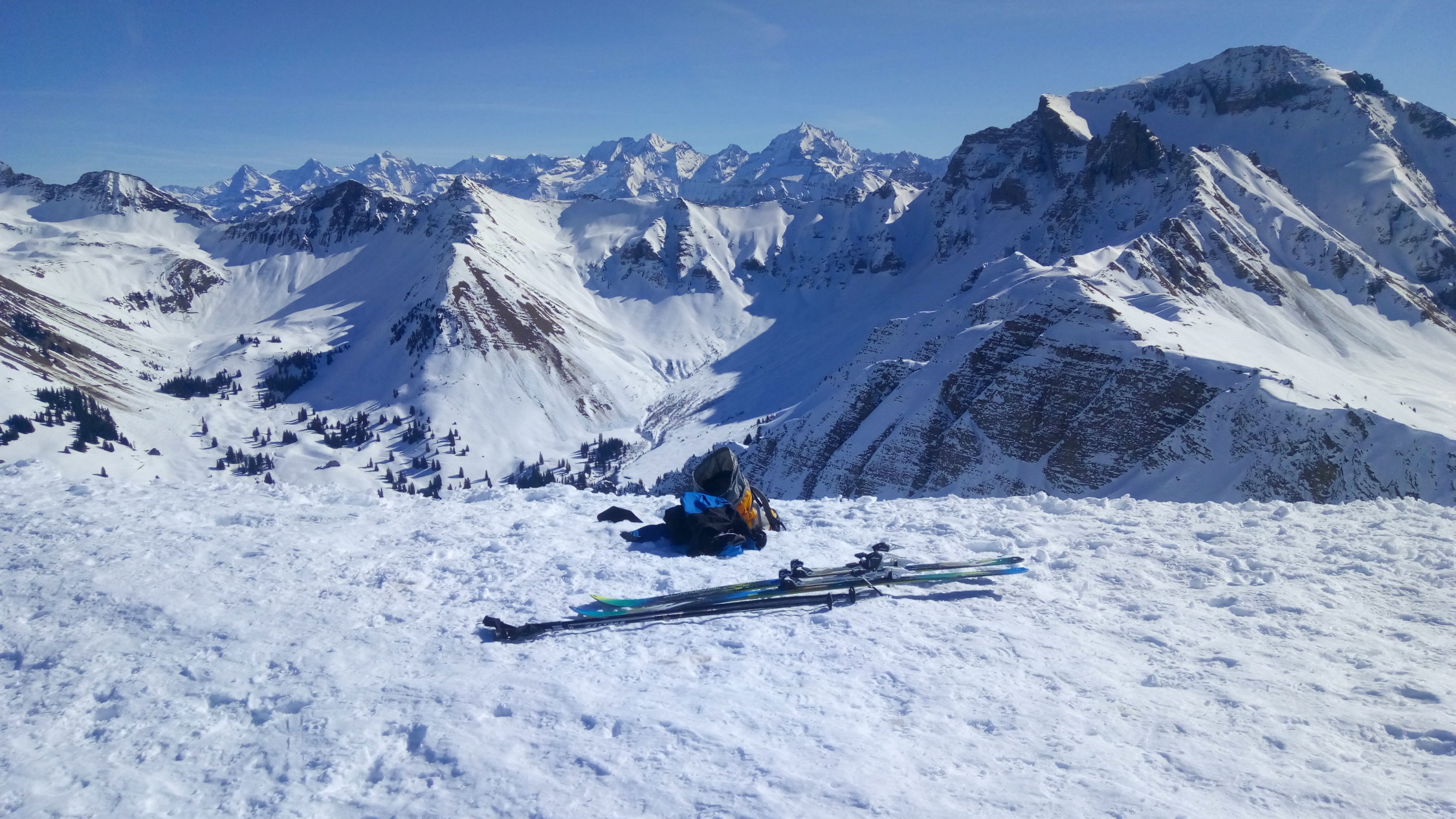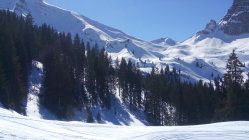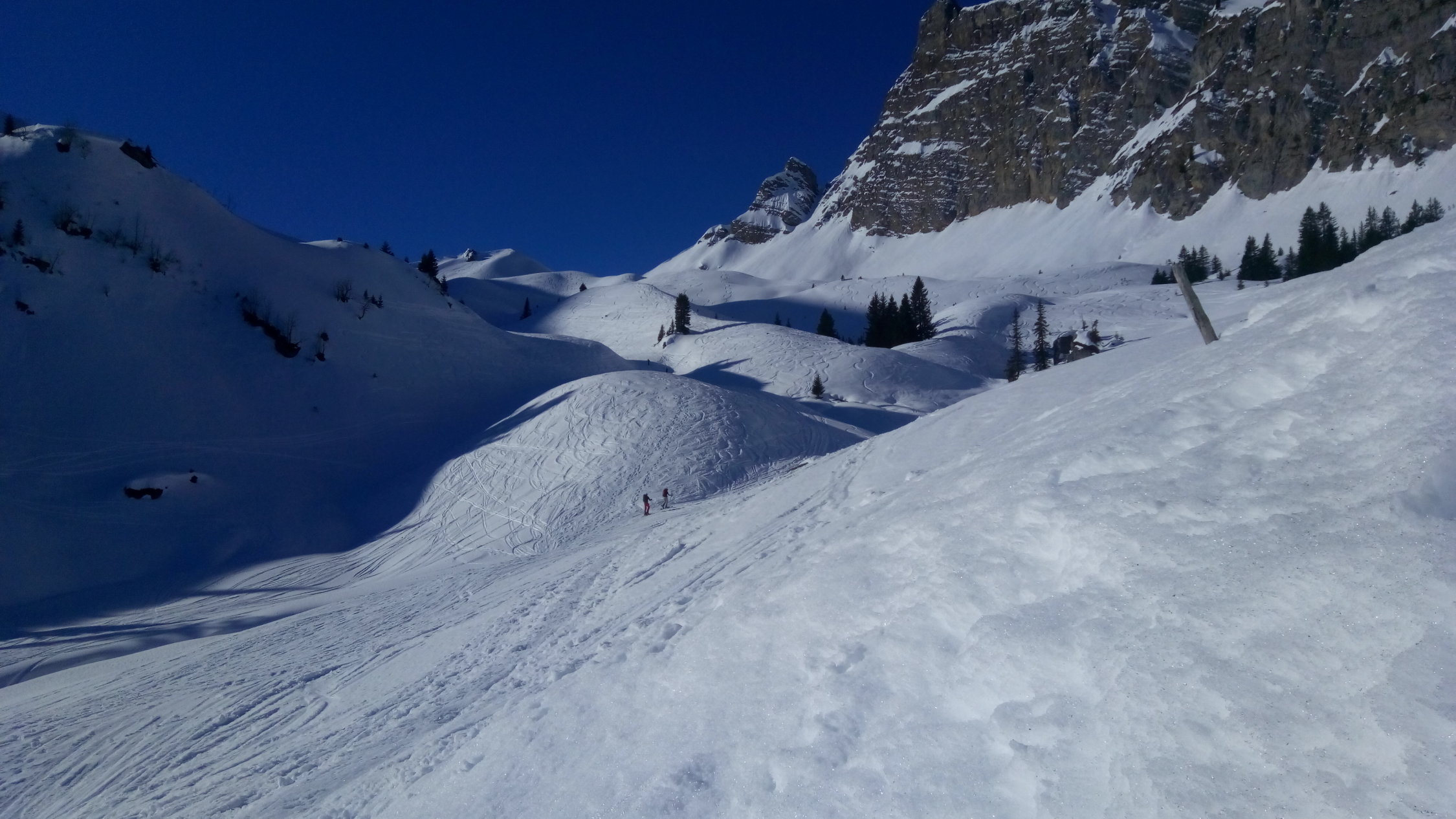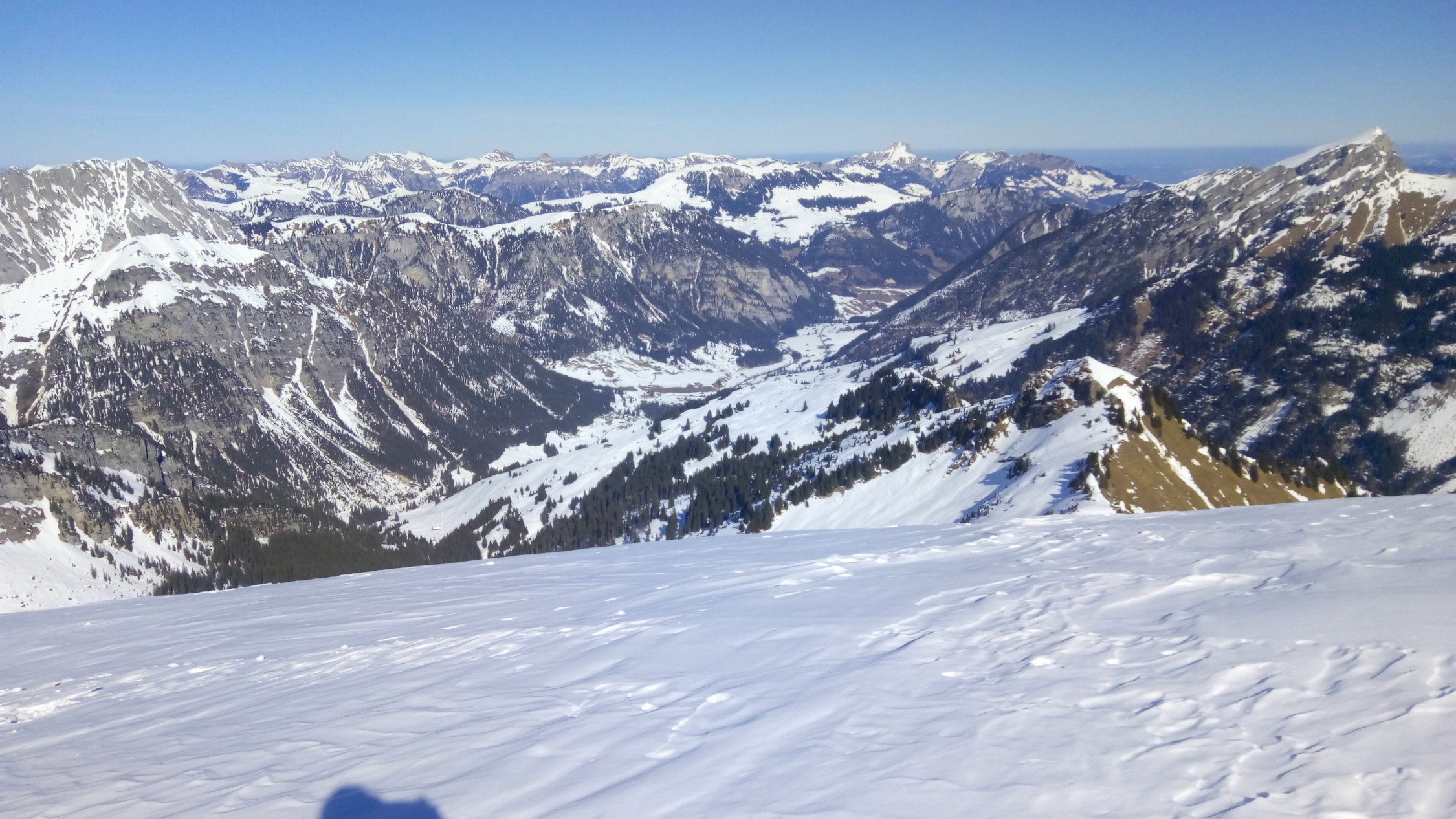 Abfahrt ab Gipfel 12.30 zur Grimmifurggi immer noch gefroren. Bin dann Ostwärts in die Hänge, teilweise noch schöne Pulverschwünge und unter dem Arblihore zum Skilift. Kurzer Gegenaufstieg, ansonsten problemlos und sicher schöner als den gefrorenen Wald runterkratzen. Das letzte Stück von der blauen Piste zum Parkplatz brüchig.