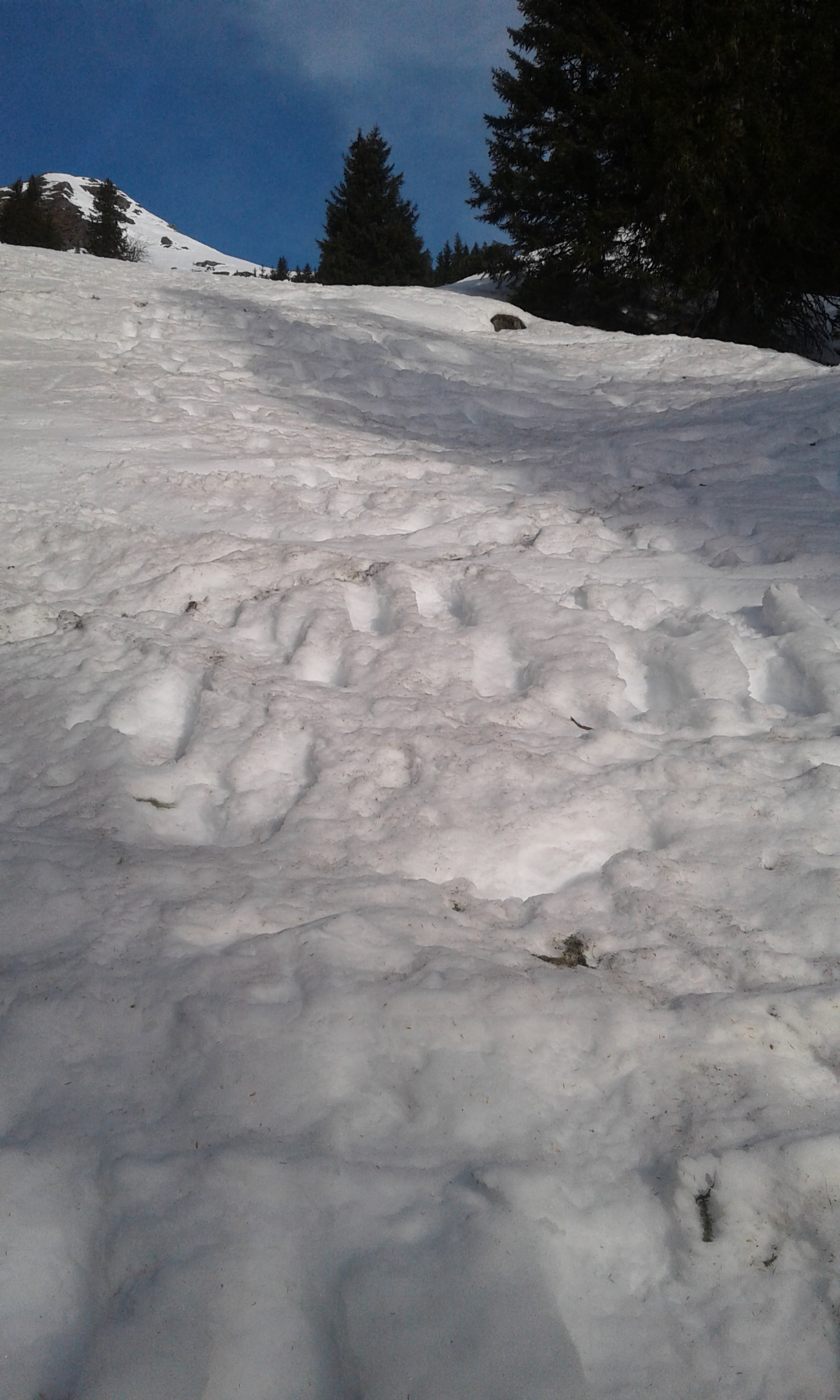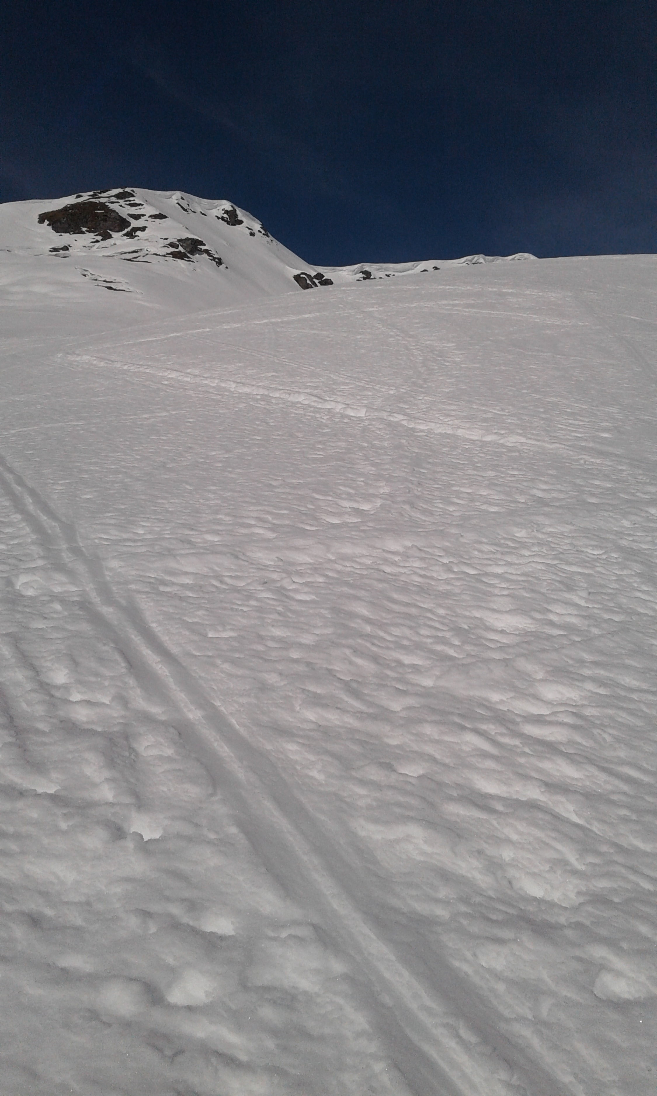 Südseitig ziemlich viele tiefe gefrorene Spuren...einzig der Gipfelhang ist glatt 300 - 400 hm