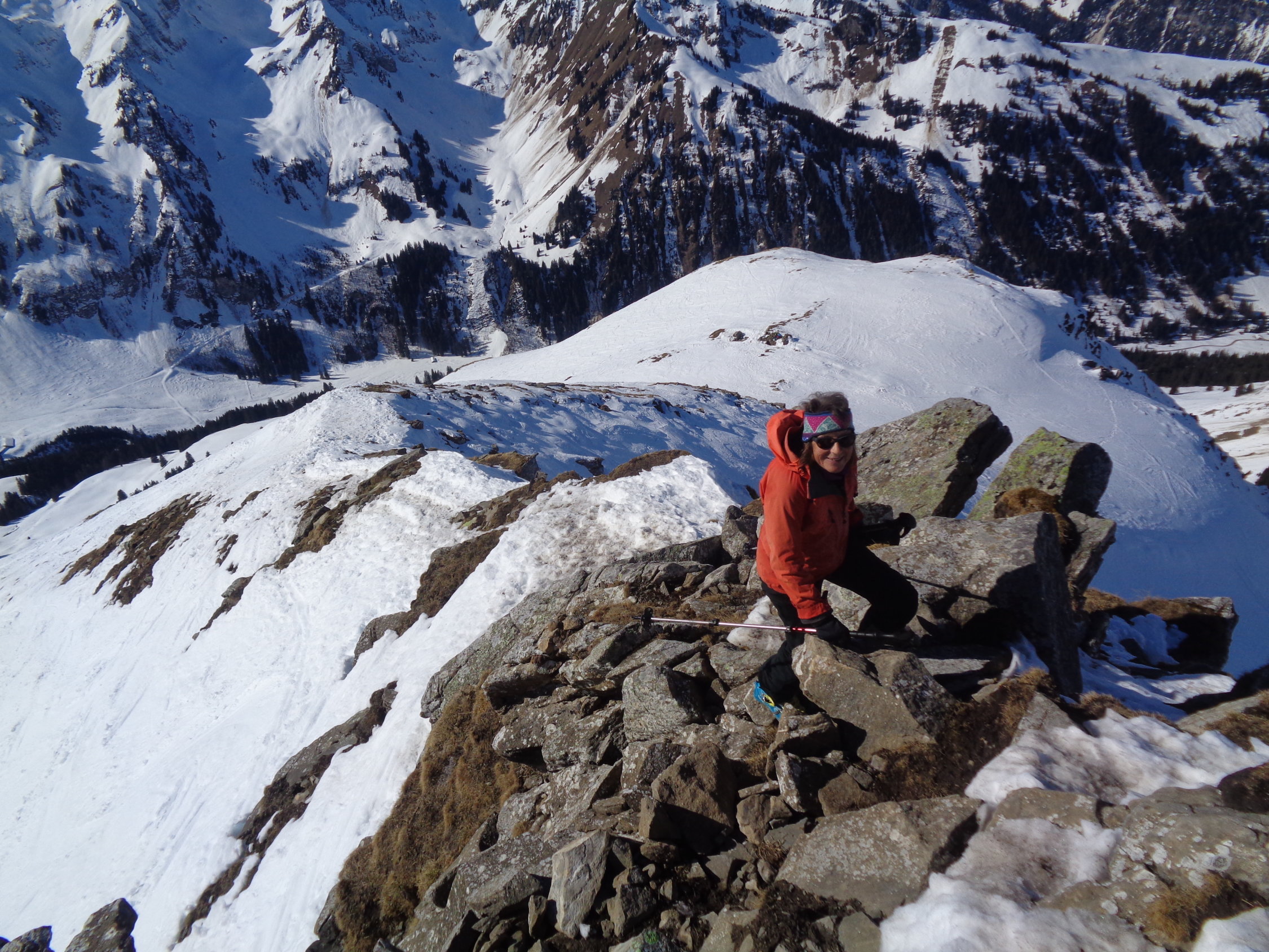 Im Aufstieg ab der Alphütte P.1947 Harscheisen montiert. Einzelne Stufen zum Gipfelkreuz sind bereits eisig und erfordern etwas Vorsicht, man ist dort doch schon ziemlich exponiert.