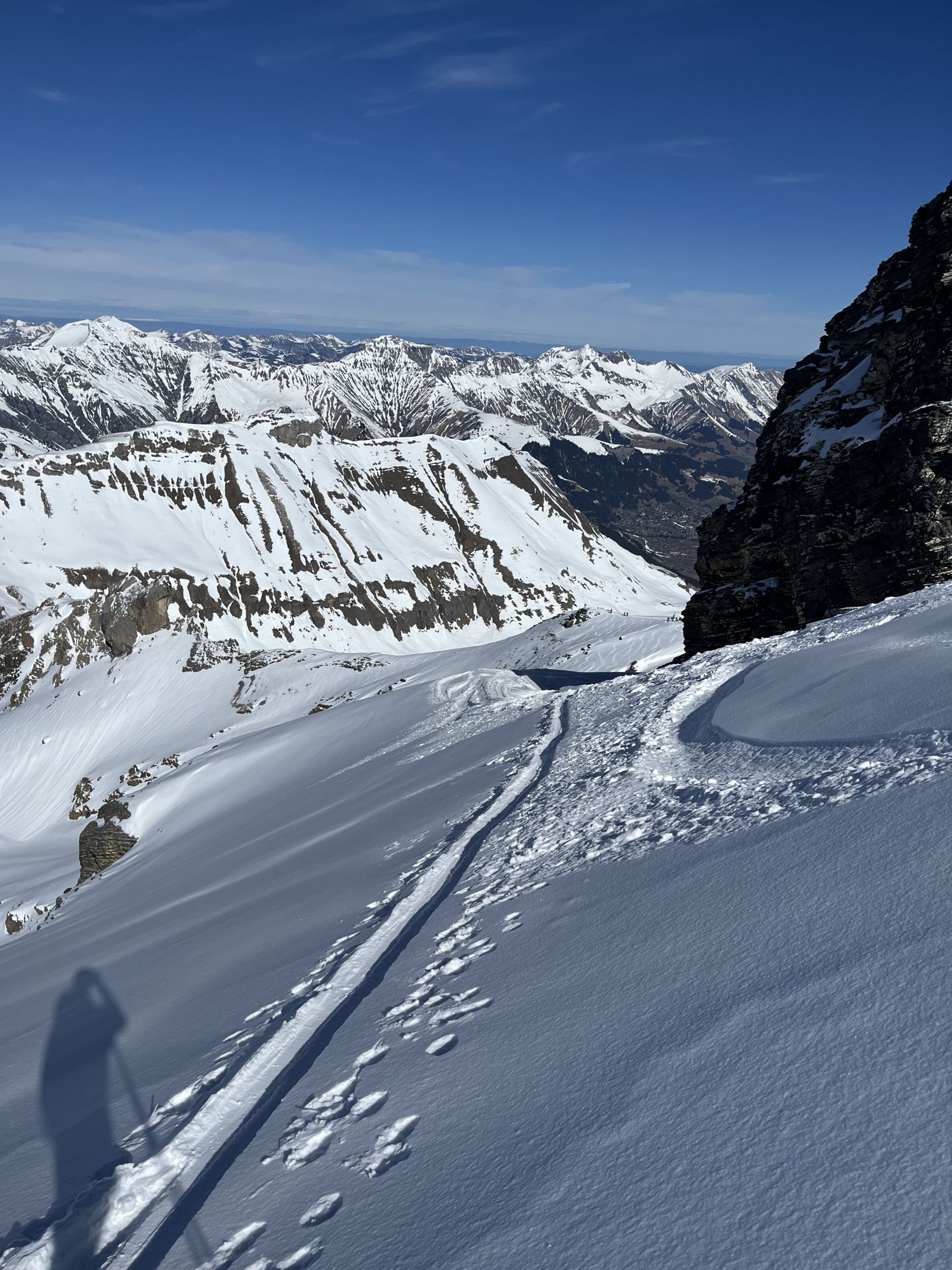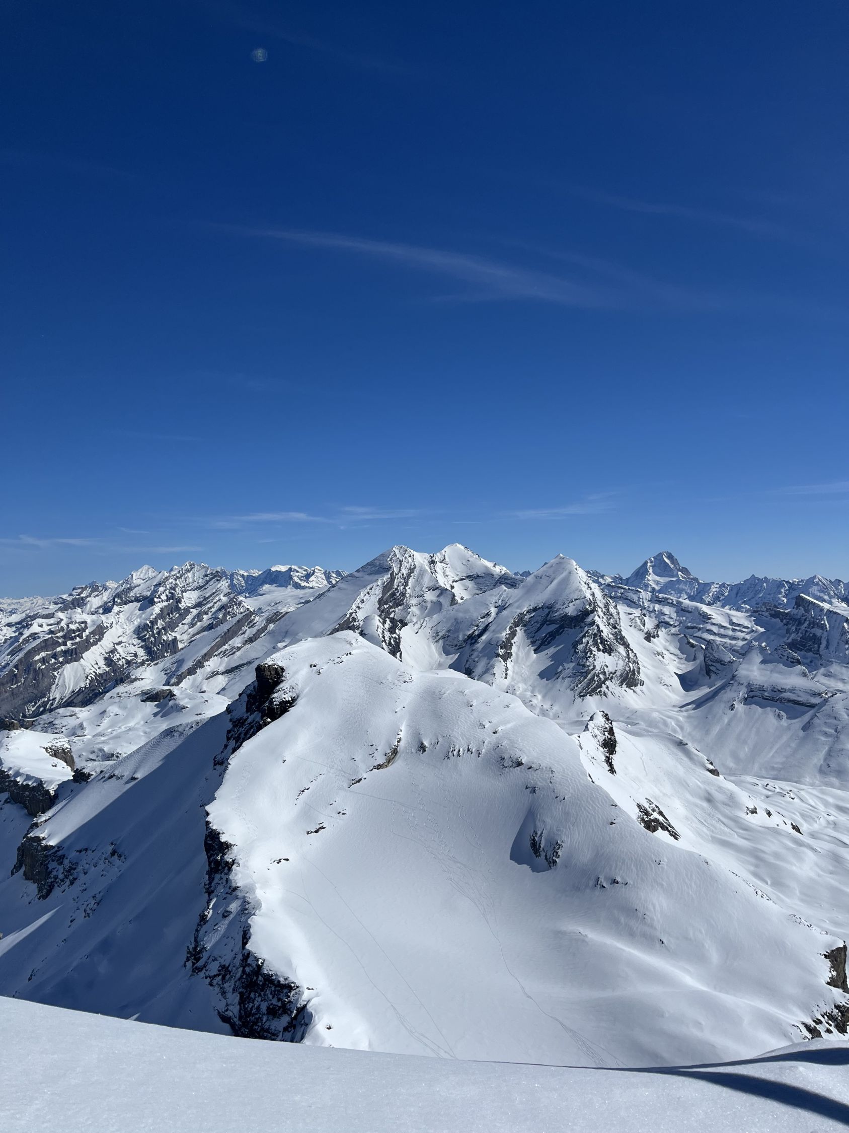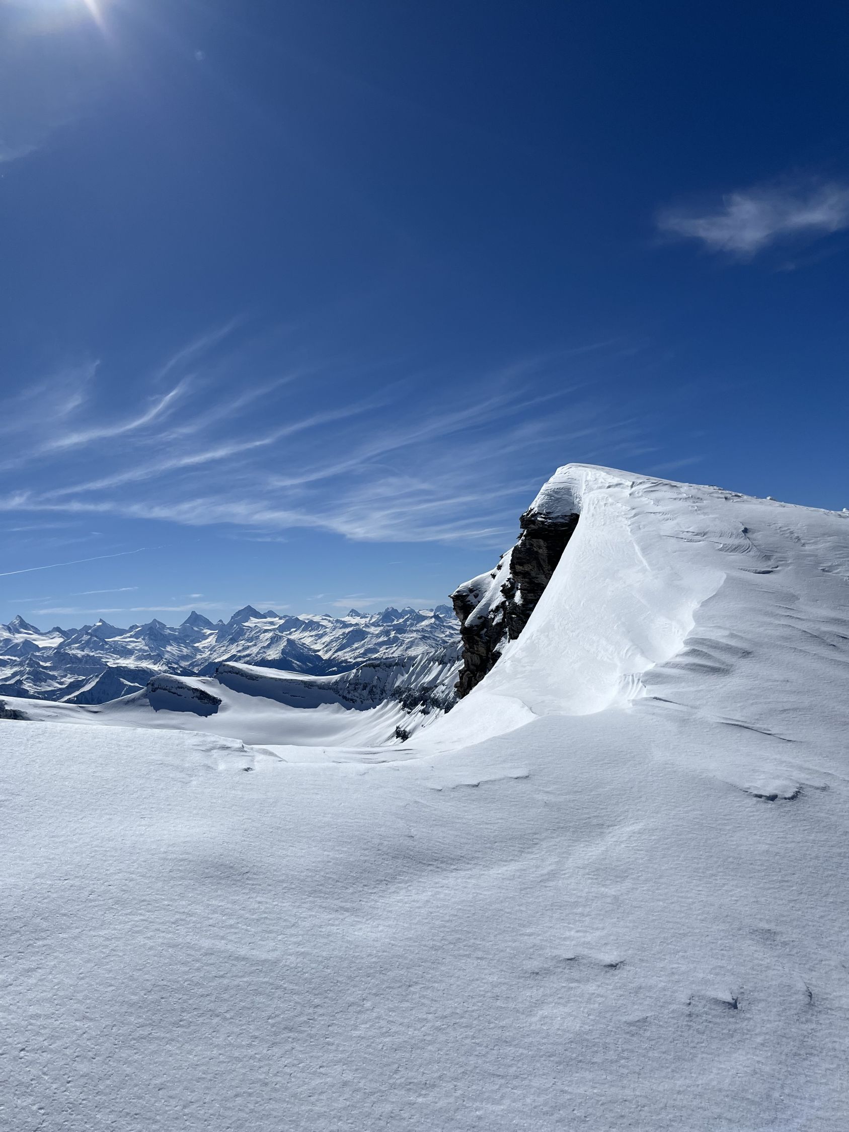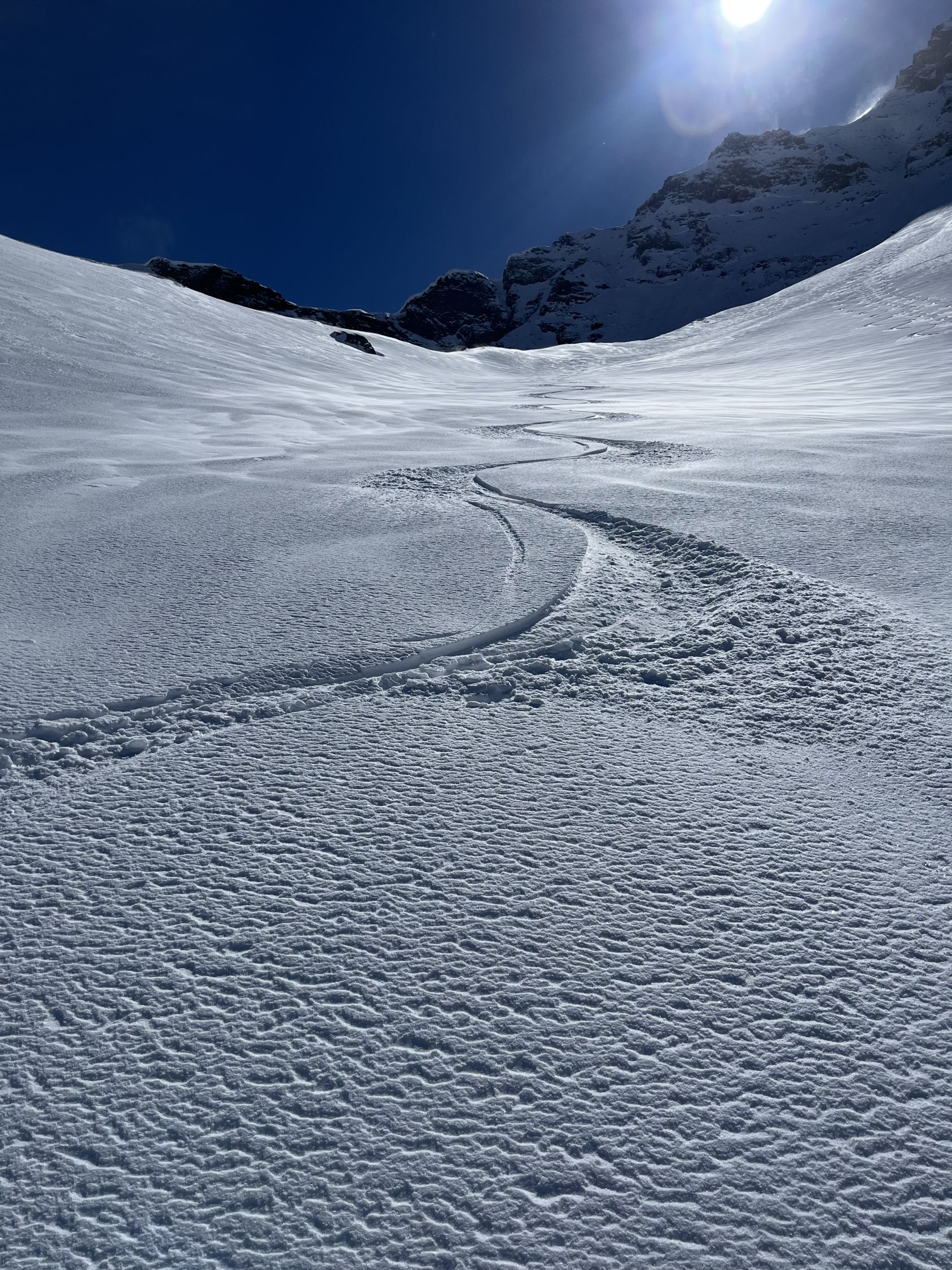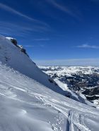 Um 8.45 Uhr auf die erste Bahn. Es hat schon auf der Engstligenalp 15 cm Neuschnee. Weiter oben ca. 25 -30cm frischer Pulver. Die Schneeverhältnisse waren bombastisch, Pulverschnee vom feinsten von oben bis unten. Beim Übergang zum Frühstückplatz hat es keine schöne Spur, nur um die Ecke. Beim Aufstieg müssen die Skier aufgebunden werden. Die Trittschneespur wird immer wieder vom Wind zugeweht. Steigeisen und Pickel sind hilfreich. Da es oben eine grosse Gwächte hat, haben Bergführer eine Trittschneespur um den Felsen gemacht. Wenn man sicher auf den Skier steht, kann man beim Frühstückplatz abfahren. Auf dem Gipfel war eine traumhafte Fernsicht. Der Wind war mässig. Es war einmal mehr eine wunderschöne Tour.