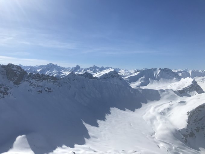 Abfahrt über N couloir noch lohnend. Mit guter Routenwahl findet man noch Pulverige Hänge. Teilw. Winddeckel.