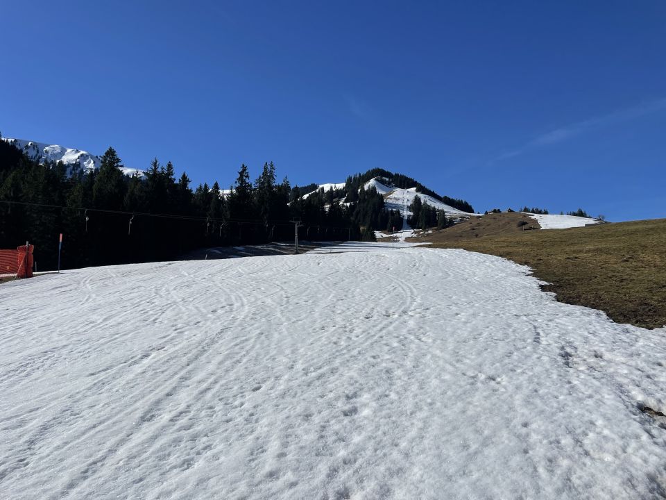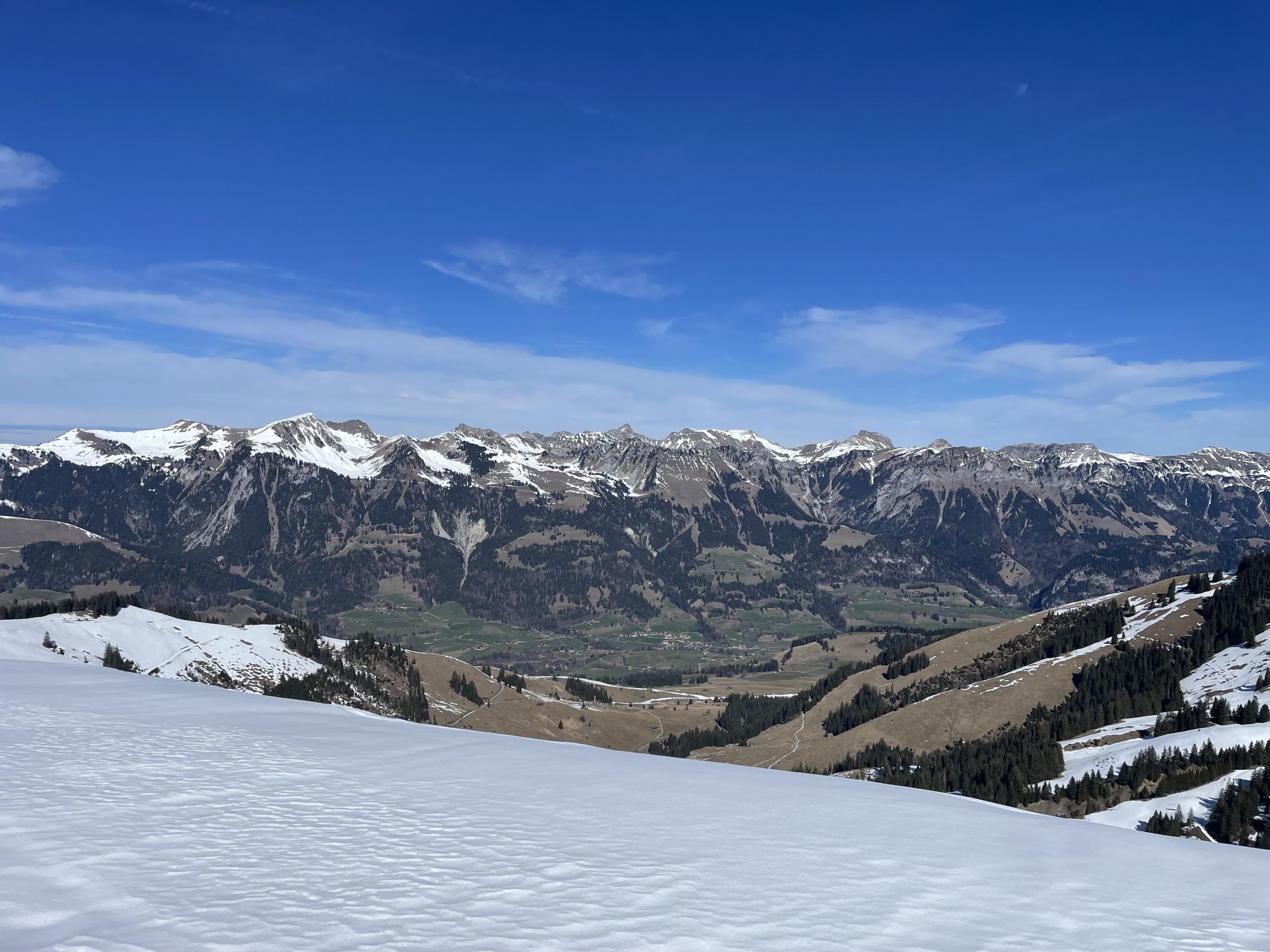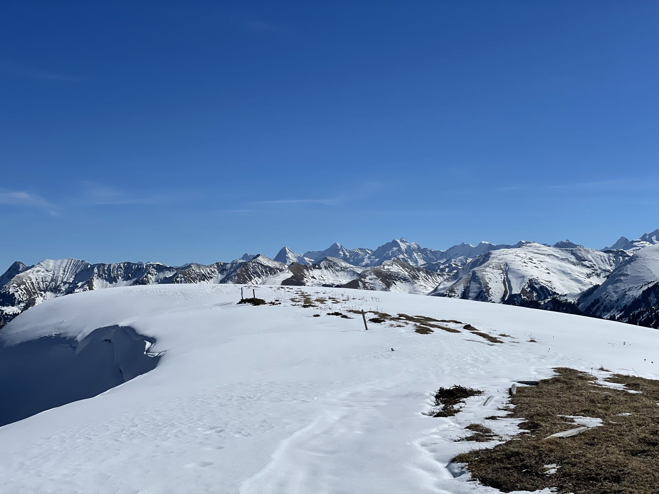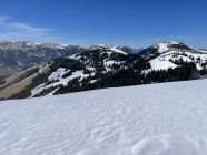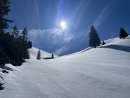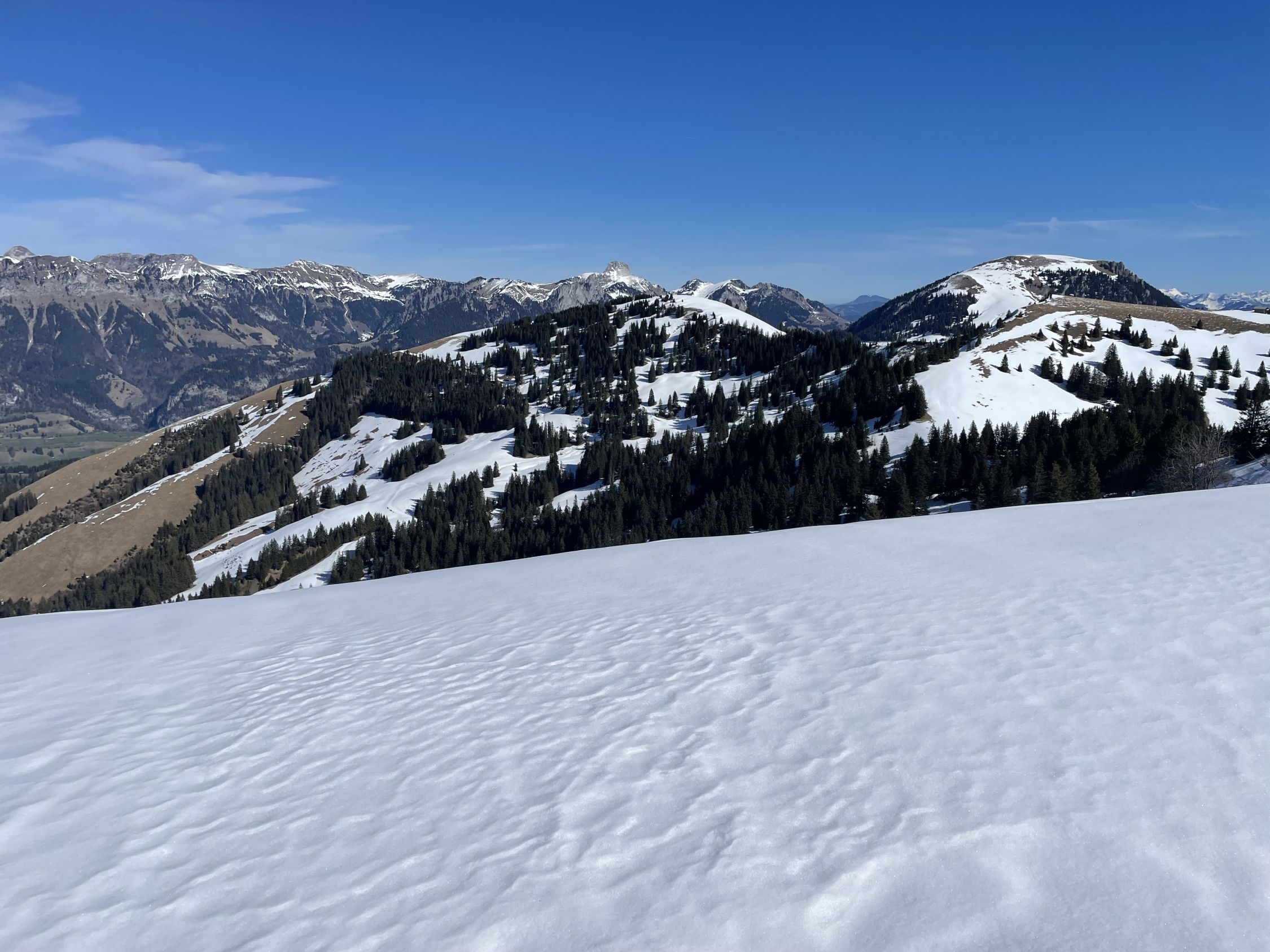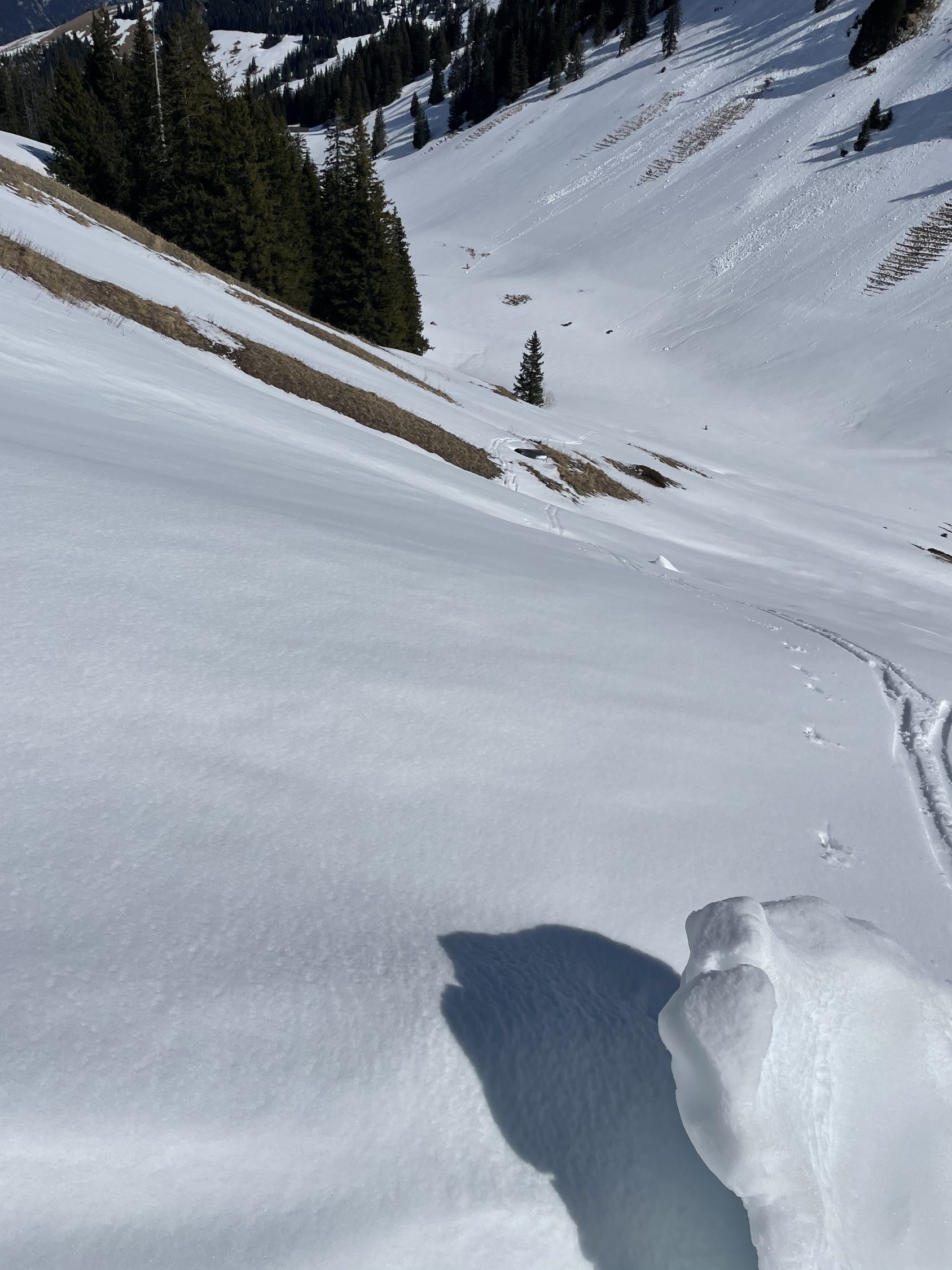 Das „ausgezeichnet“ versteht sich inklusive Tragestrecke, denn nach der Piste ist bis Schönebode aper. Im Gruebi geht es dann gerade so, dann rasch zunehmende Schneedecke. Schnee übrigens überall gut gefroren und auch oben in den Sonnenhängen umgewandelt. Weiterer Aufstieg ohne Probleme, ich musste oben kurz tragen, da sehr hart und ich harsteisenlos. Ich ging auf den von unten gesehen linken Gipfel, wo der Schnee völlig umgewandelt war. Abfahrt hier sehr schön, sodass ich nach den oberen Hängen nochmal in die Sonnenhänge Richtung Niederhorn aufstieg. So besserte ich die Böglibilanz weiter auf. Die weitere Abfahrt meist sehr schön, der lange Hang oberhalb Gruebi etwas holprig. Aber das ist Jammern auf hohem Niveau.