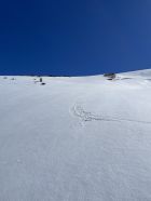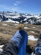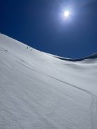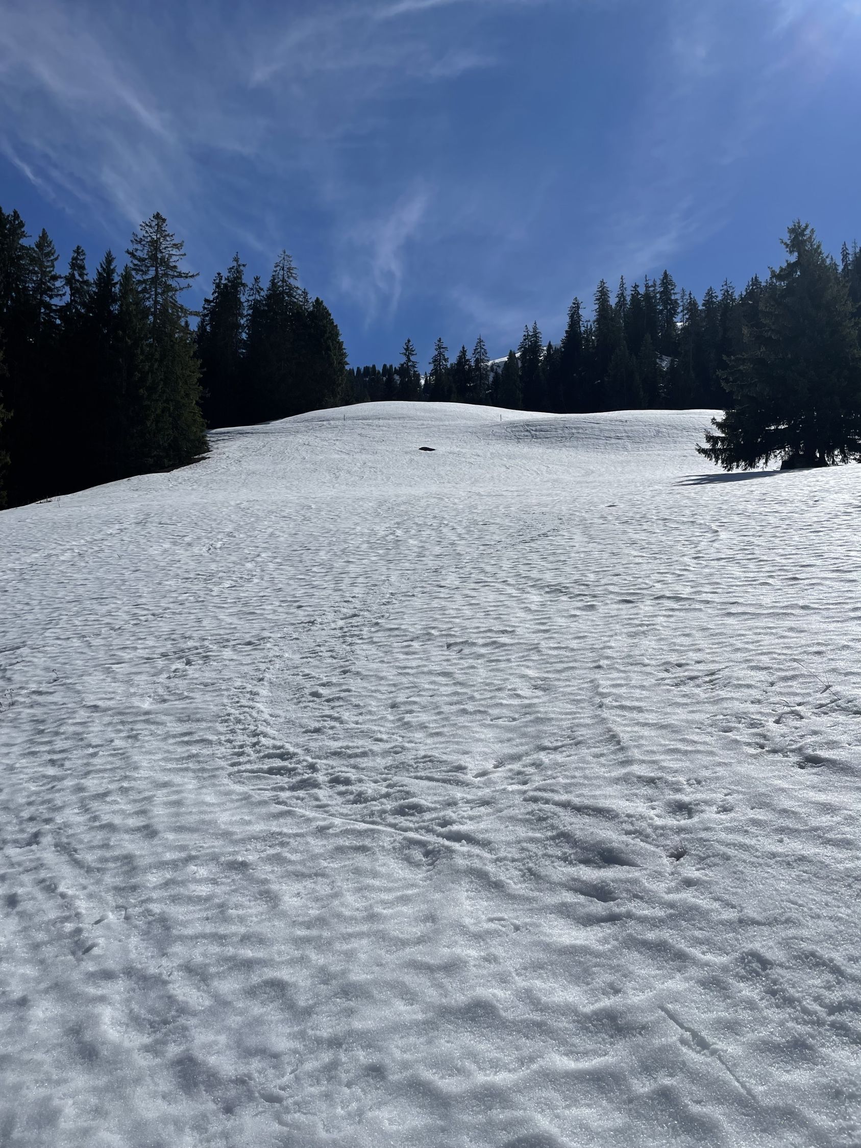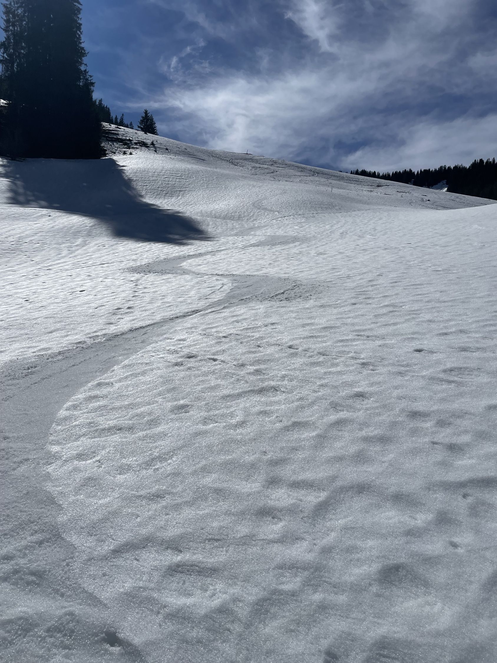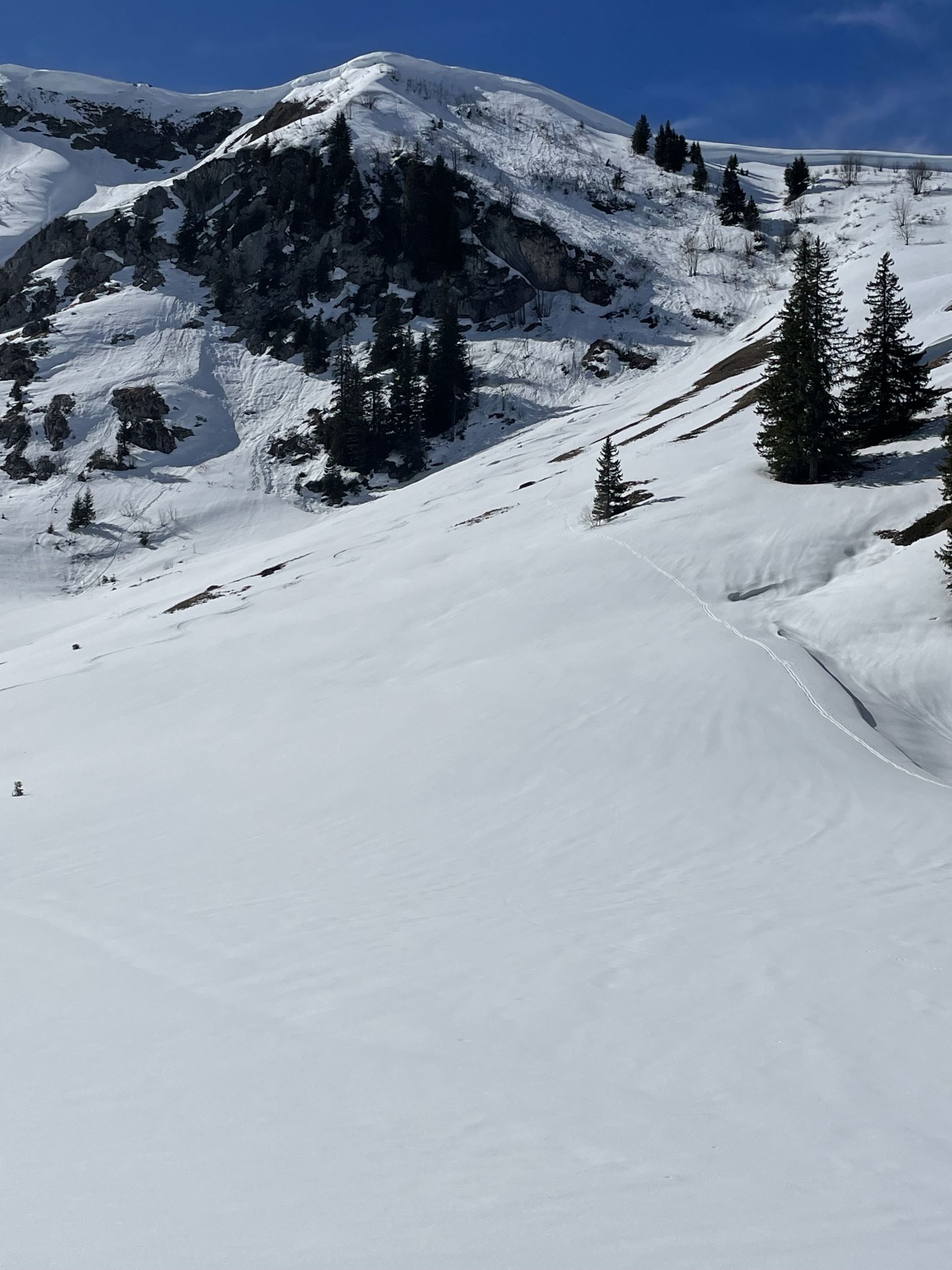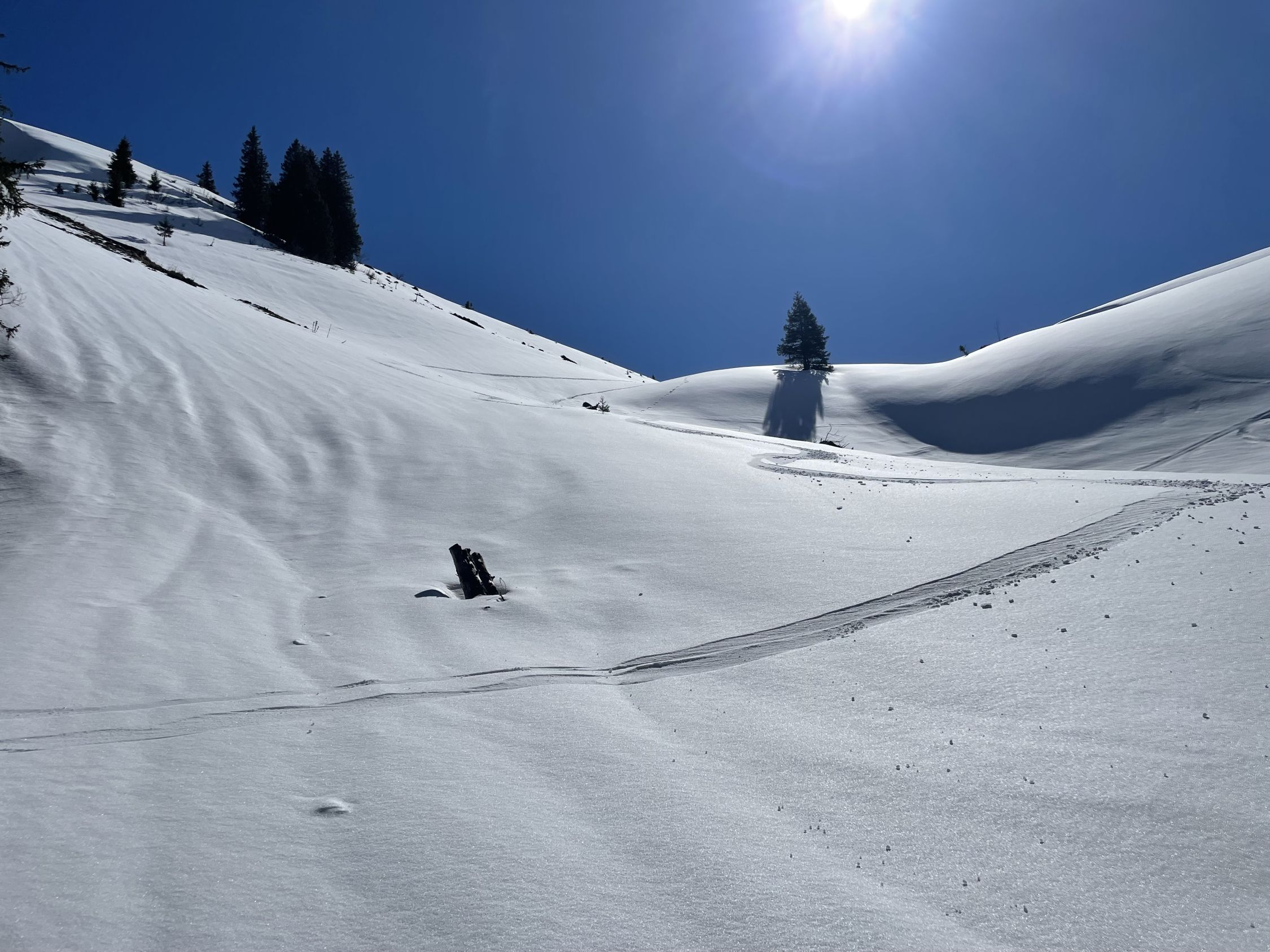 Das „ausgezeichnet“ versteht sich inklusive Tragestrecke, denn nach der Piste ist bis Schönebode aper. Im Gruebi geht es dann gerade so, dann rasch zunehmende Schneedecke. Schnee übrigens überall gut gefroren und auch oben in den Sonnenhängen umgewandelt. Weiterer Aufstieg ohne Probleme, ich musste oben kurz tragen, da sehr hart und ich harsteisenlos. Ich ging auf den von unten gesehen linken Gipfel, wo der Schnee völlig umgewandelt war. Abfahrt hier sehr schön, sodass ich nach den oberen Hängen nochmal in die Sonnenhänge Richtung Niederhorn aufstieg. So besserte ich die Böglibilanz weiter auf. Die weitere Abfahrt meist sehr schön, der lange Hang oberhalb Gruebi etwas holprig. Aber das ist Jammern auf hohem Niveau.