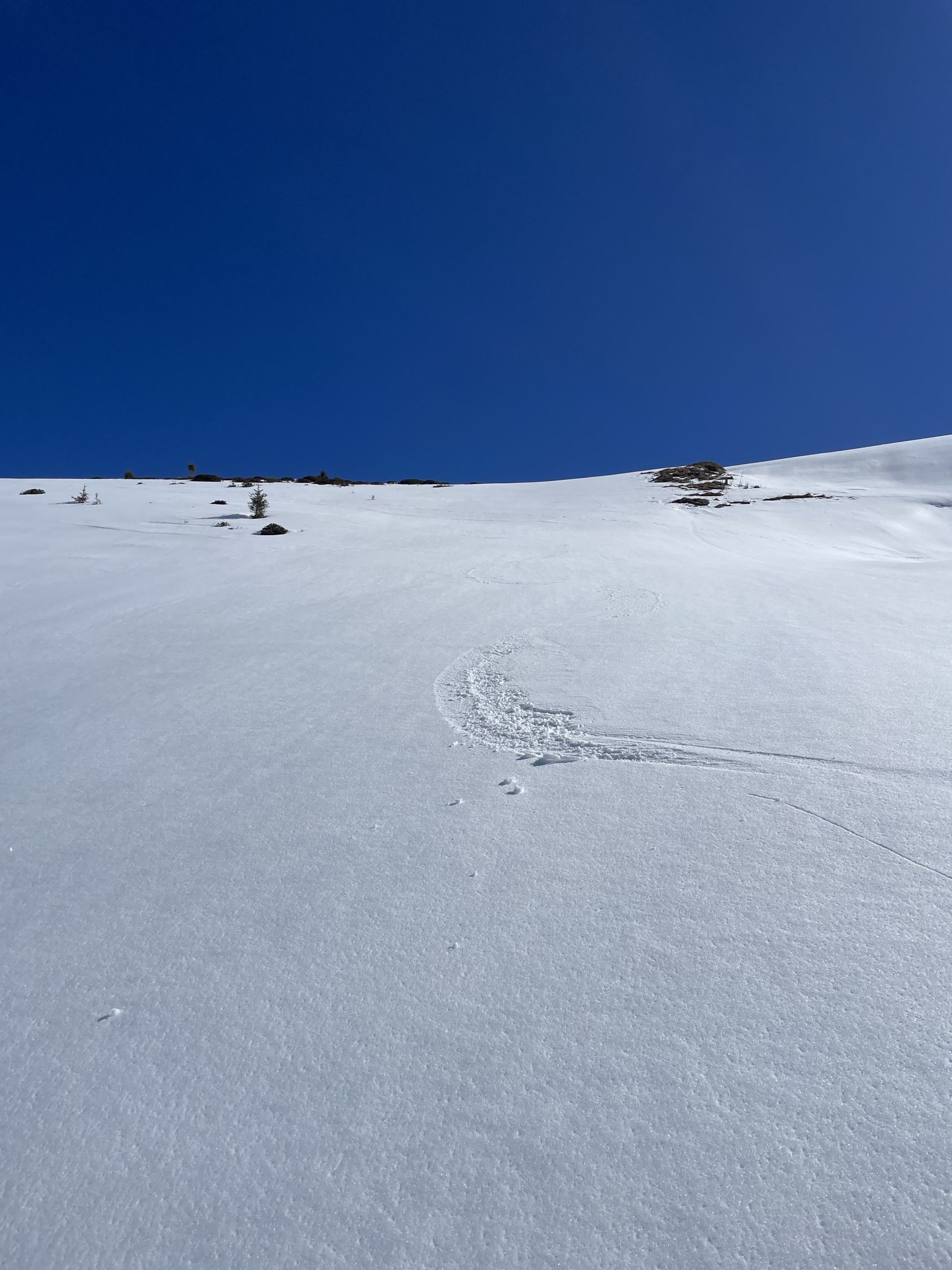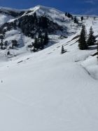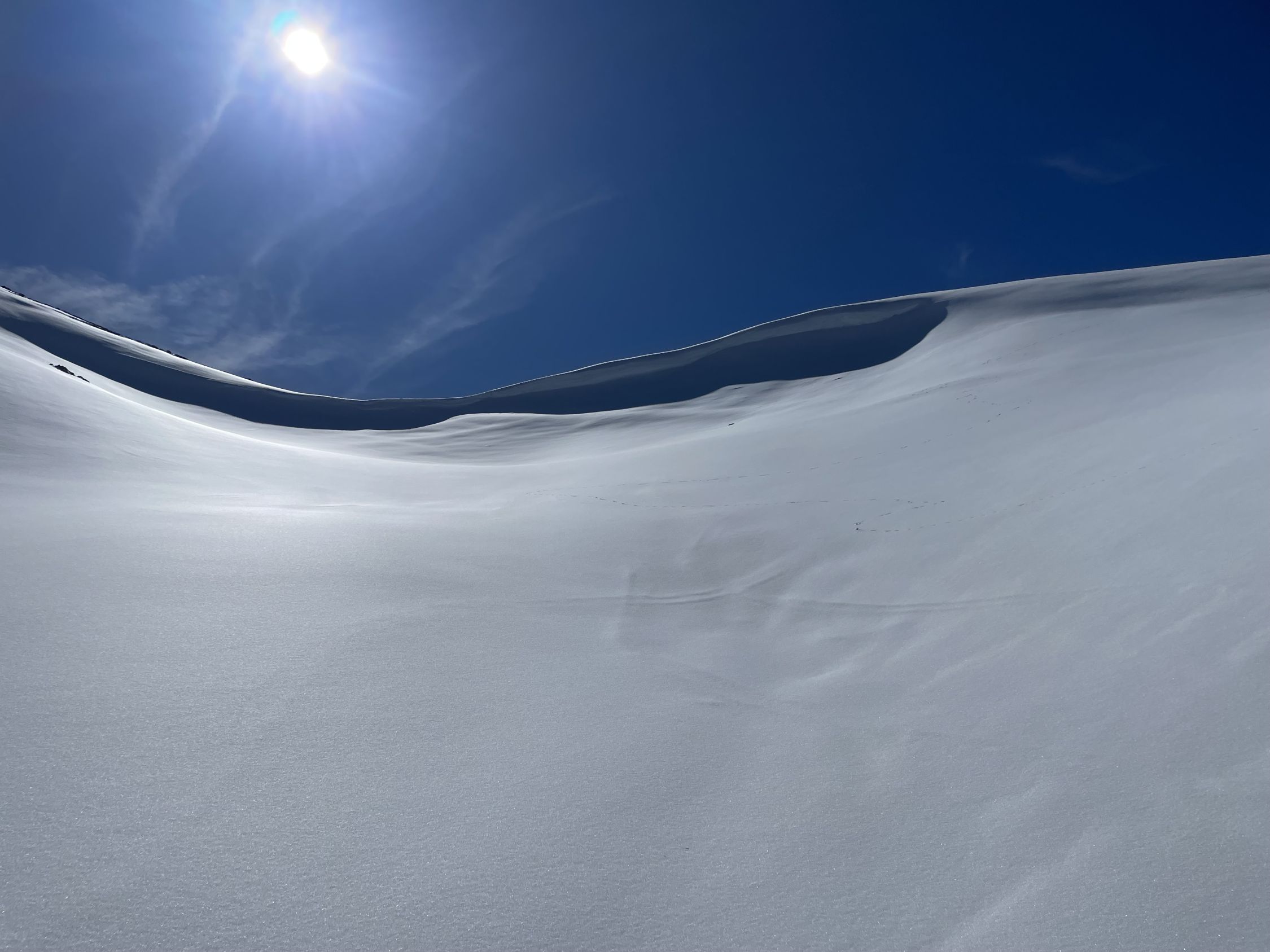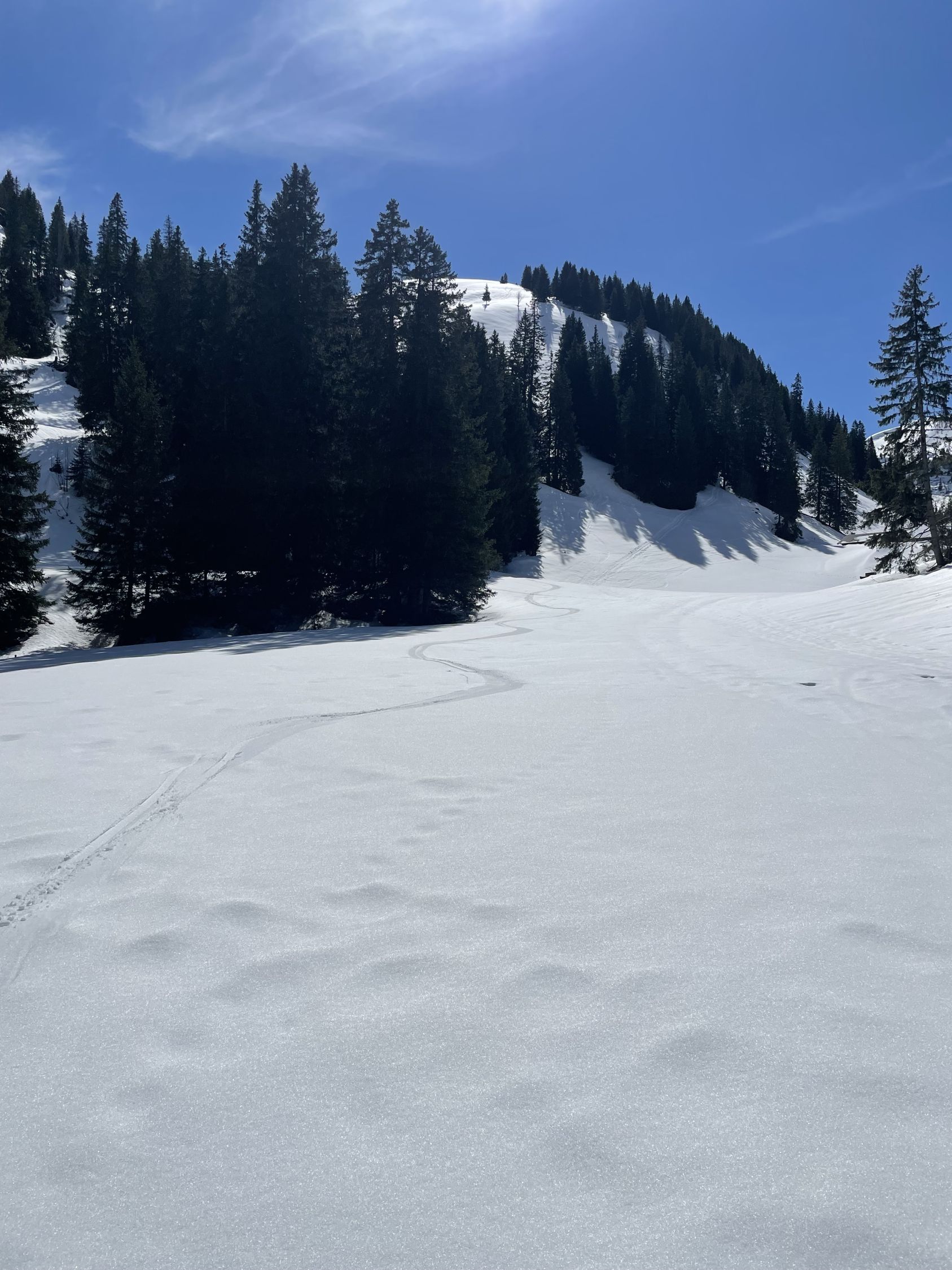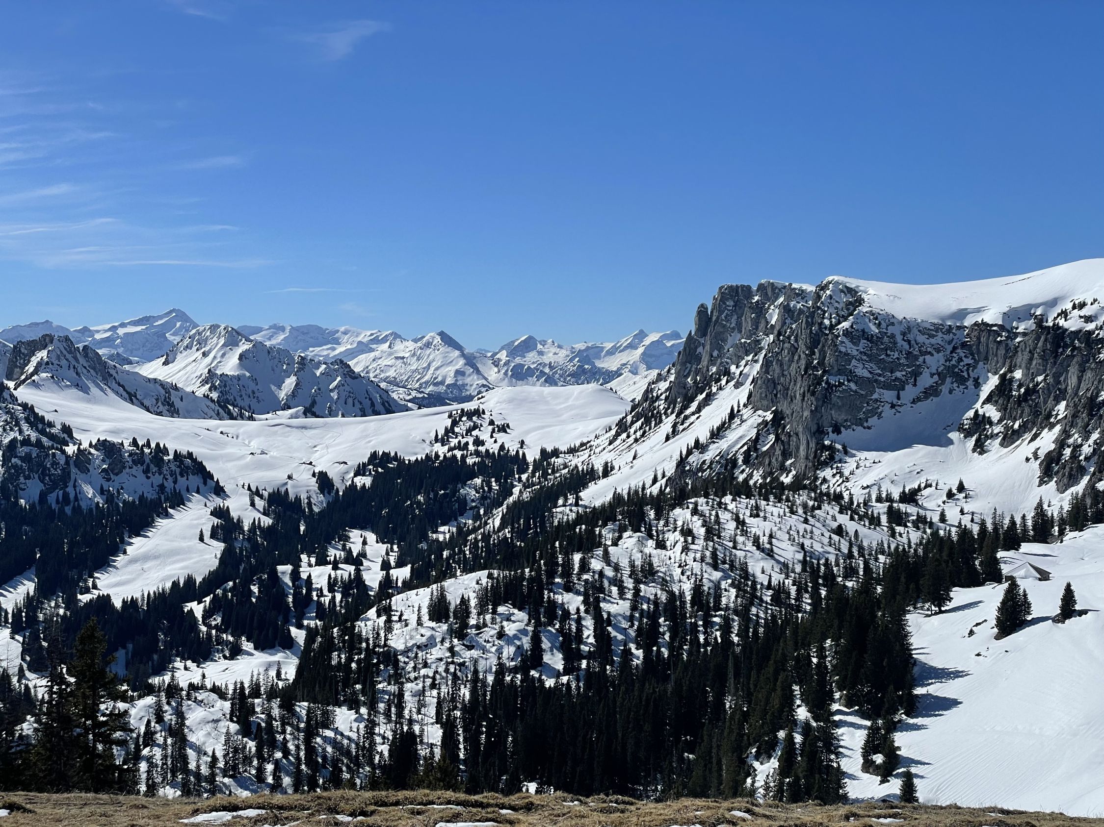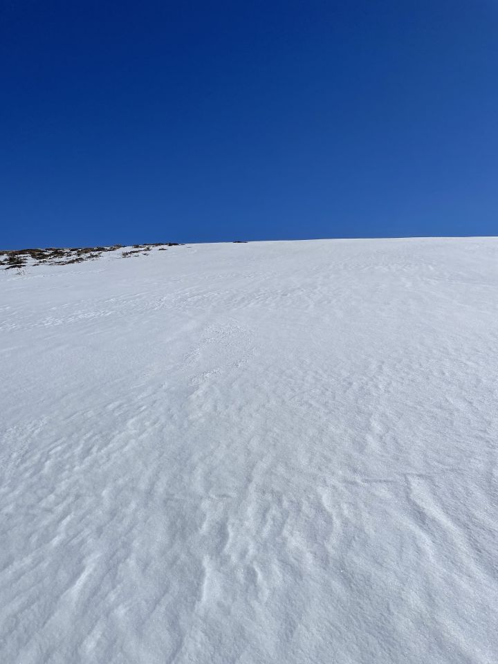 Das „ausgezeichnet“ versteht sich inklusive Tragestrecke, denn nach der Piste ist bis Schönebode aper. Im Gruebi geht es dann gerade so, dann rasch zunehmende Schneedecke. Schnee übrigens überall gut gefroren und auch oben in den Sonnenhängen umgewandelt. Weiterer Aufstieg ohne Probleme, ich musste oben kurz tragen, da sehr hart und ich harsteisenlos. Ich ging auf den von unten gesehen linken Gipfel, wo der Schnee völlig umgewandelt war. Abfahrt hier sehr schön, sodass ich nach den oberen Hängen nochmal in die Sonnenhänge Richtung Niederhorn aufstieg. So besserte ich die Böglibilanz weiter auf. Die weitere Abfahrt meist sehr schön, der lange Hang oberhalb Gruebi etwas holprig. Aber das ist Jammern auf hohem Niveau.