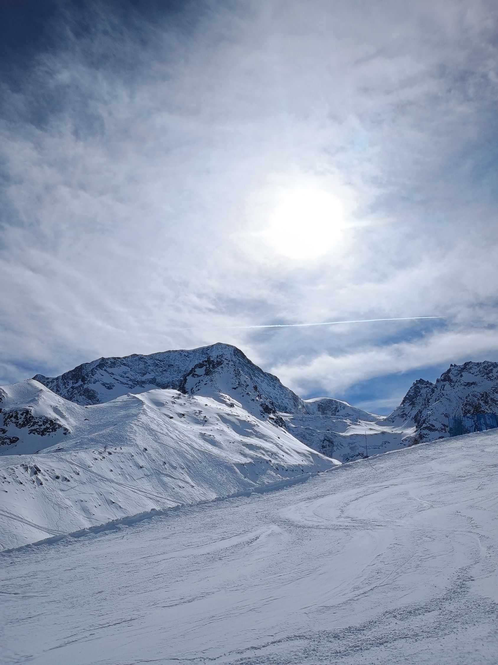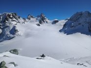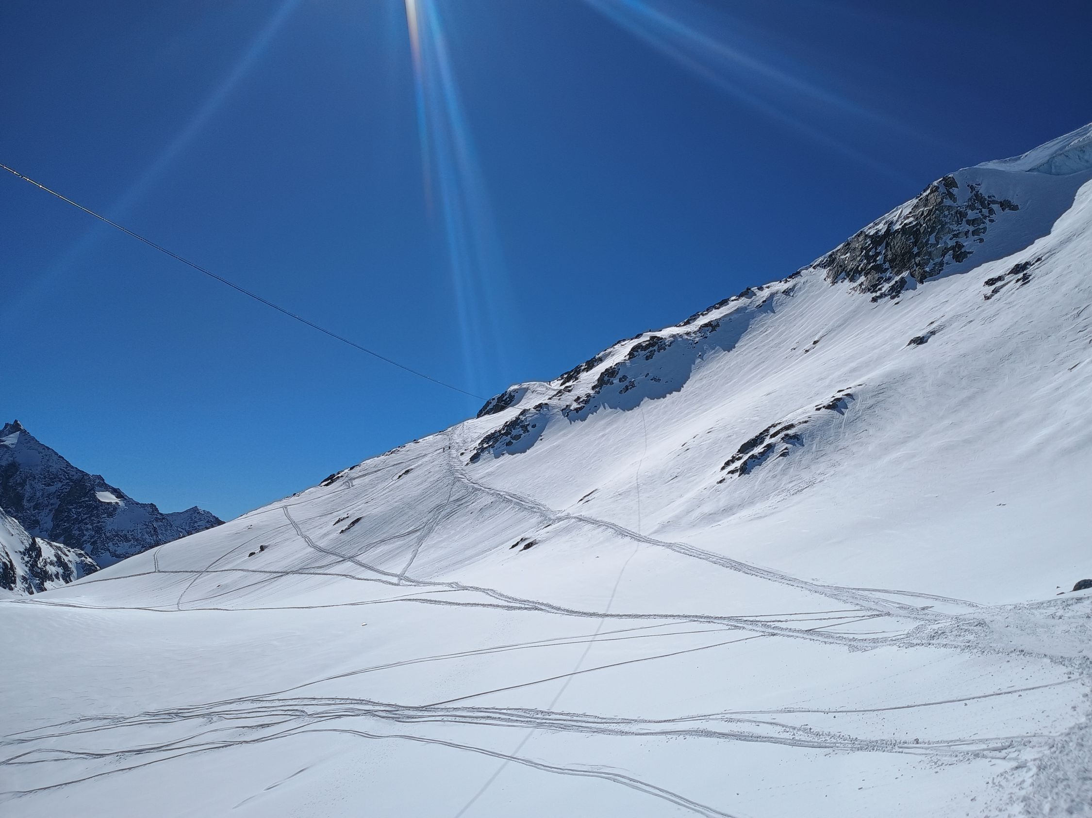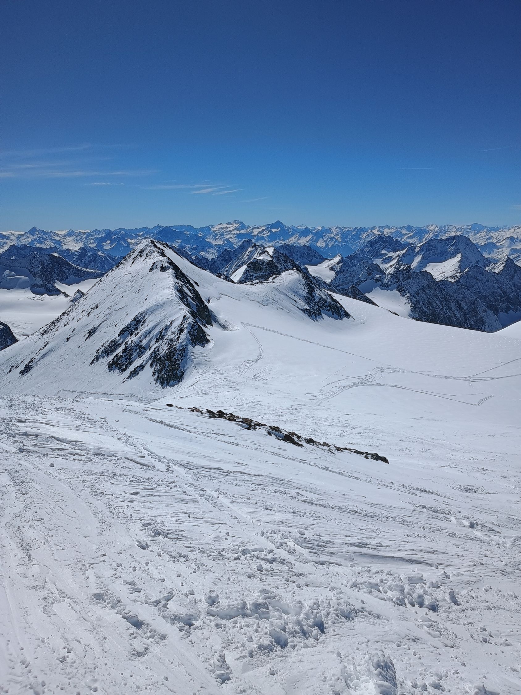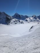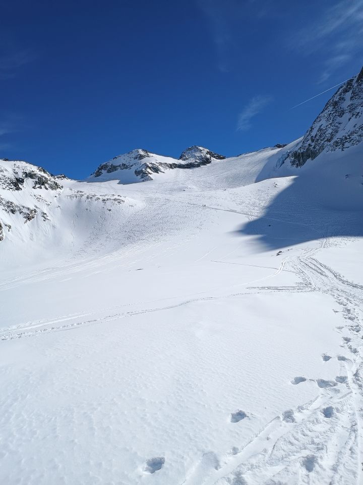 Pulver von oben bis unten, aber schon seeehr zerfahren. Wunderbare Aufstiegsspur vorhanden. Alle Gletscher sind sehr gut eingeschneit.