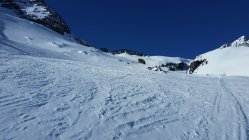 Abfahrt pistenähnlich. Ab und zu gab es eingeweihte Passagen ( ca. 5 cm auf der harten Unterlage), die sehr schön zu fahren waren.