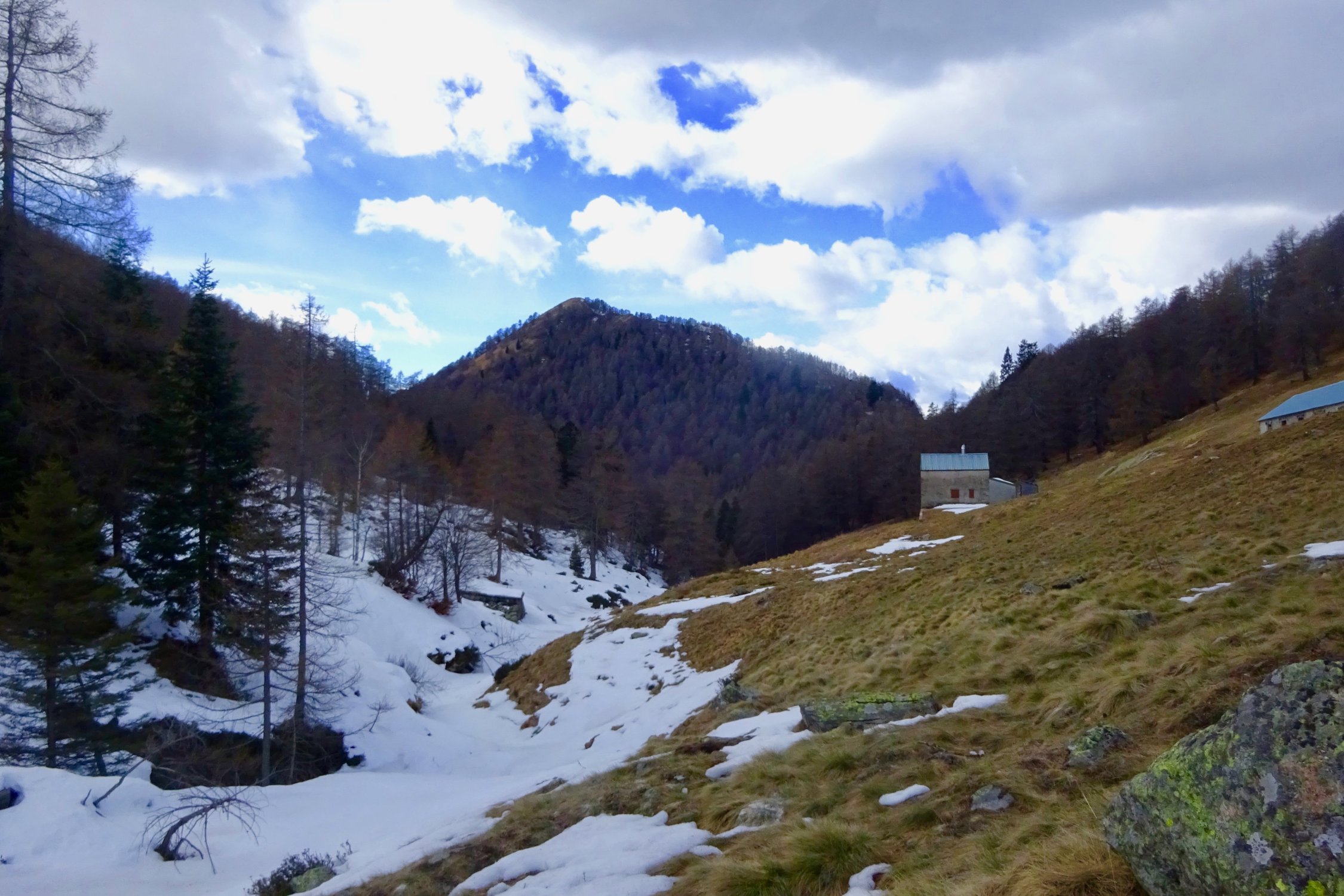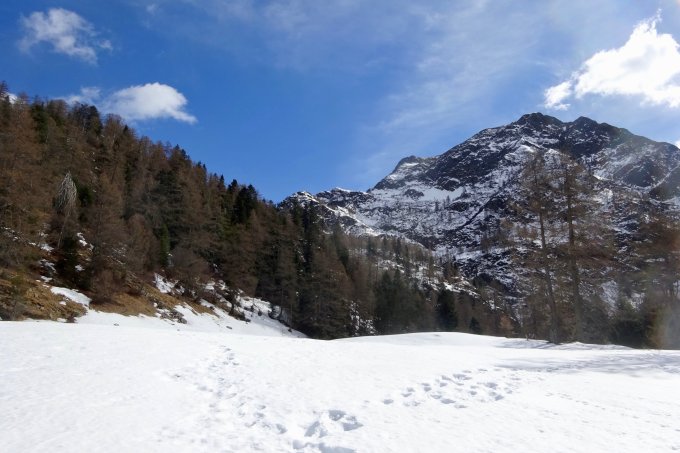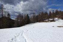 Da militärisch geübt wurde im Normalaufstieg, konnten die normalerweise auch bei - wie momentan - wenig Schnee nützlichen Schattenschneeresten auf dem Alpsträsschen zur Alpe di Serdena nicht genutzt werden. Das Militär hat mich auf den Sommerweg umgeleitet, wo der erste Schnee erst ab 1100 m und danach erst wieder durchgehend ab 1400 m anzutreffen war.