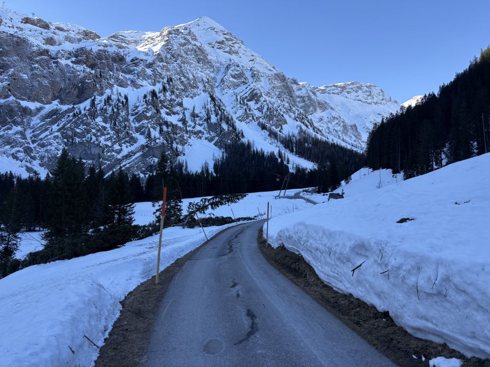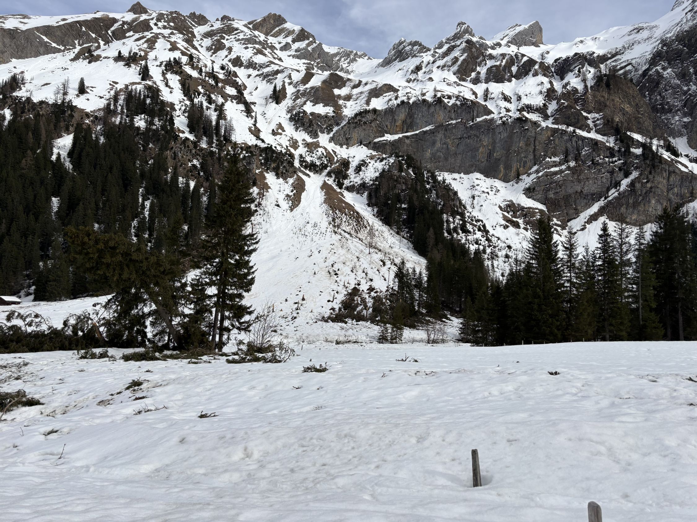 Es muss diesen Winter eine grosse Staublawine vom Laufbödne runtergekommen sein, welche einige Bäume geknickt hat und das bis zur Strasse kurz vor der Seilbahn hin (vgl. 1. Photo und 3. persönliches Bild).