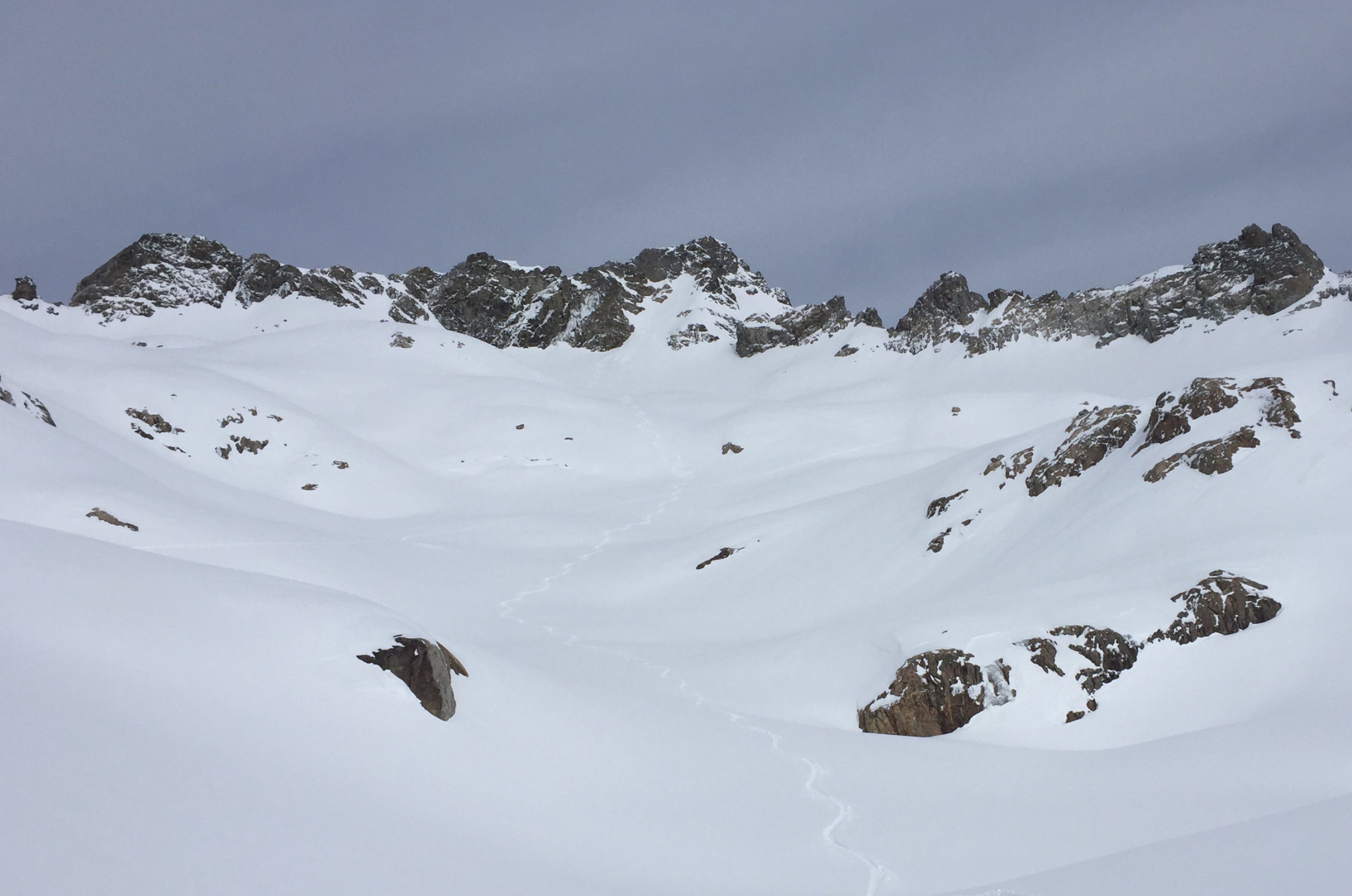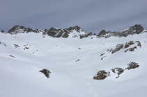 20 - 50cm Pulver gespurt. teilweise leichter Winddeckel. Gipfel mit Steigeisen problemlos. Abfahrt: Gipfelhang perfekt, 50cm stiebender Pulver. Gegen unten weniger, aber bis zur Waldgrenze gut. Unterhalb pappig.