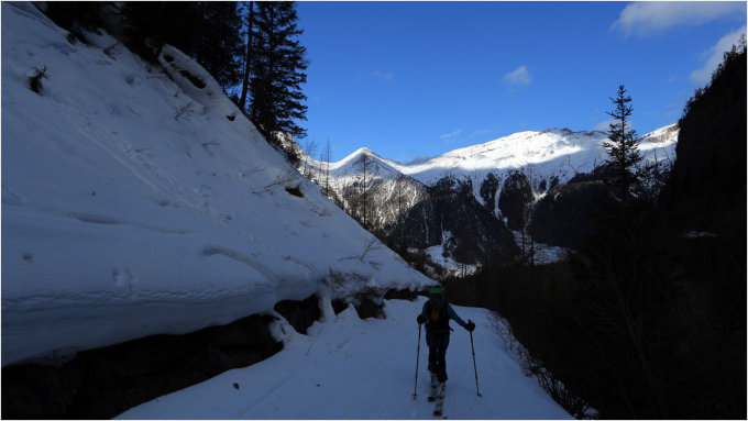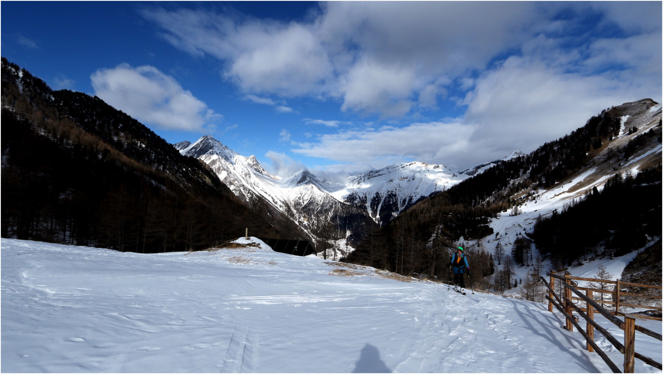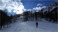 Die Abfahrt war dann besser als gedacht, die ersten 150Hm noch recht verblasen dann harschig aber griffig. Danach ca 500hm dichter Pulverschnee bis zum Beginn der Almstrasse. Auf dieser dann auf gut tragender Schneedecke recht entspannt ins Tal.