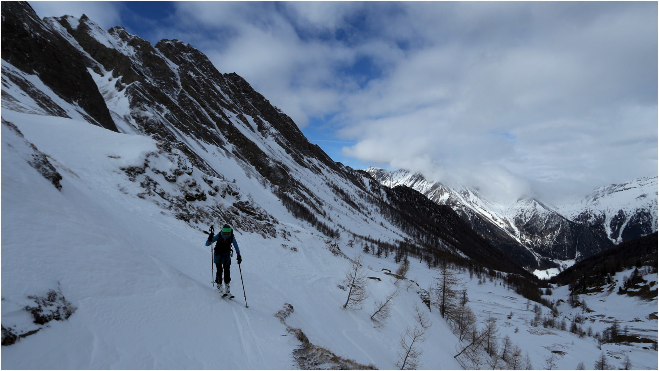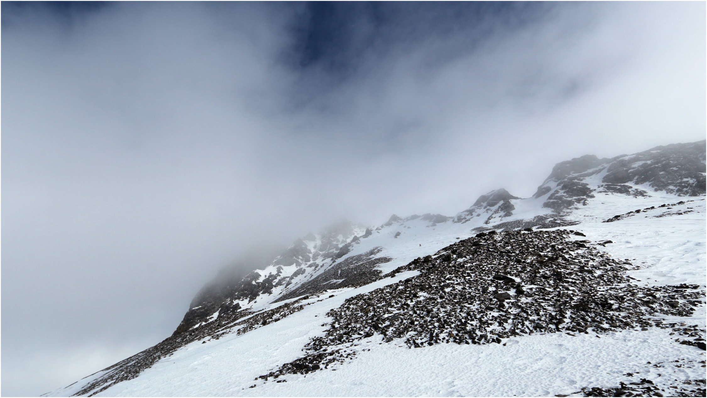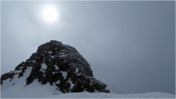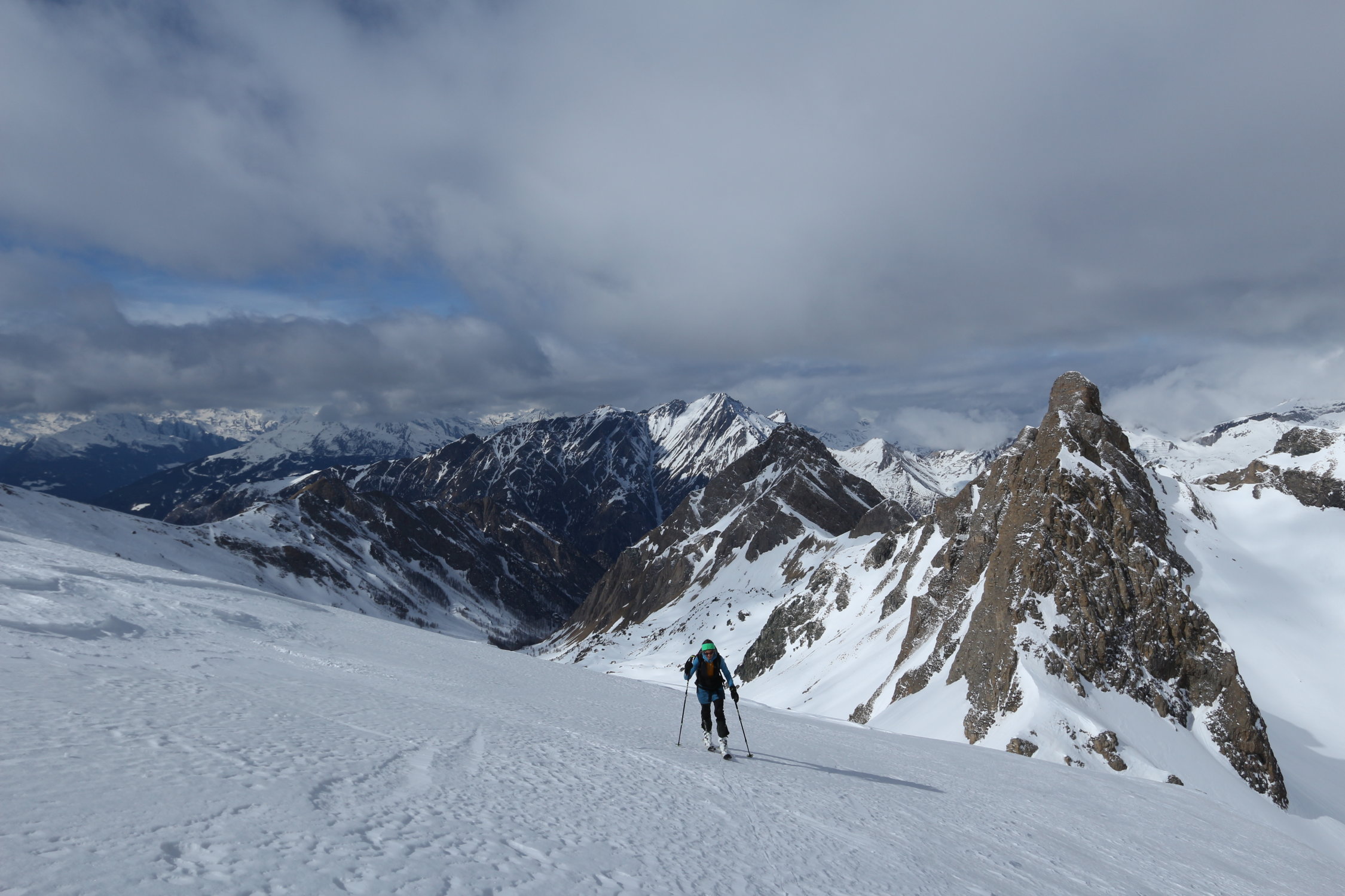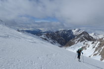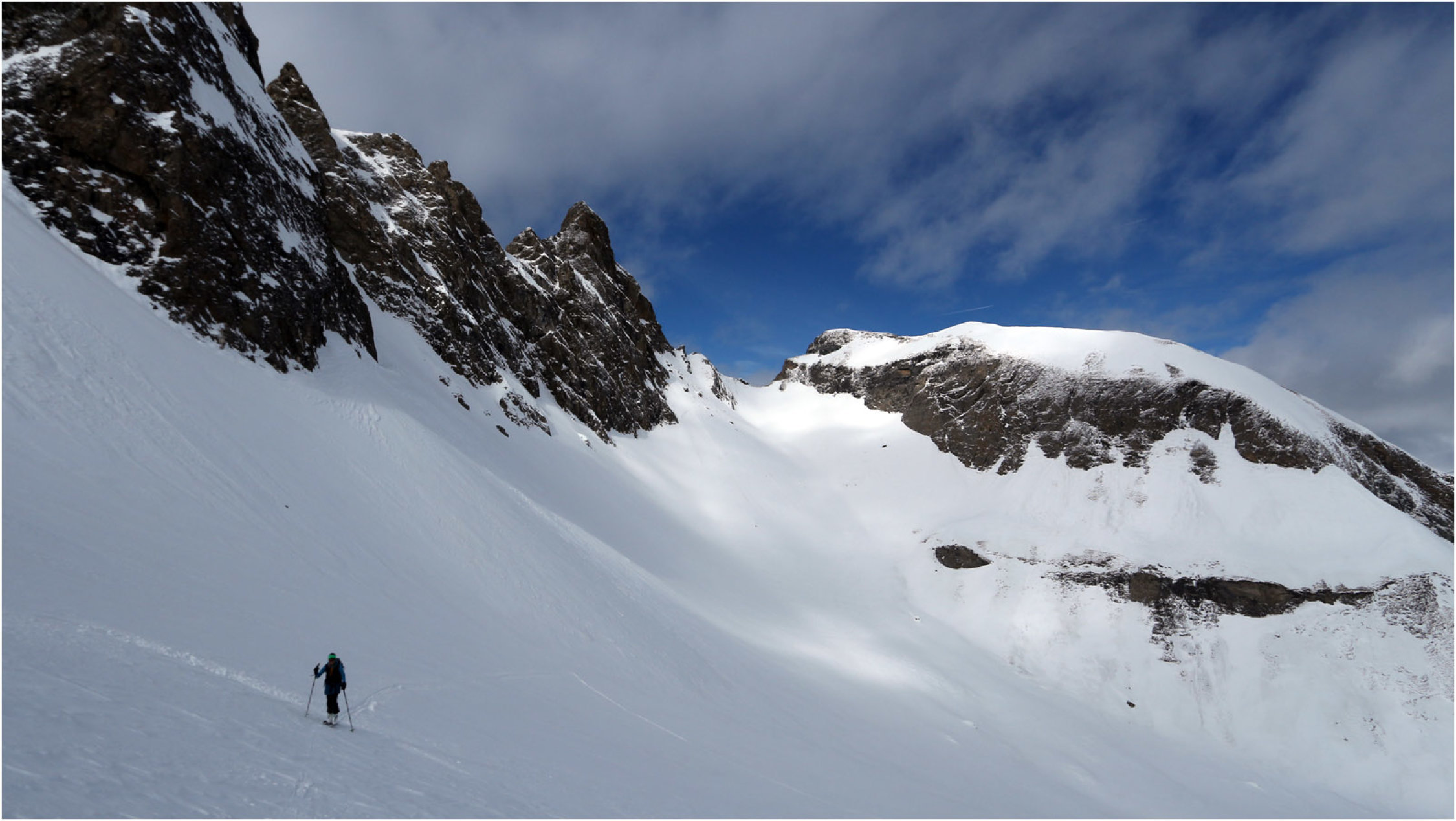 Wie nicht anders erwartet keine optimalen Verhältnisse. Es hat einfach fast 4 Wochen nicht geschneit, entsprechend ist alles verblasen sobald man aus dem Wald herauskommt. Ab Waldgrenze deshalb mehrheitlich hart gebügelt, teilweise mit ein wenig Neuschnee drauf. Ab etwa 2500m zunehmend harschig, stellenweise eisig und zwischendurch grosse Windgangeln. Harscheisen sind aktuell kein Luxus. Ab Skidepot dann wiederrum recht gute Bedingungen, Steigeisen werden aus meiner Sicht derzeit nicht benötigt.