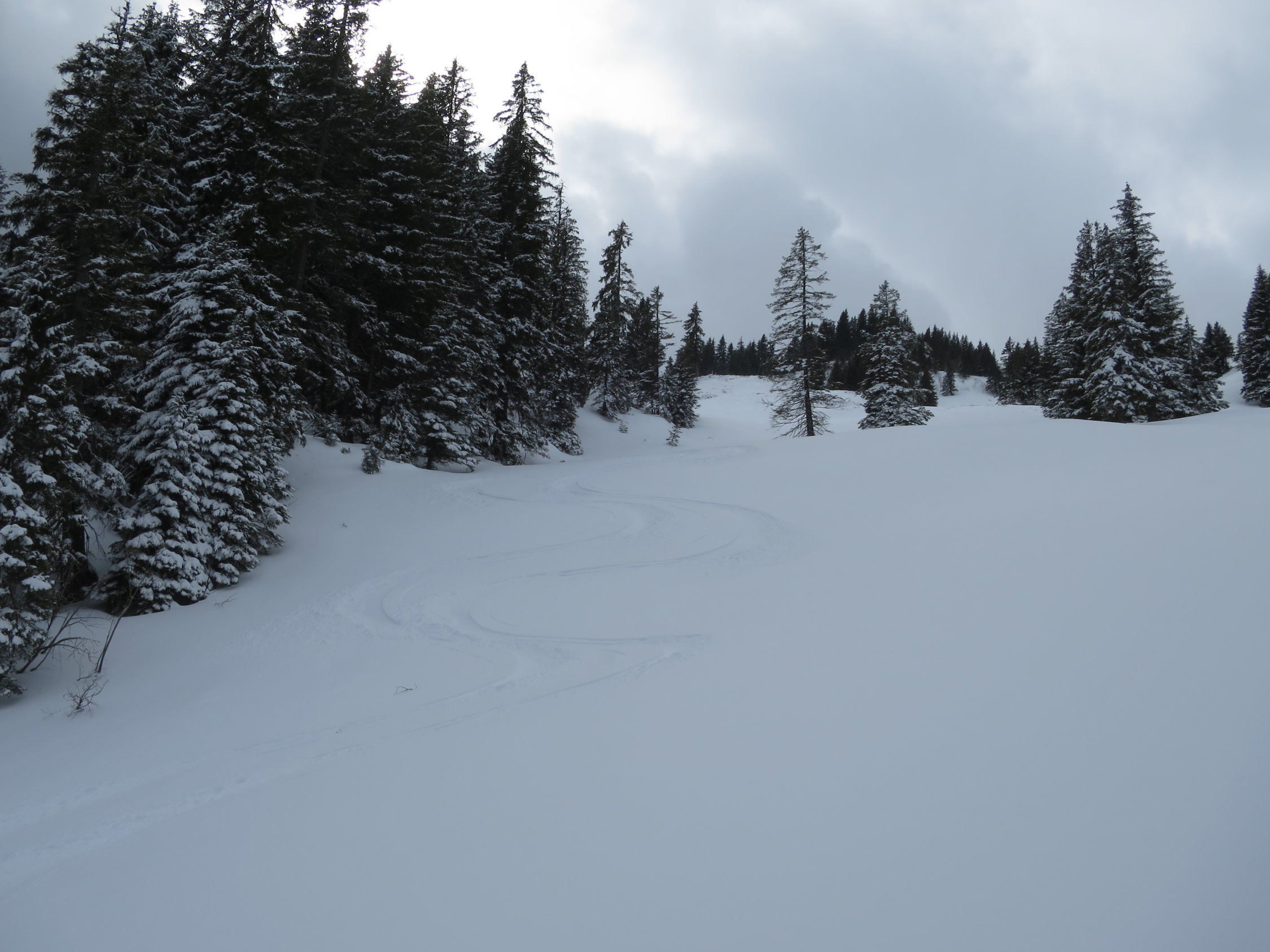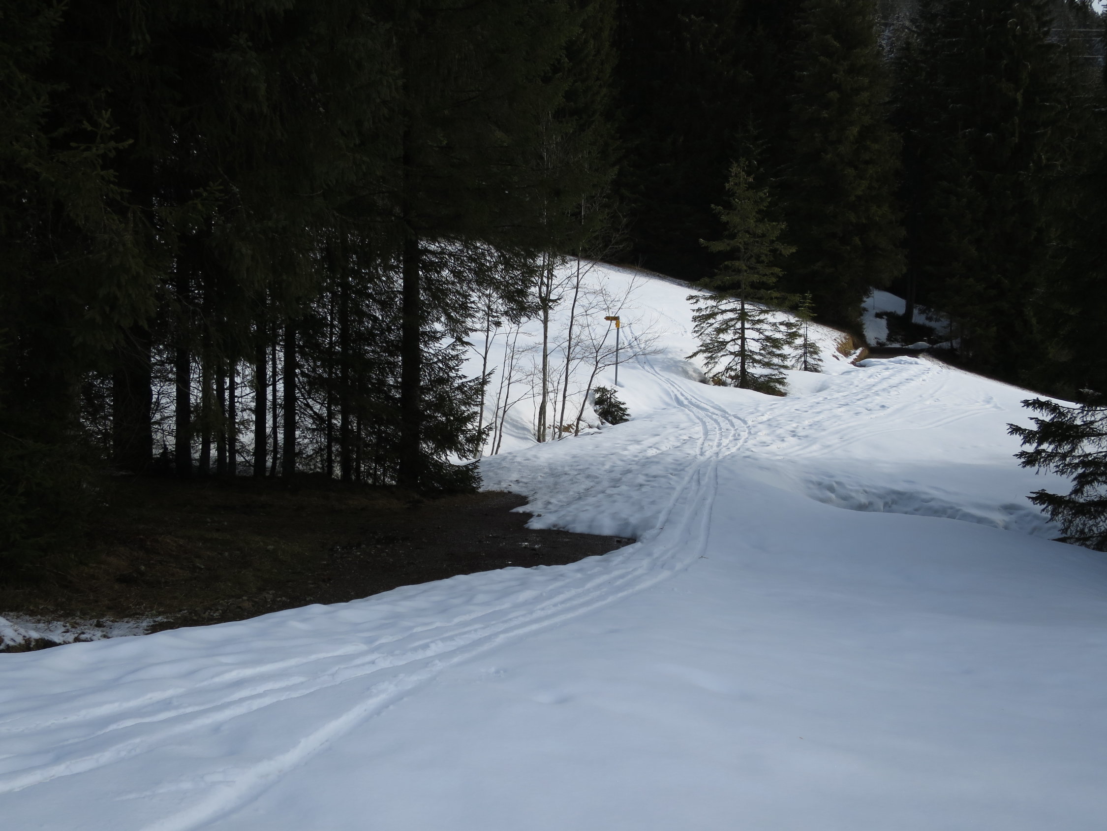 Die Abfahrt vom Parkplatz bis Ochsenalp ist erstaunlich gut gegangen – trotz der Südexposition liegt noch gerade genug Schnee und bei einer richtigen Routenwahl kann man sogar ein paar gute Schwünge machen.