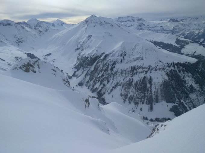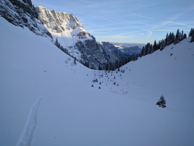 Der Neuschnee hat sogar die Grimmialp knapp erreicht. Im Würziwald 5, in der Wildgrimmi 10-15cm Pulver auf harter Unterlage. Deswegen konnte ich die Spur in den steileren Stücken leider nicht steiler legen.