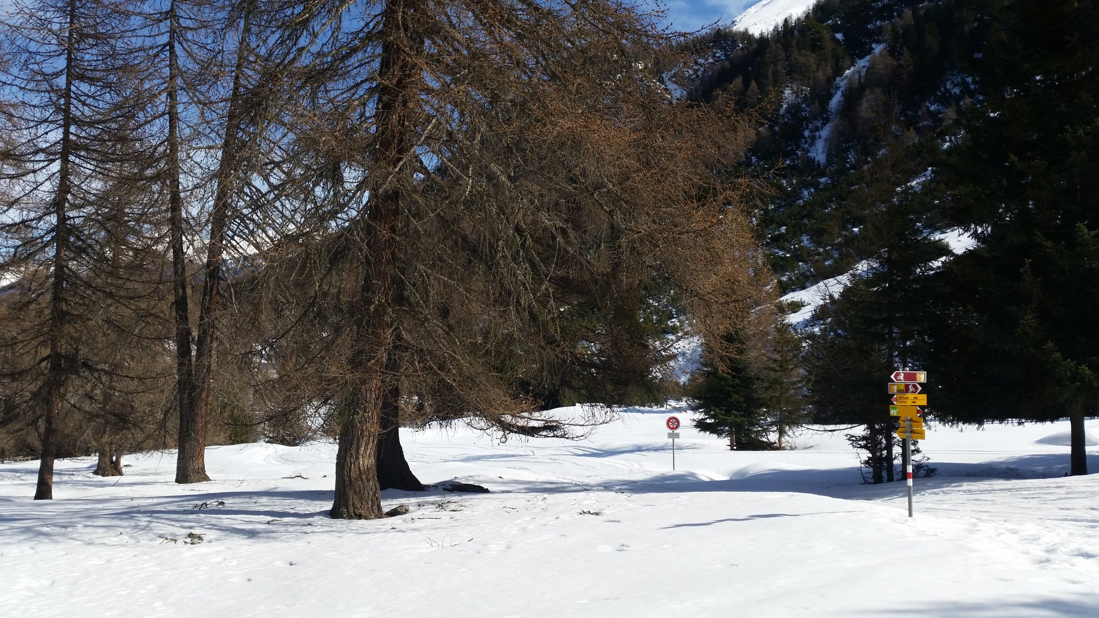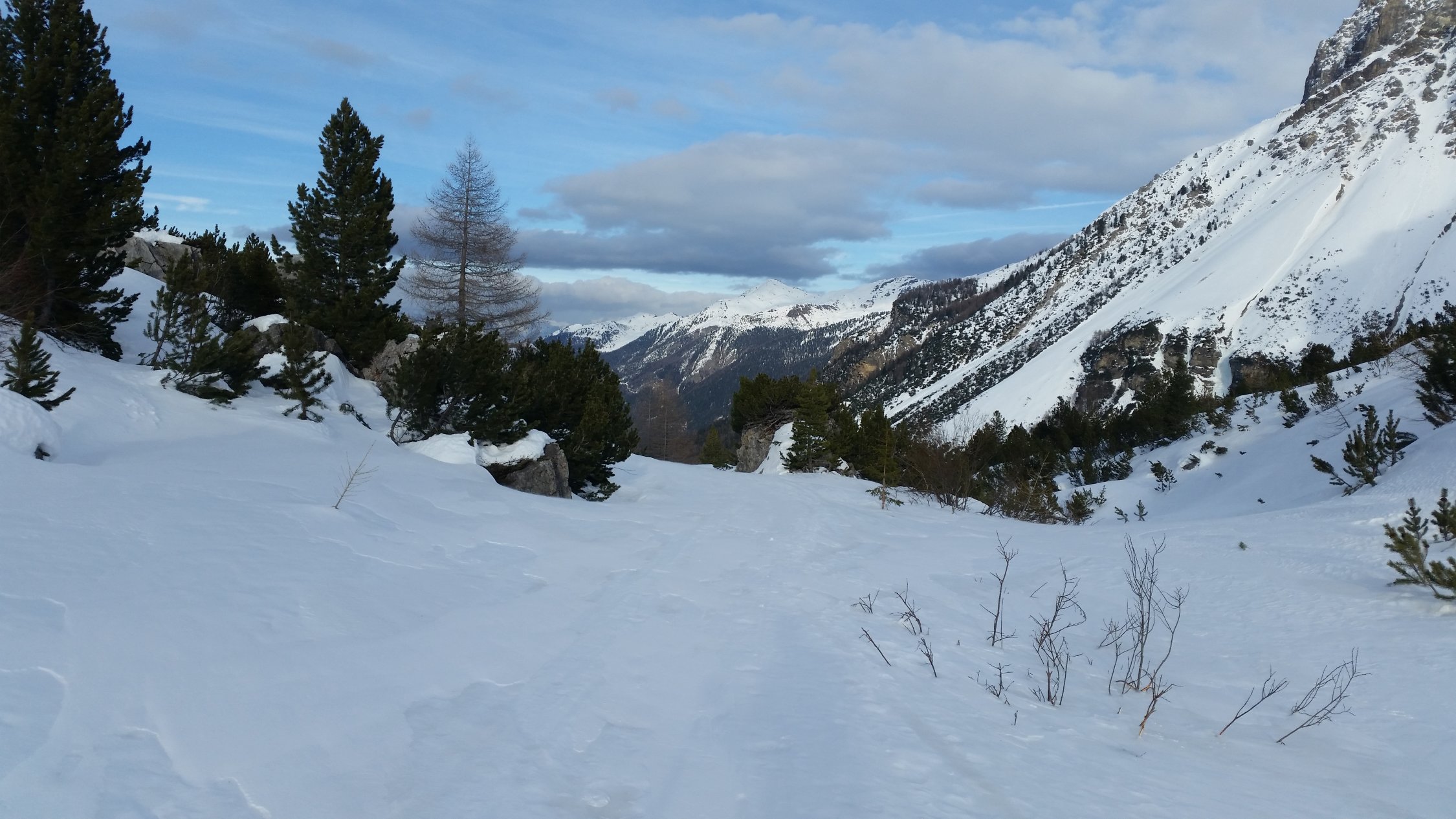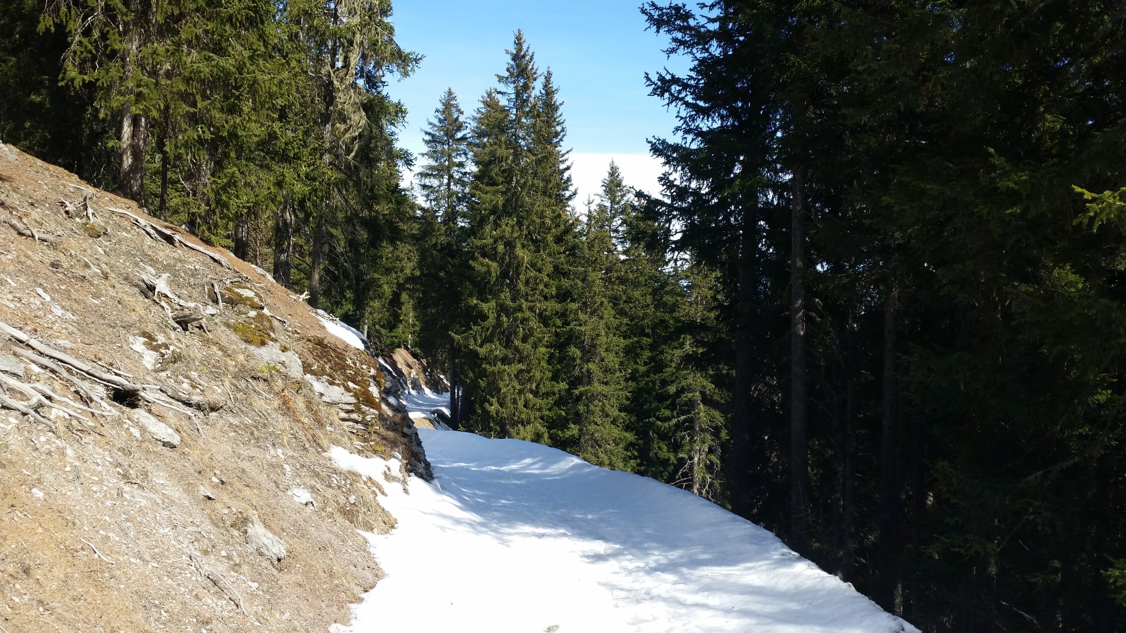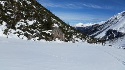 Die Forststrasse bis Palüetta (P1715) war mit Skis schlecht zu machen, bis hier könnte man mit dem Auto mit Ketten einfach hochkommen. Ich bin trotzdem alles mit Skis gegangen. Hinauf mit Fellen und hinab zu Fuss. Danach ab ca. 1730 ist die Strasse nicht mehr passierbar, ab hier sehr gute Verhältnisse vorgefunden.