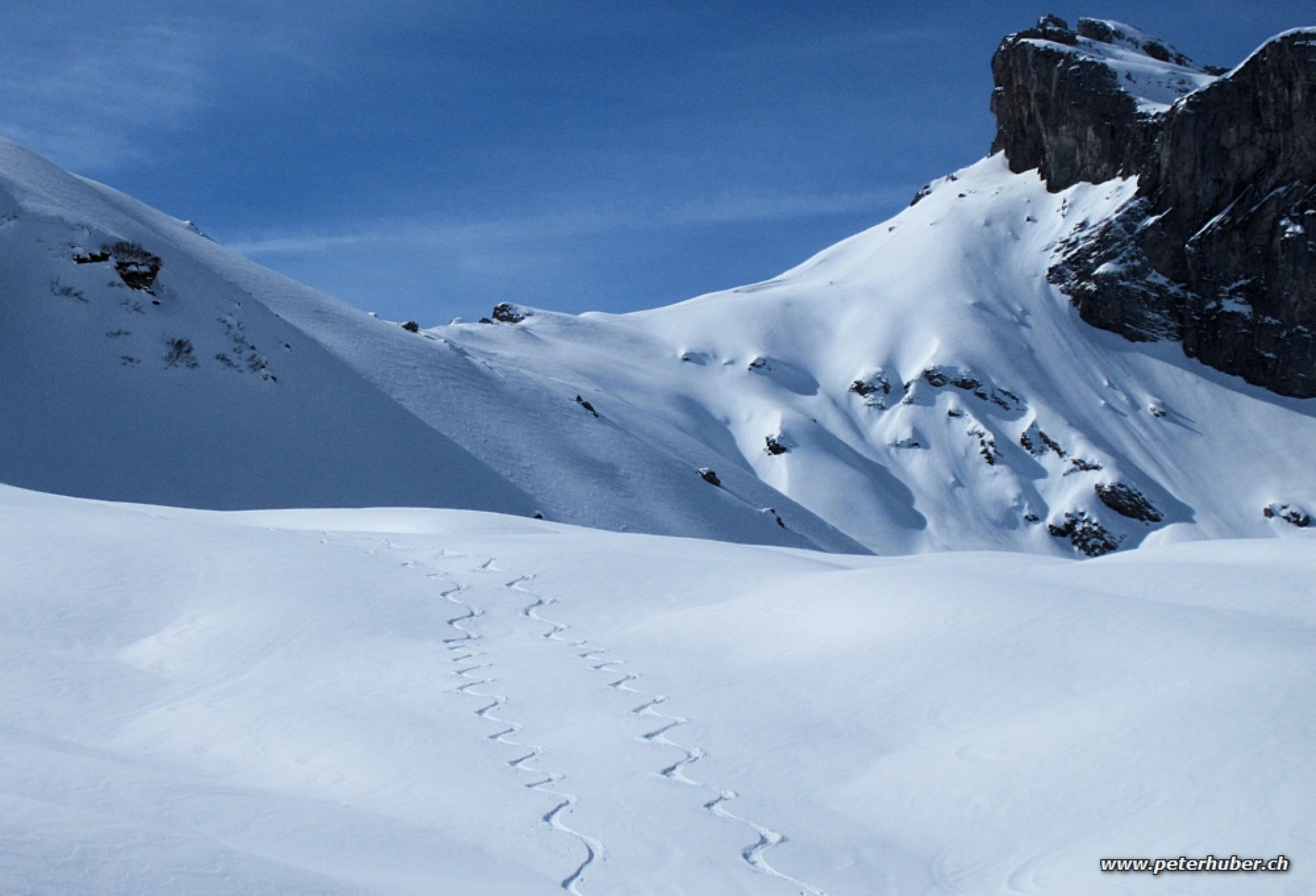Abfahrt: Meist toller vom Wind etwas angepresster Pulverschnee. Echt schön nach dem harten Schnee der letzten Tage. Auf den Kuppen kurz auch mal hart abgeblasen. Bei Unter Stafel wird der Neuschnee dann feucht. Wir sind auf der Alpstrasse abgefahren. Fühlt sich wie schöne Piste an.