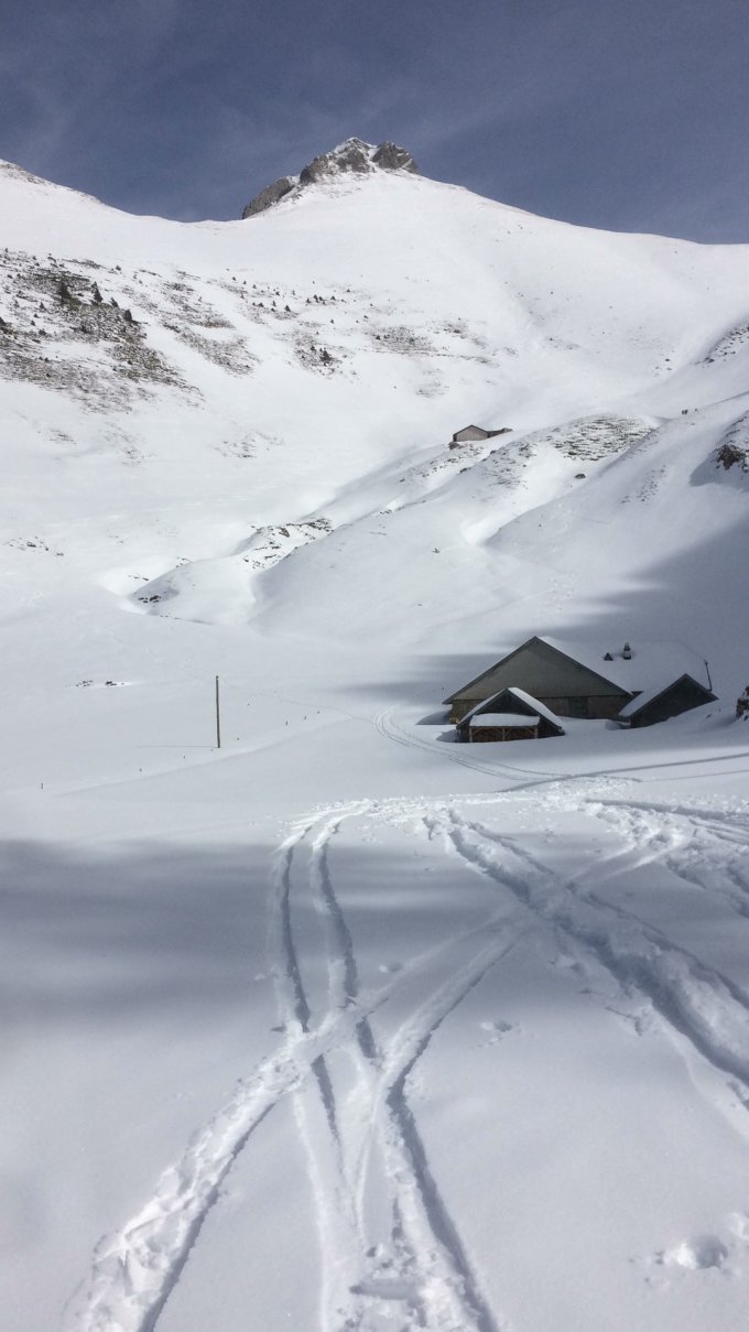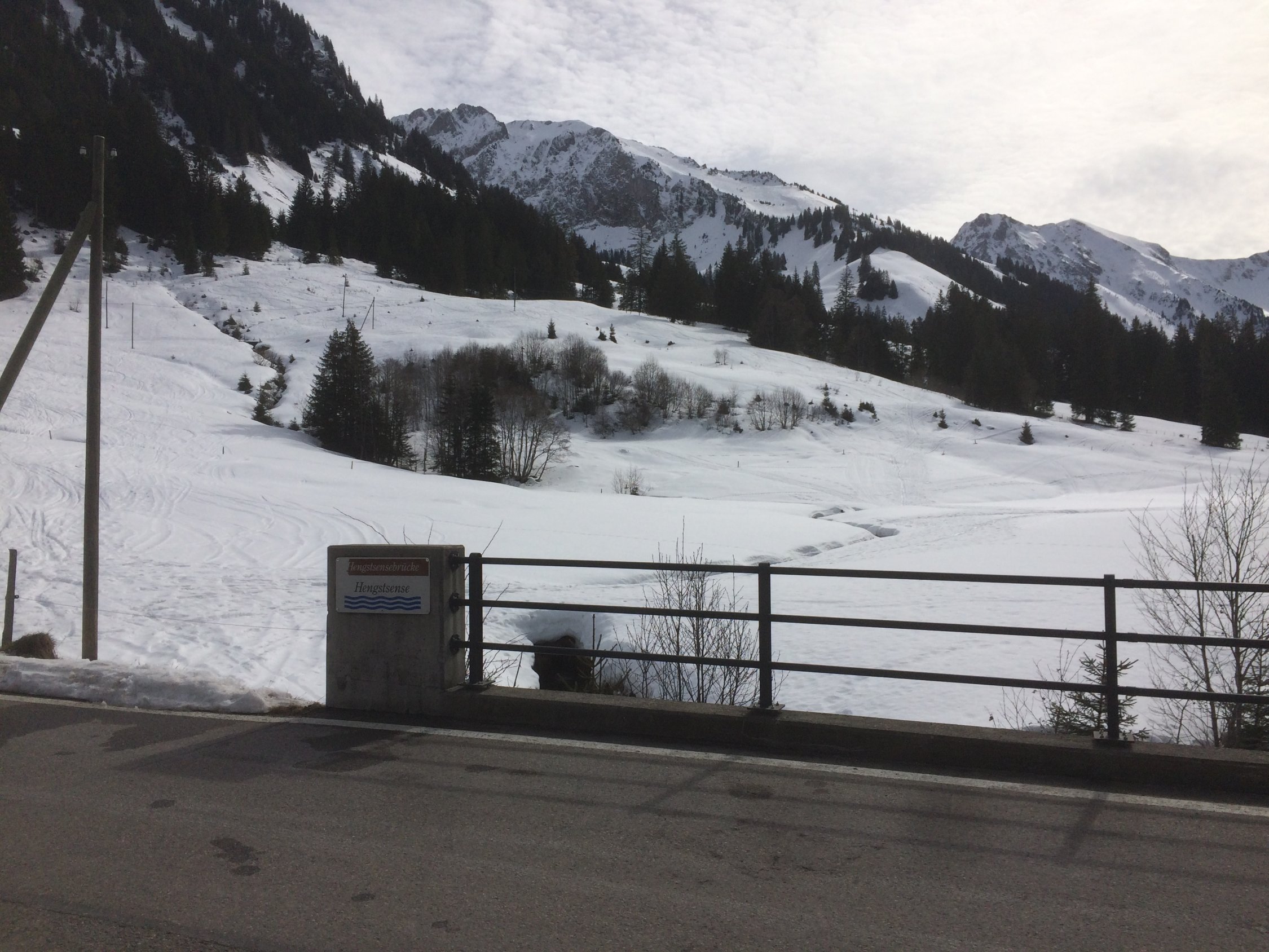 Gut ist die Schneelage im Schwefelbergbad und im Hengstschlund. Etwas knapp ist die Schneelage im Ofen und im oberen Teil des Gipfelhangs. Auf dem Bild sieht das besser aus, als es ist. Aber man kann im Gipfelhang noch Abfahren an Orten, wo es auch Unterlage hat.