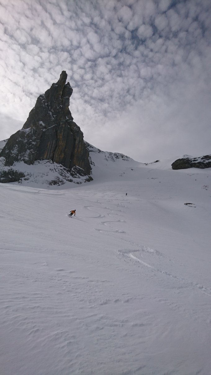 Abfahrt in den Hängen Richtung Hoganthorn, Schnee ist dort etwas weniger vom Wind geprägt, pulvrig und sehr gut zu fahren. Richtung Soustal runter ein ähnliches Bild, meist sehr gut zu fahren. Unten raus im Couloir des Chantbachs wird der Schnee dann etwas feuchter und schwerer - ist jetzt halt leider verfahren ;-) Oben aber noch genug Platz. Bis Isenfluh heute nur zwei Tragestellen.