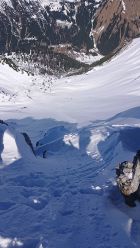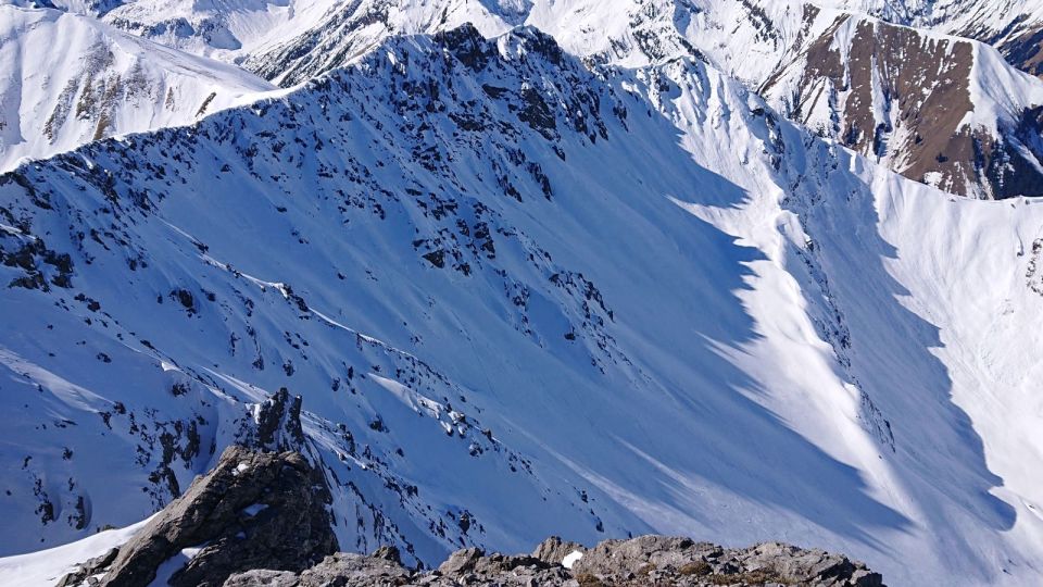 Aufsteigt zum Seelakopf auf Spur meines Vorgängers. Ab der Ansteilung vor den Felsen sehr mühsam. Haltloser Pulver auf Burschharsch, der mit den Ski nicht zu durchbrechen war, aber die Harscheisen auch nicht gehalten haben. Zu Fuß versunken. Dann ging es wieder auf Ski, sehr wechselnd. Nach langer Zeit mit Skispur am Grat angekommen. Weiter mit Ski möglich bis unter den Gipfelaufschwung.