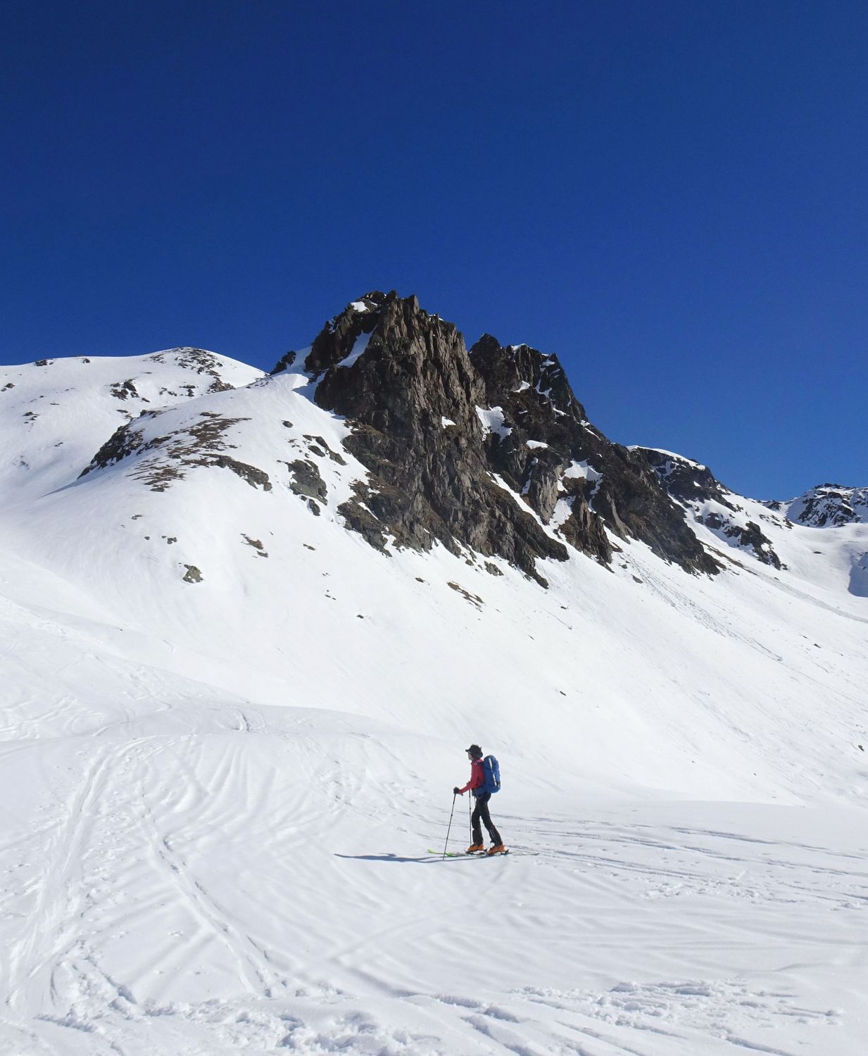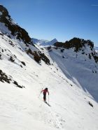 Aufstieg in harter, aber nicht eisiger Spur. Im unteren Teil mit einigen steileren Passagen fanden wir Harscheisen angenehm. Weiter oben dann griffig, gleichmässig und bis zum Skidepot gut zu gehen. Nur die letzten Kehren zur Scharte waren etwas mühsam. Gipfelaufstieg zu Fuß in Trittschnee problemlos.