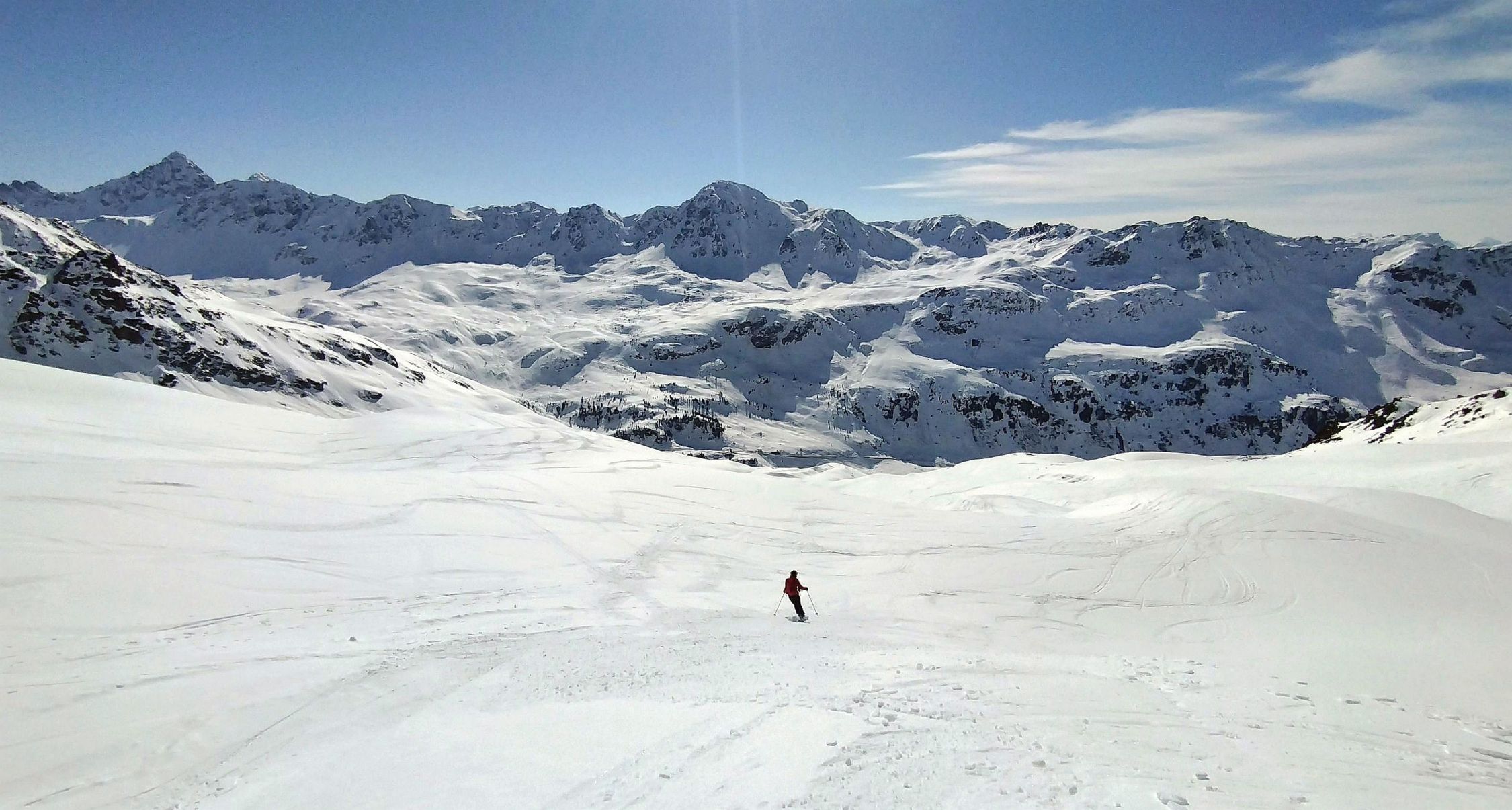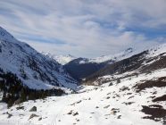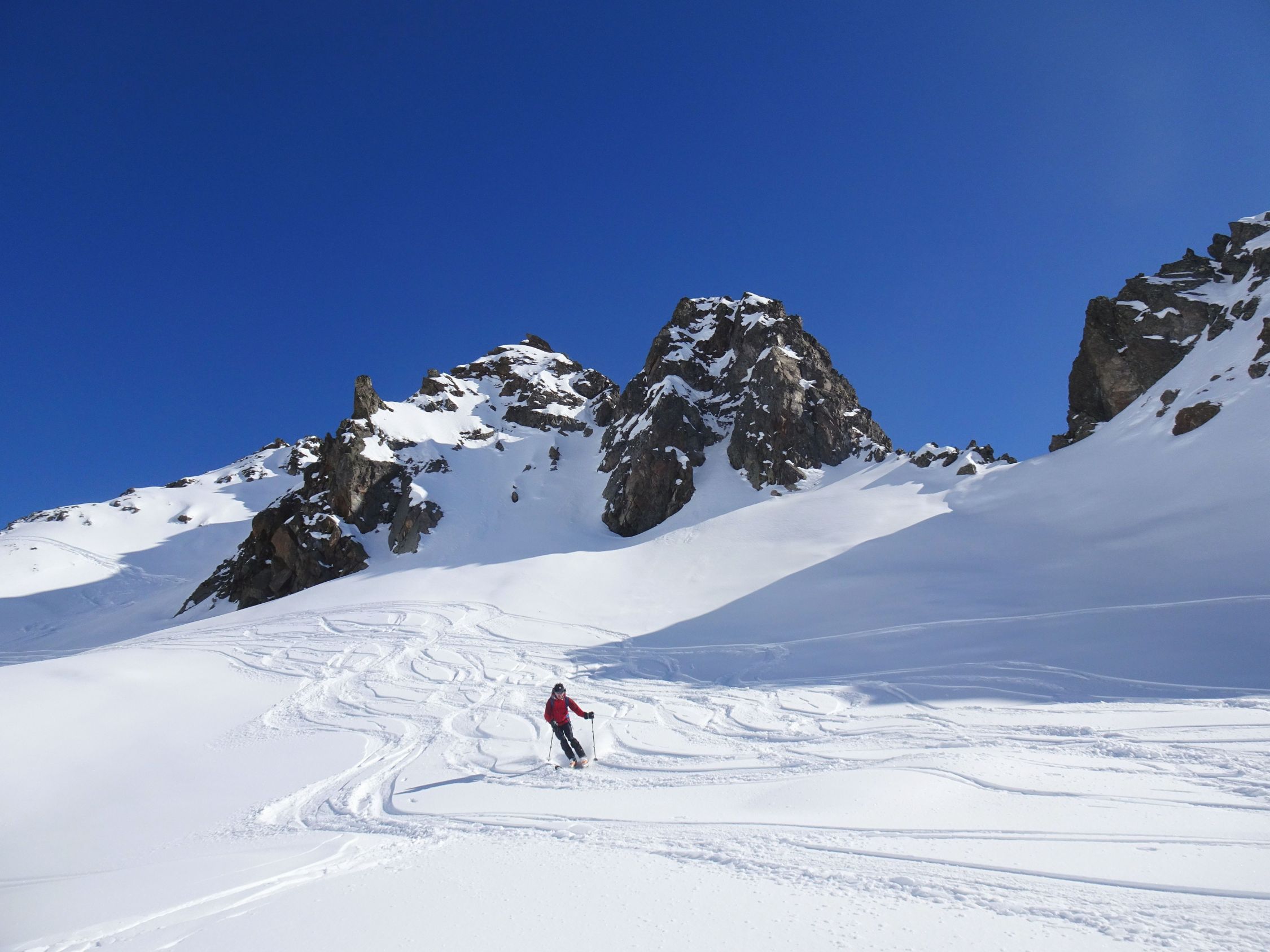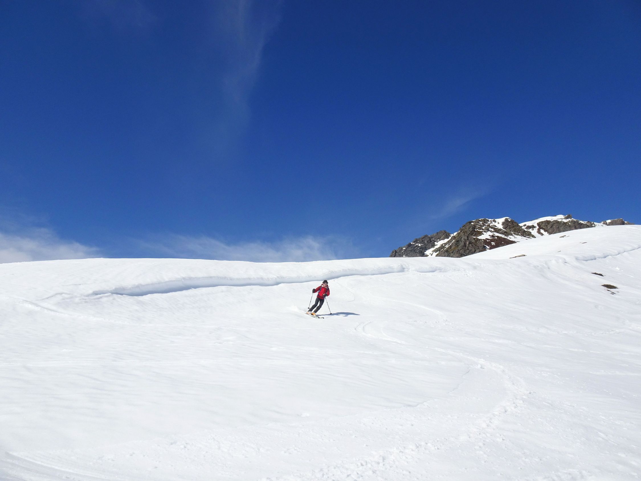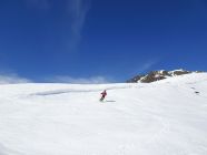 Abfahrt oben nordwestseitig noch Pulver, leicht gedeckelt, aber gut fahrbar. Nach unten hin Südwesthänge zunehmend weich und firnig. Im weitläufigen Gelände kann man die optimale Abfahrtsroute recht gut wählen. Ganz unten apern die Hänge langsam aus und man muss man sich etwas durchmanövrieren. Geht aber noch ganz gut.