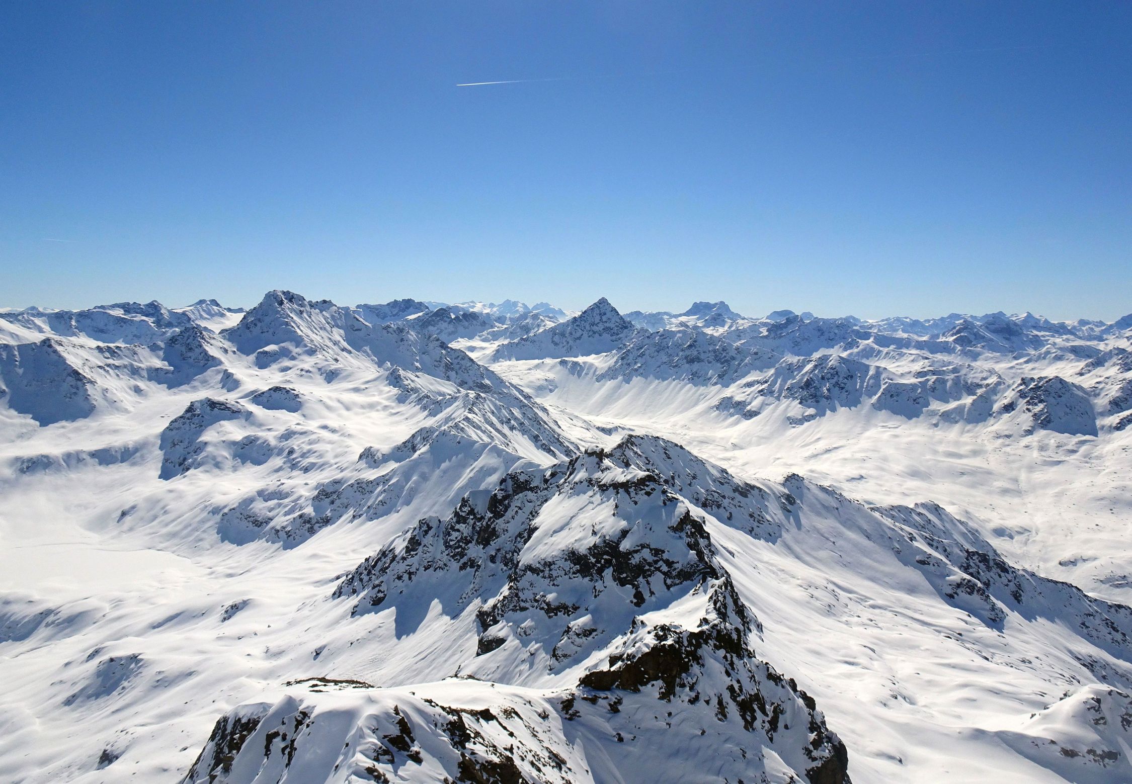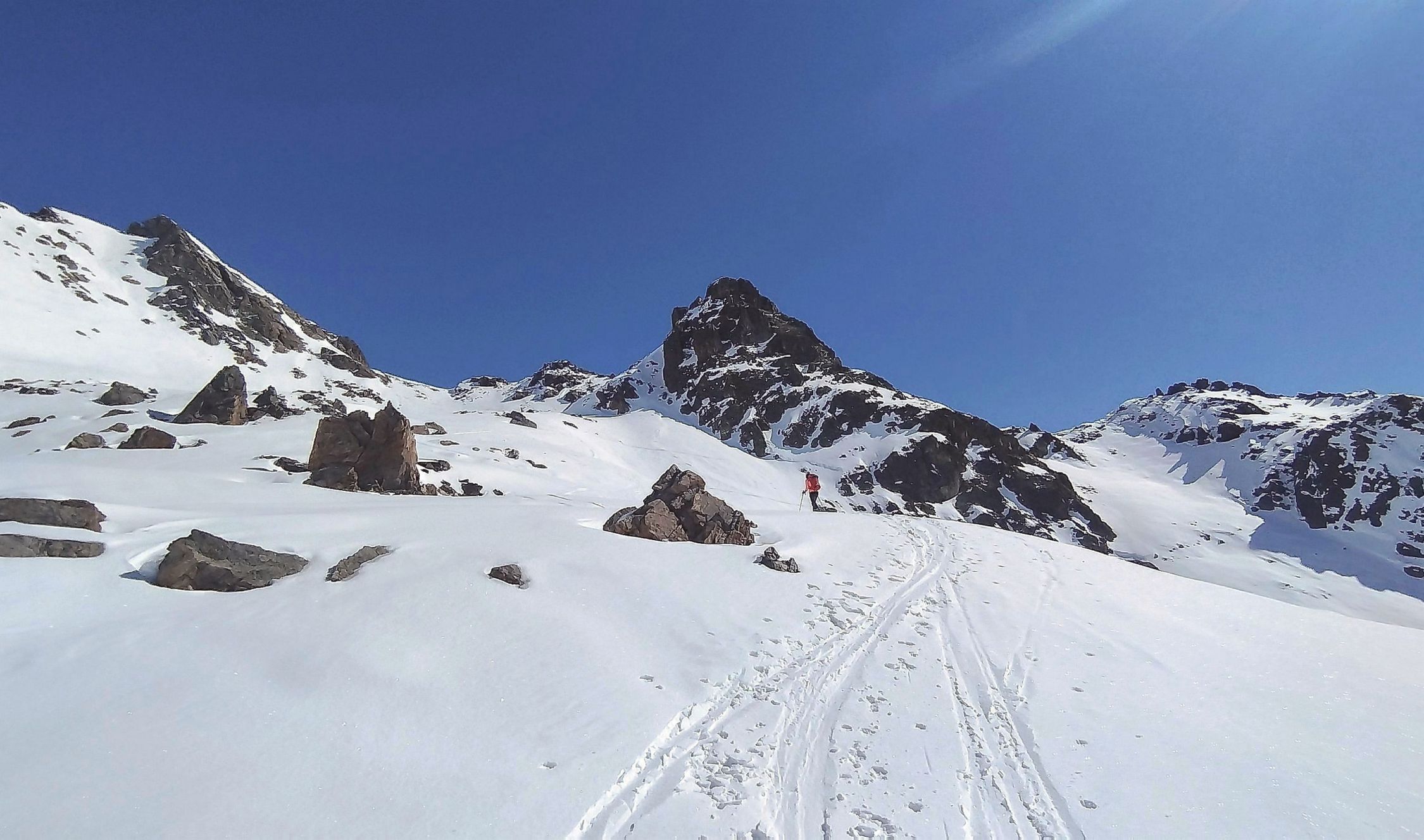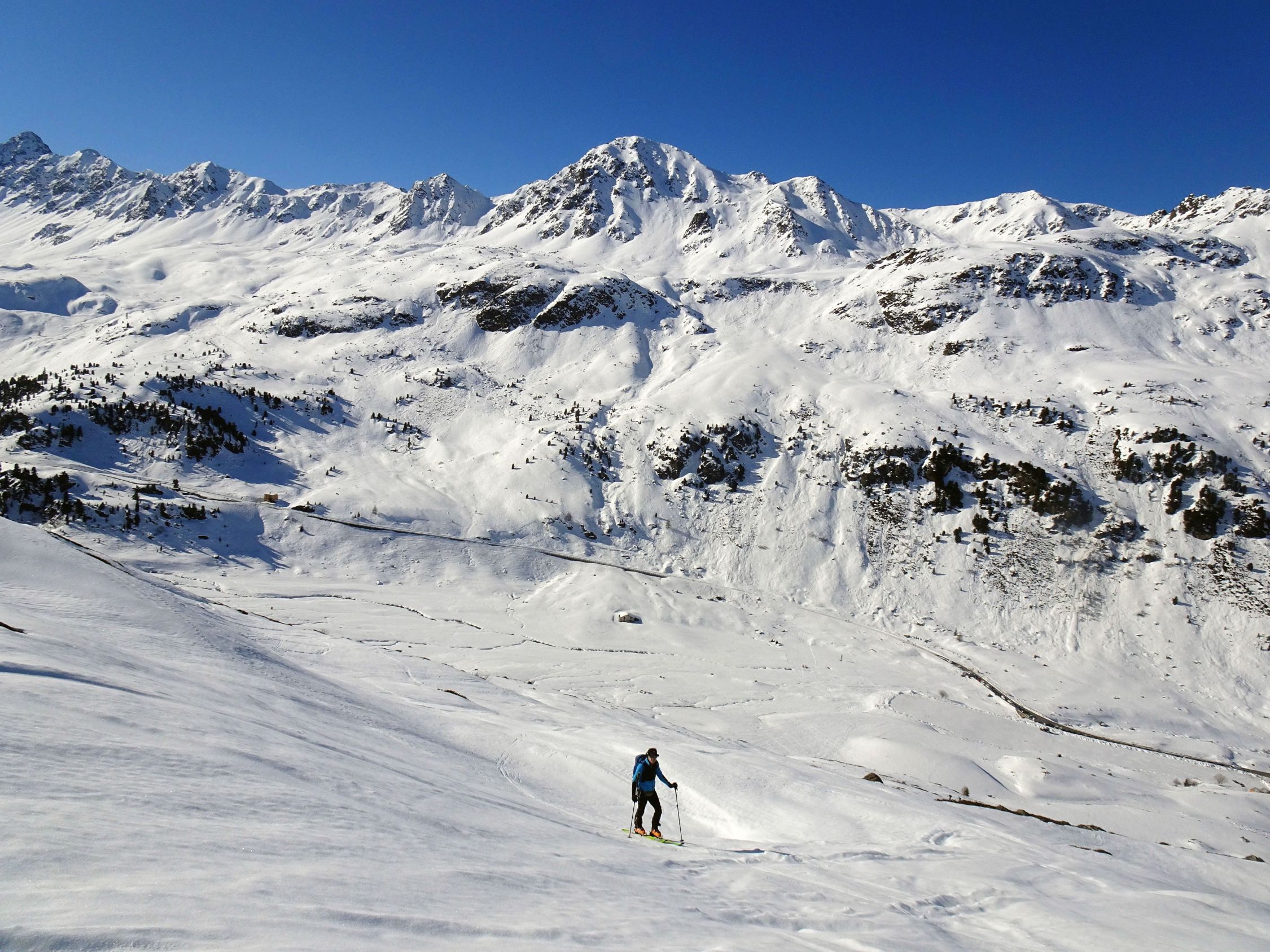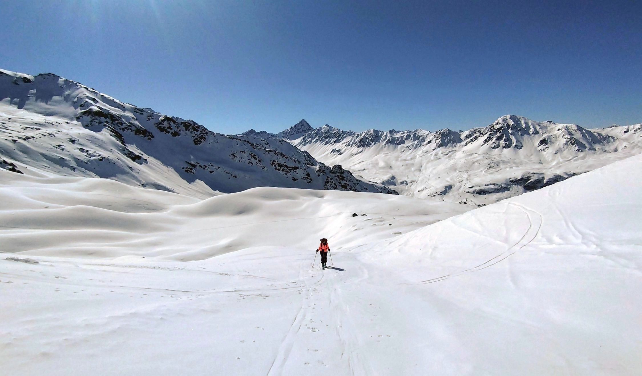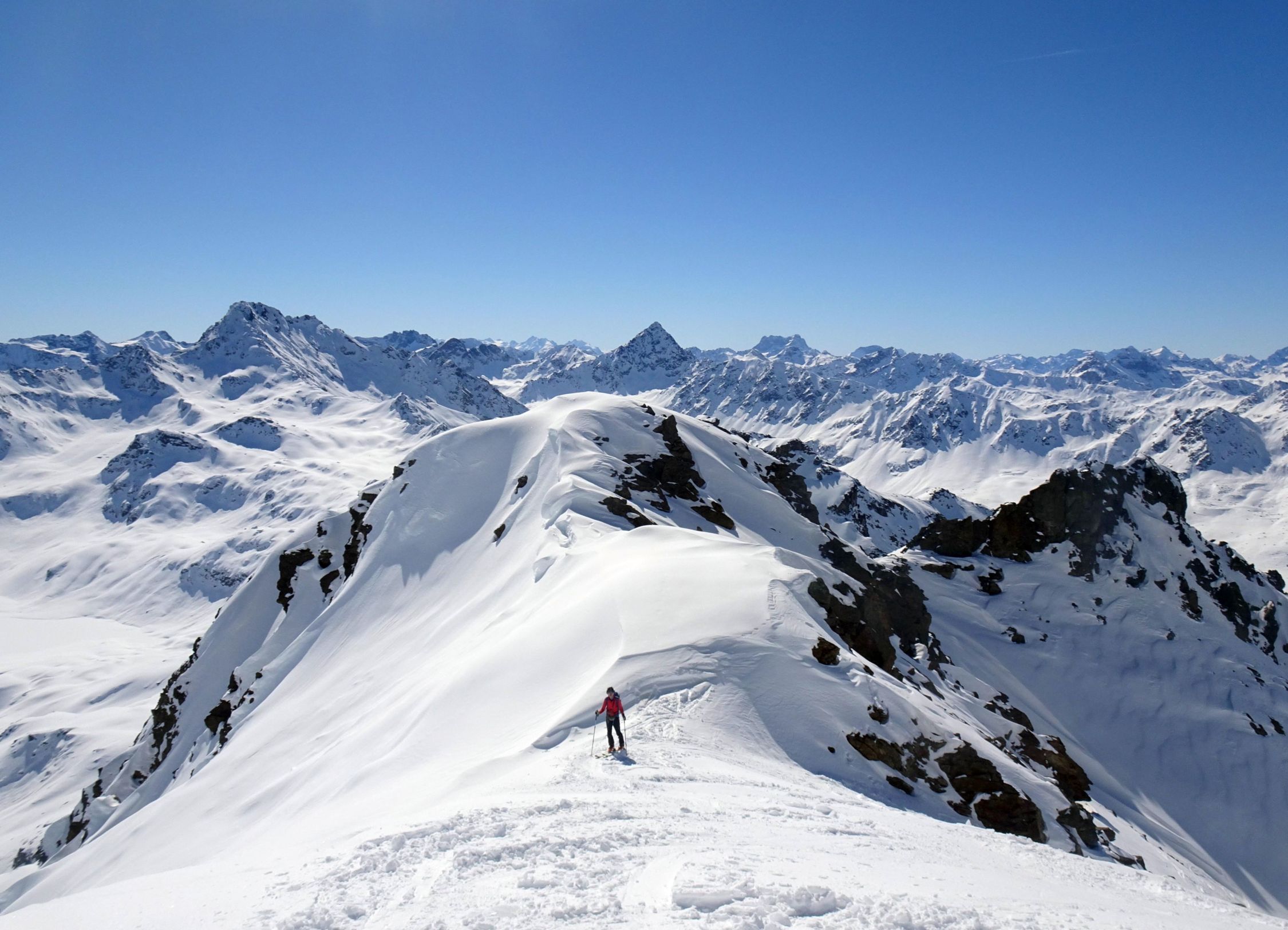 Wetter perfekt. Sonne, beste Fernsicht und rel. warm. Nur im Gipfelbereich kalter Wind und sehr ungemütlich, Päusschen dann erst am Skidepot an der Felswand. Einige Tourengeher unterwegs heute, viele hatten auch das Flüela Wisshorn als Ziel. Straße gg. 8.30 h schon ziemlich zugeparkt, aber am kleinen Parkplatz bei Tschuggen war noch ausreichend Platz.