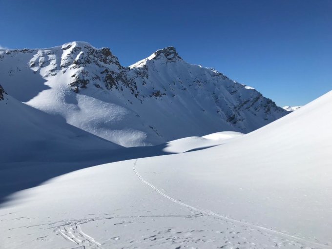 Nach dem vielen Wind gestern ein überraschend schöner Tag - blauer Himmel, tolle Sicht und nicht mal am Gipfel ein Windhauch. Der Schnee schon im Aufstiege angenehm, frischer Pulver hatte alle Spuren verschwinden lassen, ich war heute wohl der einzige. Nur der Waldweg war am morgen noch knusprig hart. Ab Alpe Sanaspans dann Pulver auf harter Unterlage. Der Gipfelaufbau nervt auf den letzten Metern mit geröllartigem Gestein, aber das ist in der Gegend halt so. Dafür ist das Panorama, vor allem nach Süden, überwältigend schön. Und die Abfahrt bis zur Alpe S. ein reines Vergnügen. Vom Gipfelhang abgesehen eine gute Tour für "erheblich" - Tage ...