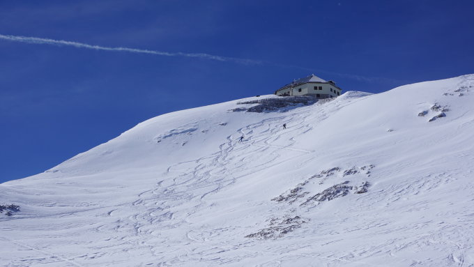 Lawinenbeobachtungen: Lockerschneelawinen aus dem felsdurchsetzten Gelände in der Querung nach der Mitterfeldalm und während der Abfahrt Ausbruch einer Triebschneescholle mit ca. 30cm Anrissmächtigkeit, ca. 2,5x1m im Ochsenkar
