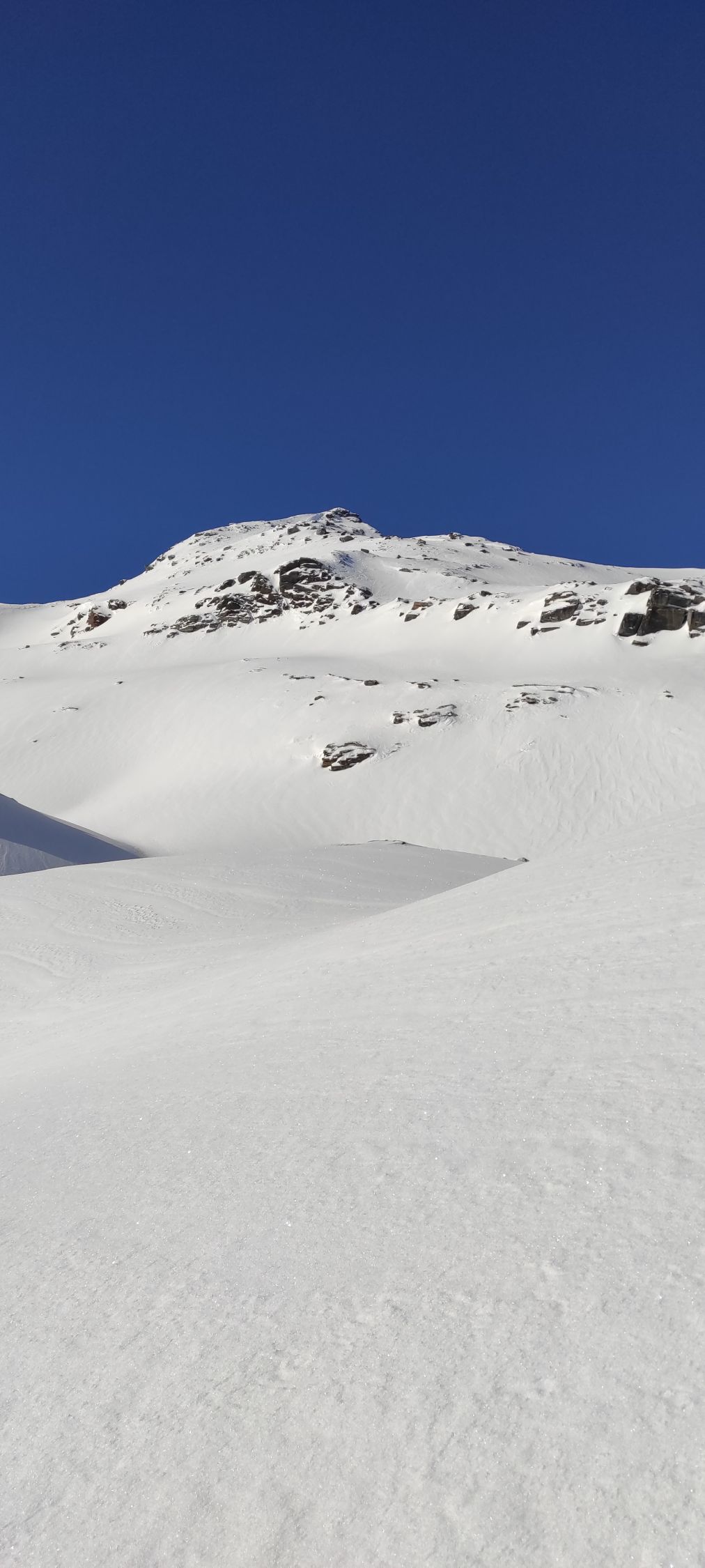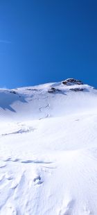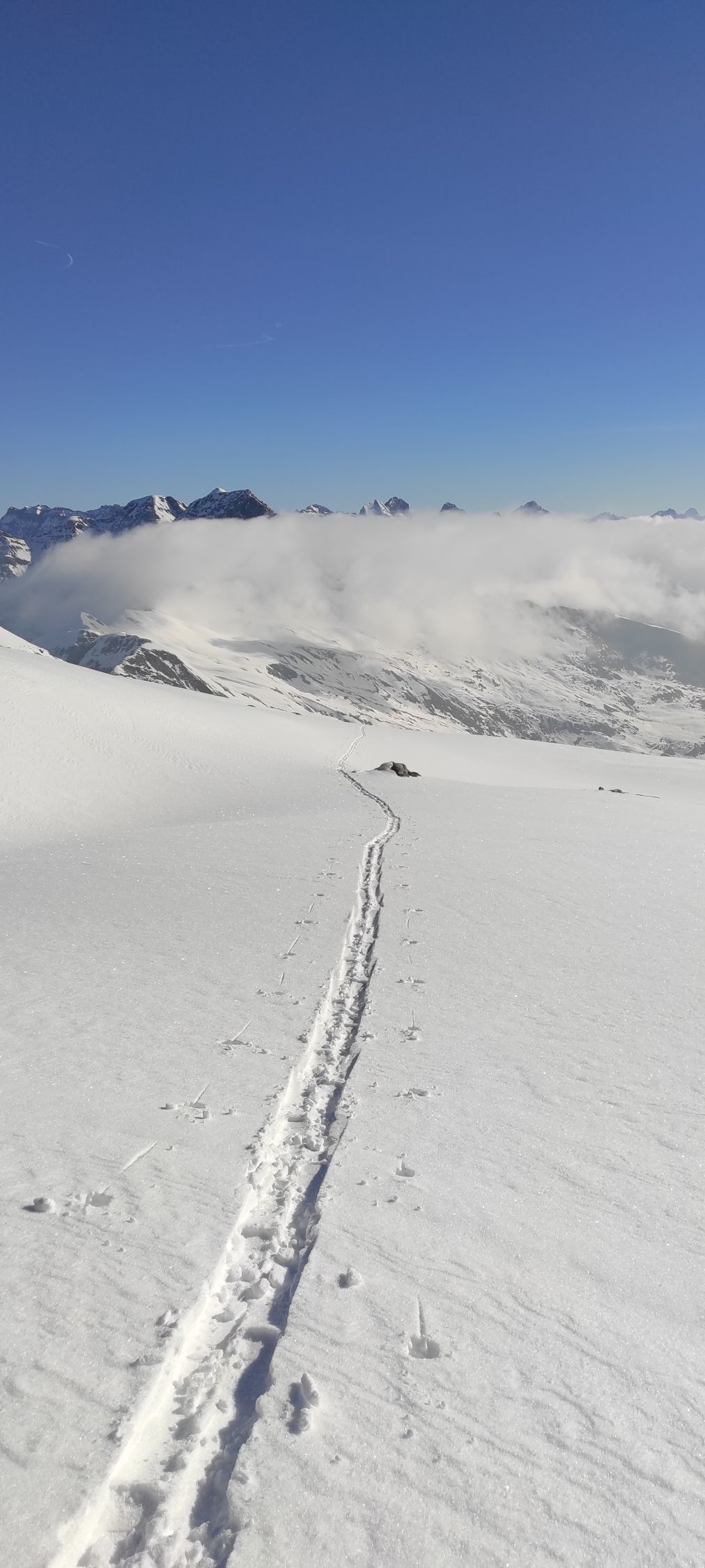 Skitragen bis ca. 1900m, aber das lohnt sich. Wunderbare Verhältnisse für Aufstieg und Abfahrt. Manchmal habe ich die Spur zu direkt angelegt und musste wegen des coupierten Geländes wieder etwas korrigieren, aber alles in allem geht das gut. Auch der Gipfelgrat ist problemlos zu gehen. Traum-Pulver auf der Abfahrt, ganz unten (unter 2000m) dann etwas schwererer Sulz. Abfahrt um 10:50 Uhr. Auf der Abfahrt aufkommender Nebel.
