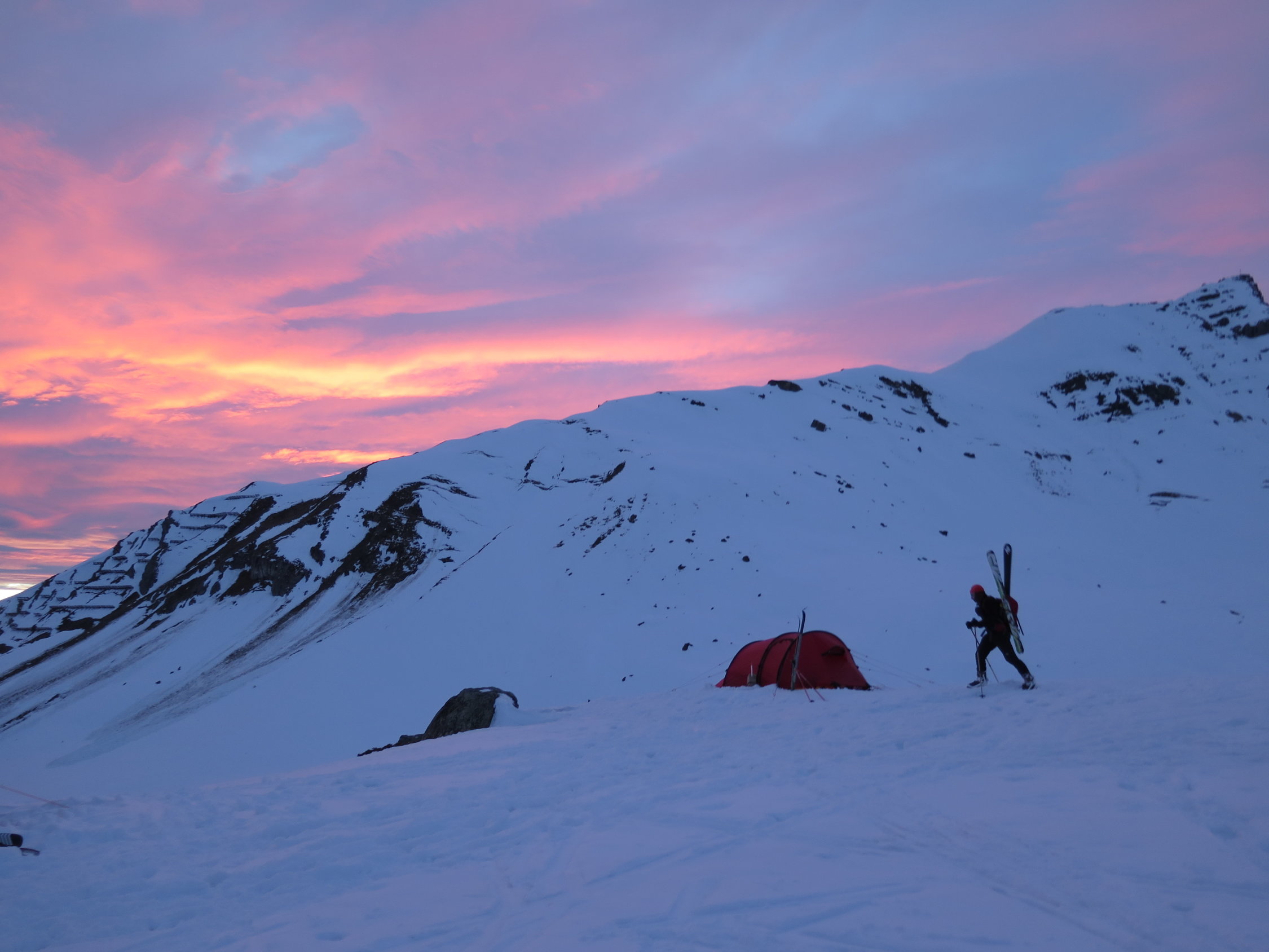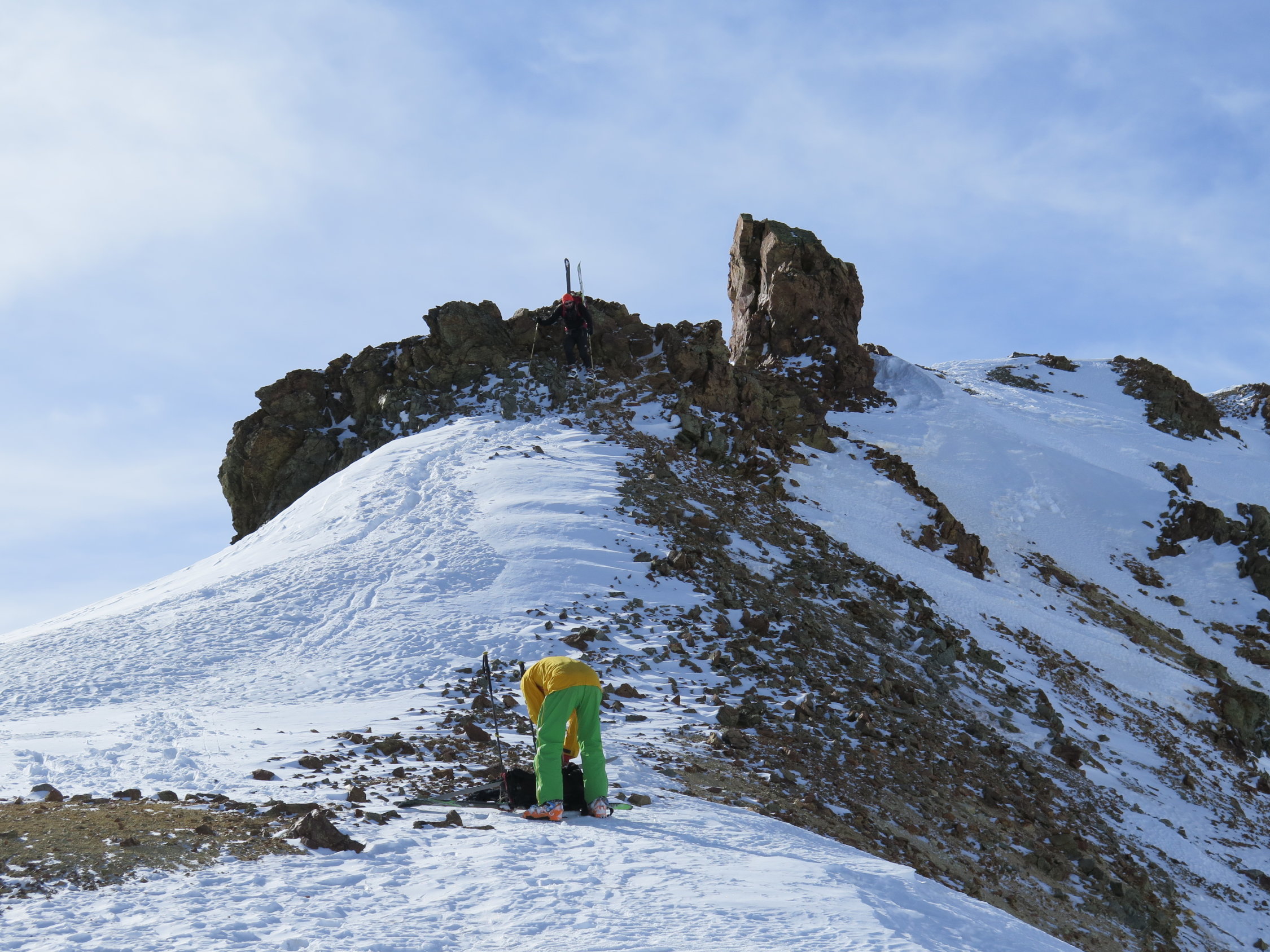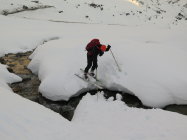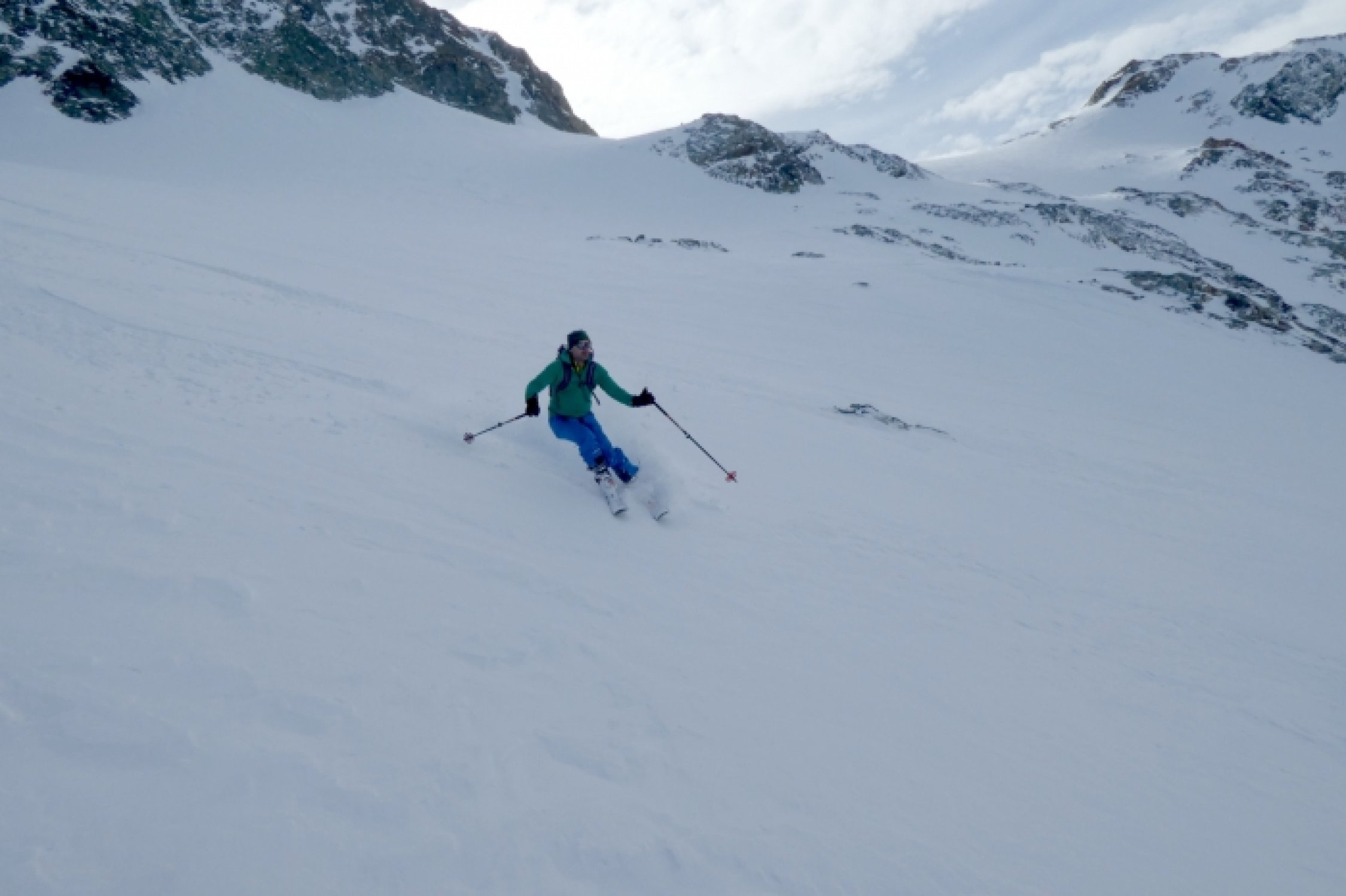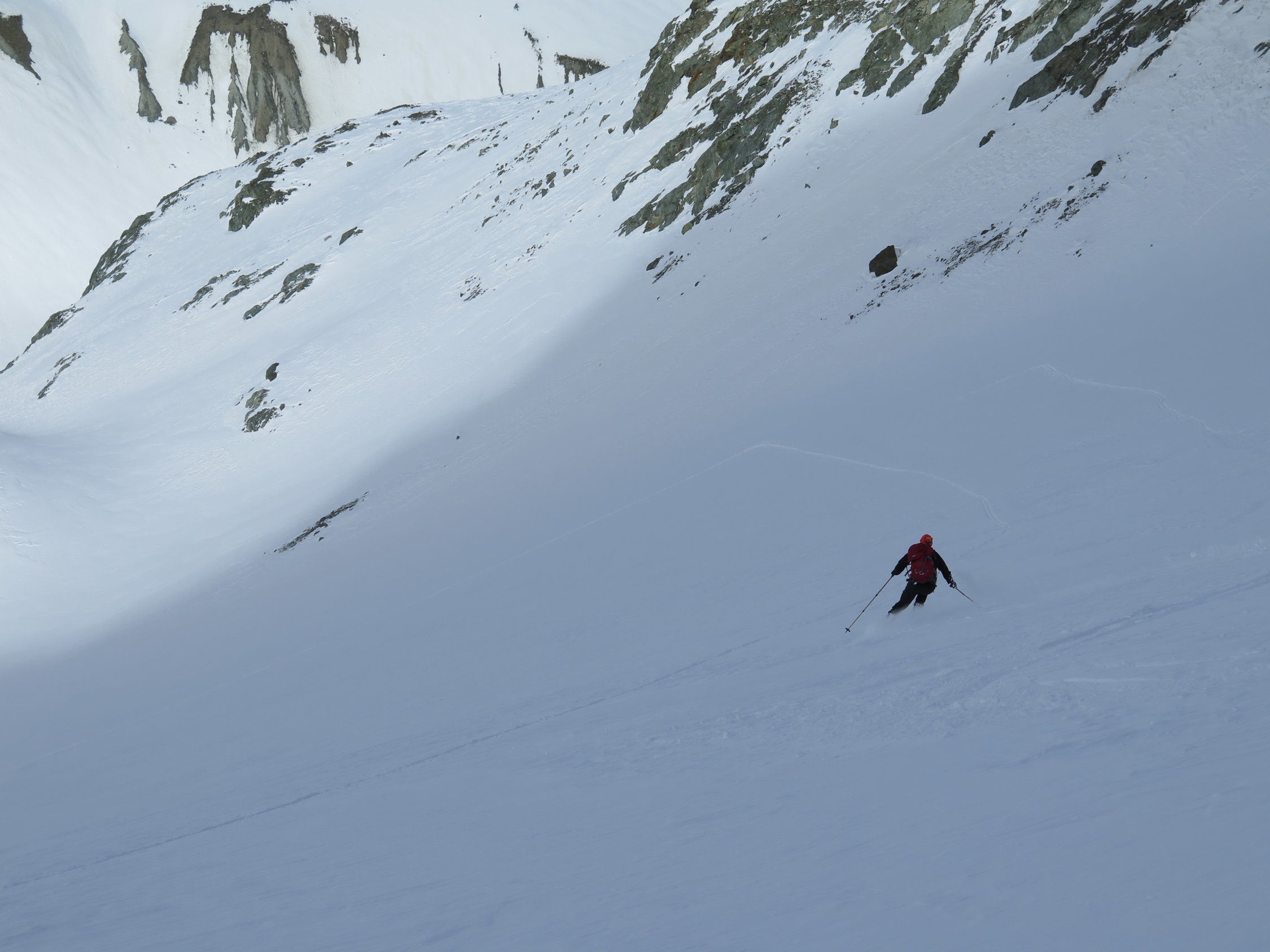 Nordseitig noch Pulver, gerade auch in der tollen Abfahrt vom Gipfel über den Gletscher zur Hütte.