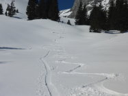Aufstieg durch den Wald auf Waldstrasse wird durch einen Lawinenkegel behindert. Man muss teilweise direkt durch den Wald hochsteigen.