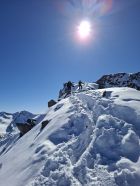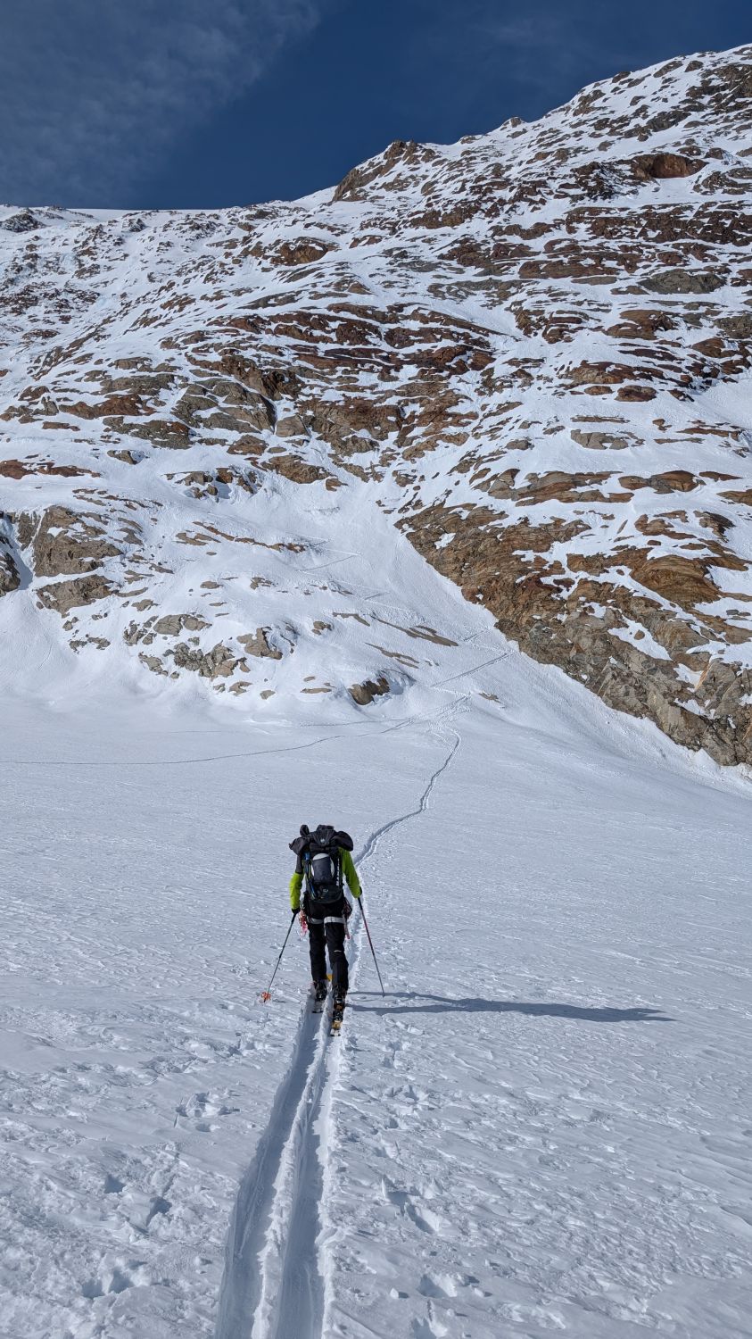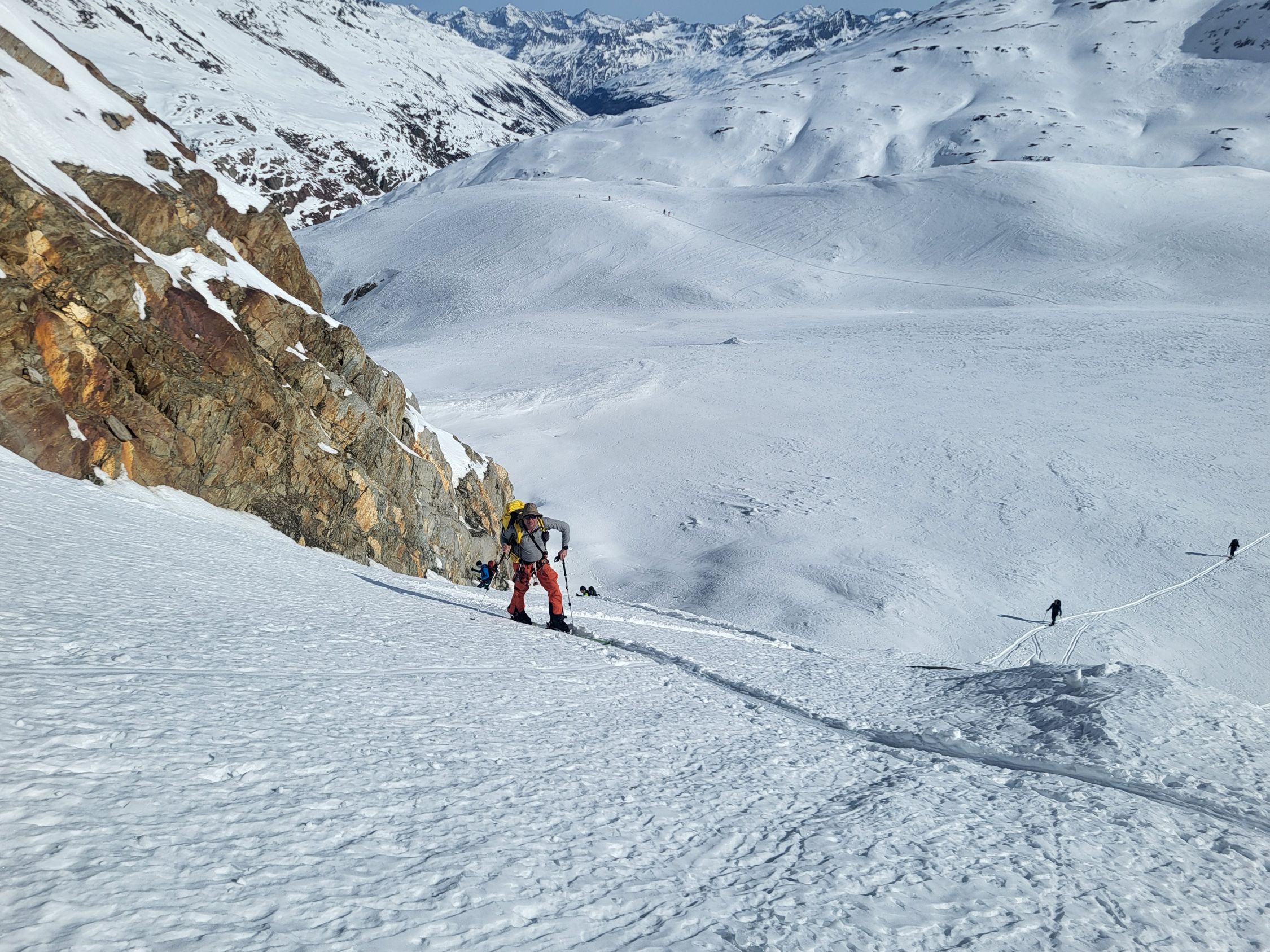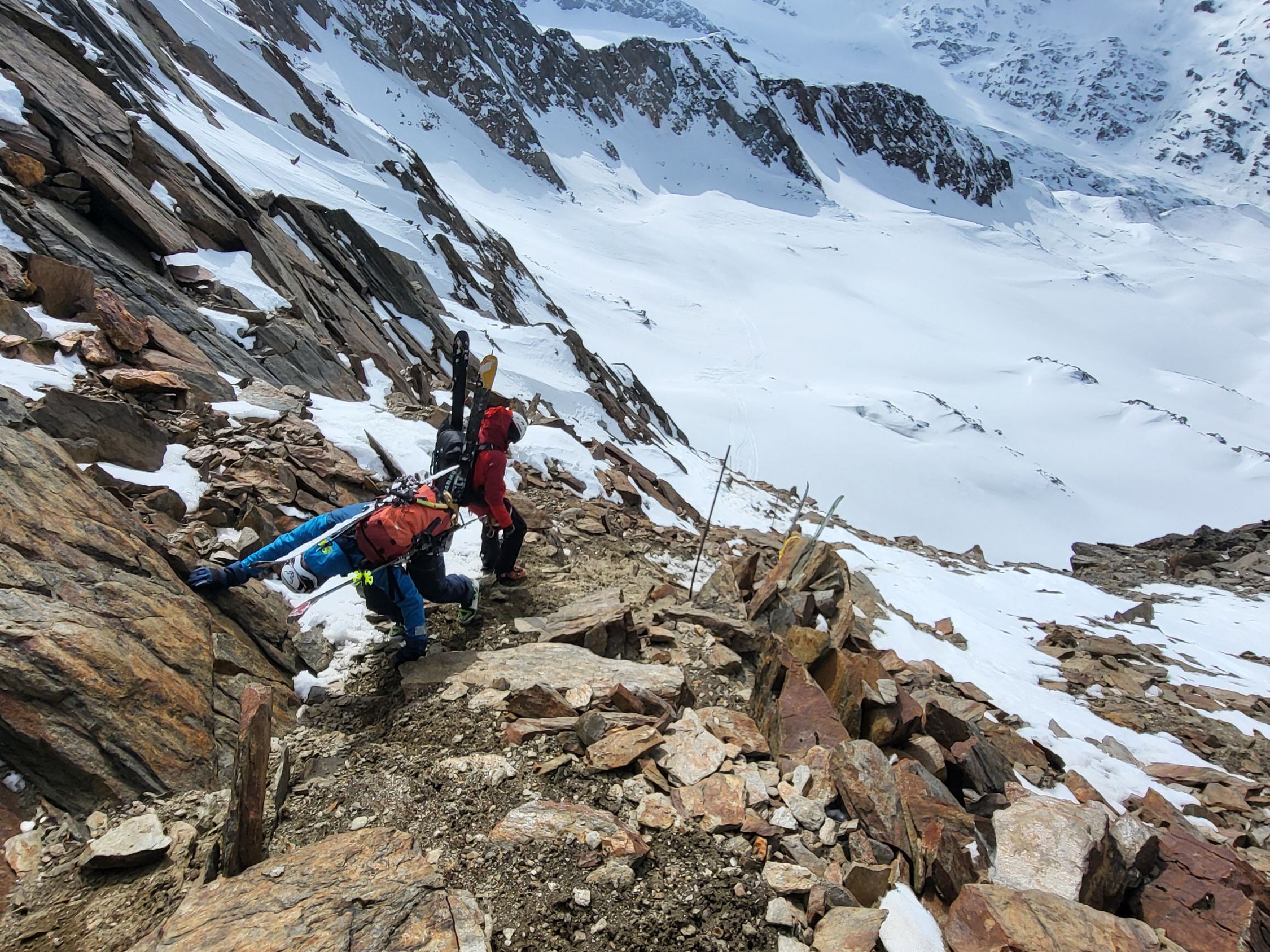 Von Obergurgl bis zur Langtaleckhütte kurz über Piste und einfach in ca. 2,5 h. Nächsten Morgen ca. 200 hm bis in den Eingang der Schlucht. Schlucht selbst mit Ski und an zwei Stellen kurz aufgebunden gut zu begehen. Danach über rechts haltend bis unter die Hänge des Schalfkogels. In 4-5 Spitzkehren bis zu einer kurzen etwas exponierten Traverse bis zur Verflachung der Gletschermulde unte dem Schalfkogeljoch. Hier kurz Ski aufgedunden. Sieht von unten schlimmer aus als es ist. Crux ist dann der Abstieg vom Schalfkogel. Nicht wirklich zu empfehlen bei z. Zt. Verhältnissen. Die ersten Meter OK mit Steigiesen. Stangen vorhanden zum Sichern. Sind hier aber noch nicht nötig. Schlüsselstelle dann weiter unten. Vorhandende Tritteisen und Kabel sind kaum zu gebrauchen da entweder verbogen oder nicht mehr verankert. Hier haben wir ca. 2 h verloren mit verschiedenen Abstiegsmöglichkeiten. Abseilen, Ablassen an Stange aber auch Traverse in Griesschnee. Nicht zu empfehlen wenn kein mind 40 meter Seil vorhanden. Situation wurde gemeldet und ist wohl gerade dabei, verbessert zu werden. Am besten vorher kurz bei Martin Busch Hütte anrufen bzgl. Verhältnissen. Danach schöne Abfahrt bis zur Seitenmöräne die wir ca. 150 hm abklettern mussten. Schön bis zu Wiederaufstieg Martin Busch Hütte. Nächste Tag Gran Beau Similaun mit Traumpulver zur Similaunhütte. Nächster Tag Passage zum Hauslabjoch und sehr schöne Abfahrt bis rur Bella Vista Hütte. Zurück über weitem Bogen zurück zum Hauslaubjoch und Martin Buschhütte. Erste Meter zur Ötzifundstellen Ski kuru getragen und dann schöne Abfahrt. Heute dann kurze Tour im Sonnenschein bis Hauslabkogel und Traumabfahrt bis zurück zur Hütte. Bier und ab nach Vent ohne Tragen über Strasse.