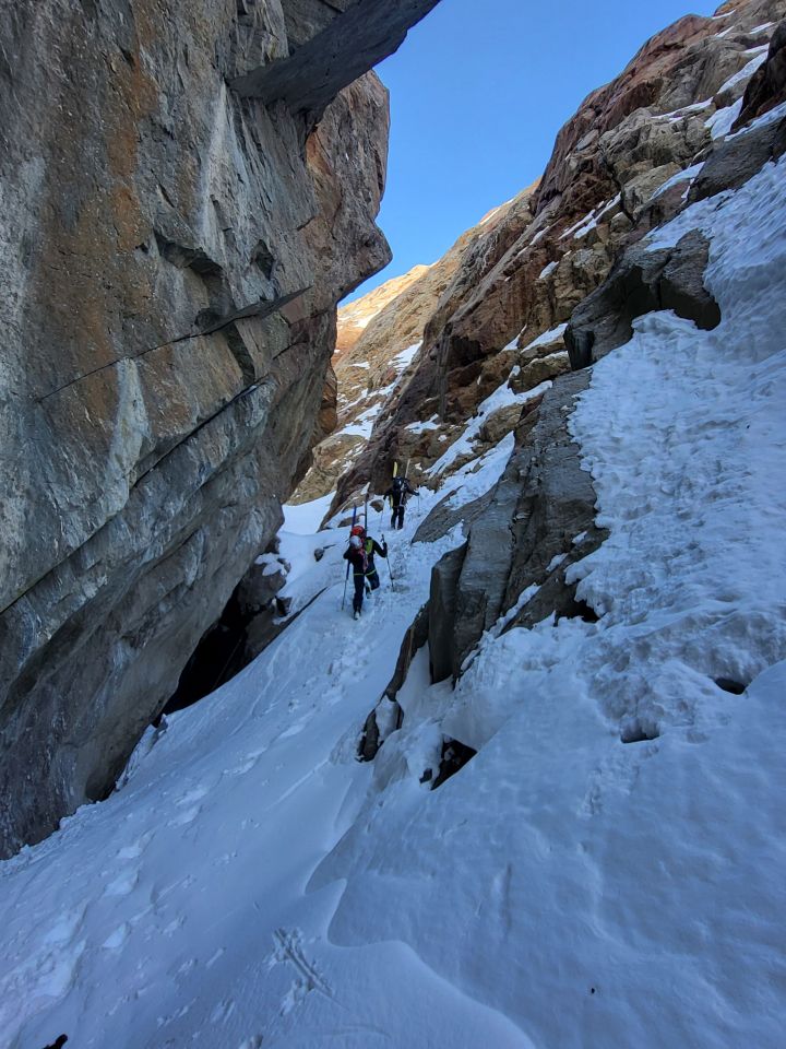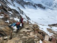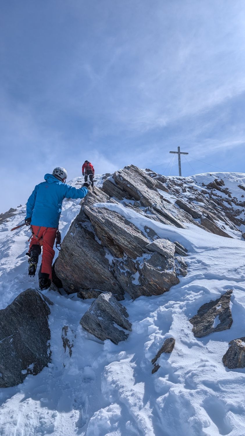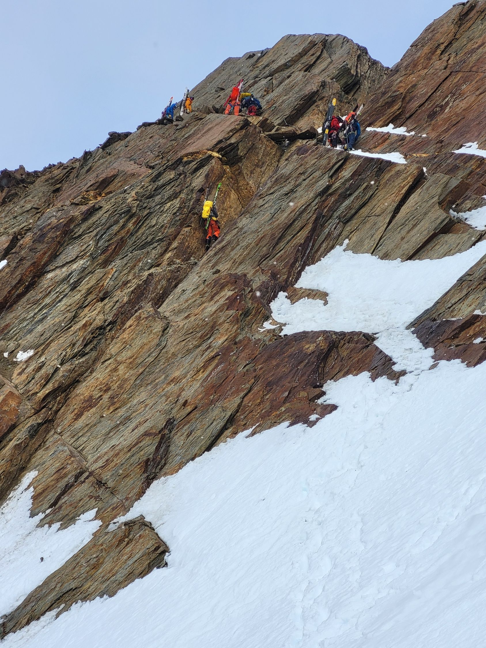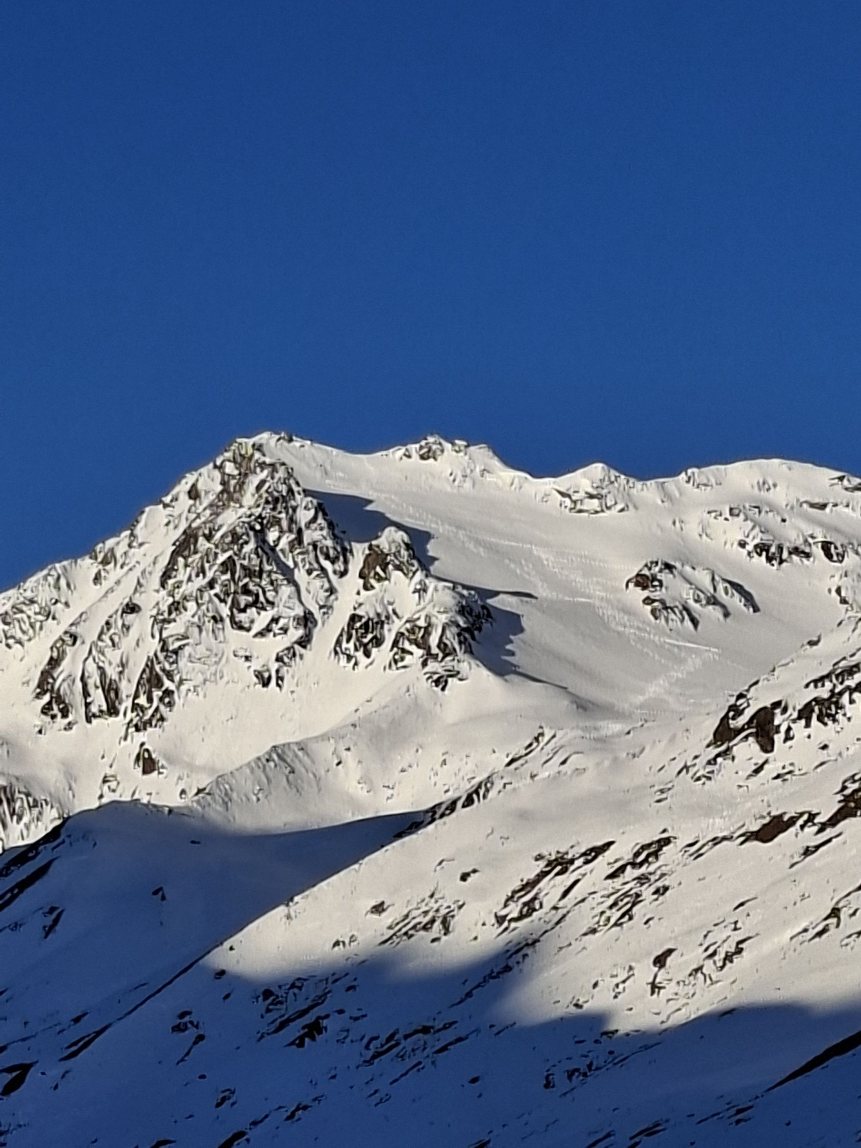 Von Obergurgl bis zur Langtaleckhütte kurz über Piste und einfach in ca. 2,5 h. Nächsten Morgen ca. 200 hm bis in den Eingang der Schlucht. Schlucht selbst mit Ski und an zwei Stellen kurz aufgebunden gut zu begehen. Danach über rechts haltend bis unter die Hänge des Schalfkogels. In 4-5 Spitzkehren bis zu einer kurzen etwas exponierten Traverse bis zur Verflachung der Gletschermulde unte dem Schalfkogeljoch. Hier kurz Ski aufgedunden. Sieht von unten schlimmer aus als es ist. Crux ist dann der Abstieg vom Schalfkogel. Nicht wirklich zu empfehlen bei z. Zt. Verhältnissen. Die ersten Meter OK mit Steigiesen. Stangen vorhanden zum Sichern. Sind hier aber noch nicht nötig. Schlüsselstelle dann weiter unten. Vorhandende Tritteisen und Kabel sind kaum zu gebrauchen da entweder verbogen oder nicht mehr verankert. Hier haben wir ca. 2 h verloren mit verschiedenen Abstiegsmöglichkeiten. Abseilen, Ablassen an Stange aber auch Traverse in Griesschnee. Nicht zu empfehlen wenn kein mind 40 meter Seil vorhanden. Situation wurde gemeldet und ist wohl gerade dabei, verbessert zu werden. Am besten vorher kurz bei Martin Busch Hütte anrufen bzgl. Verhältnissen. Danach schöne Abfahrt bis zur Seitenmöräne die wir ca. 150 hm abklettern mussten. Schön bis zu Wiederaufstieg Martin Busch Hütte. Nächste Tag Gran Beau Similaun mit Traumpulver zur Similaunhütte. Nächster Tag Passage zum Hauslabjoch und sehr schöne Abfahrt bis rur Bella Vista Hütte. Zurück über weitem Bogen zurück zum Hauslaubjoch und Martin Buschhütte. Erste Meter zur Ötzifundstellen Ski kuru getragen und dann schöne Abfahrt. Heute dann kurze Tour im Sonnenschein bis Hauslabkogel und Traumabfahrt bis zurück zur Hütte. Bier und ab nach Vent ohne Tragen über Strasse.