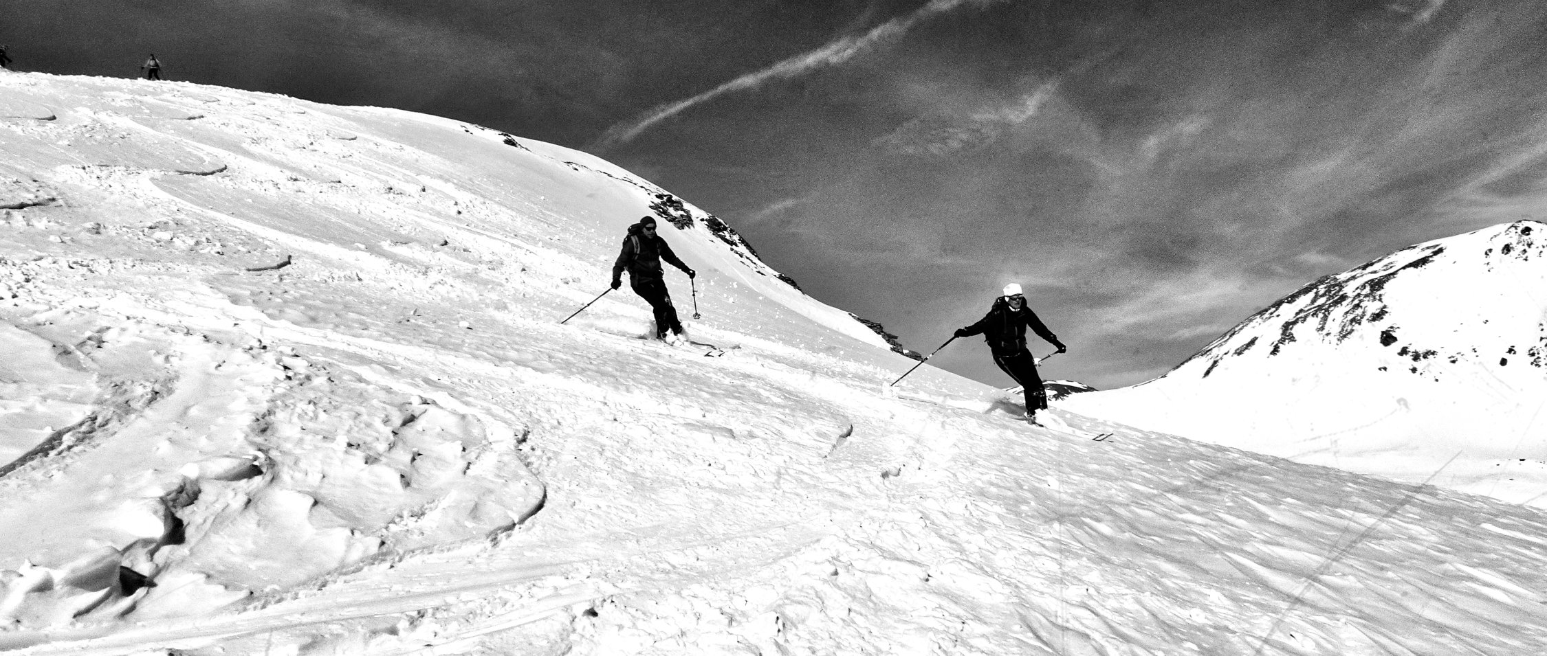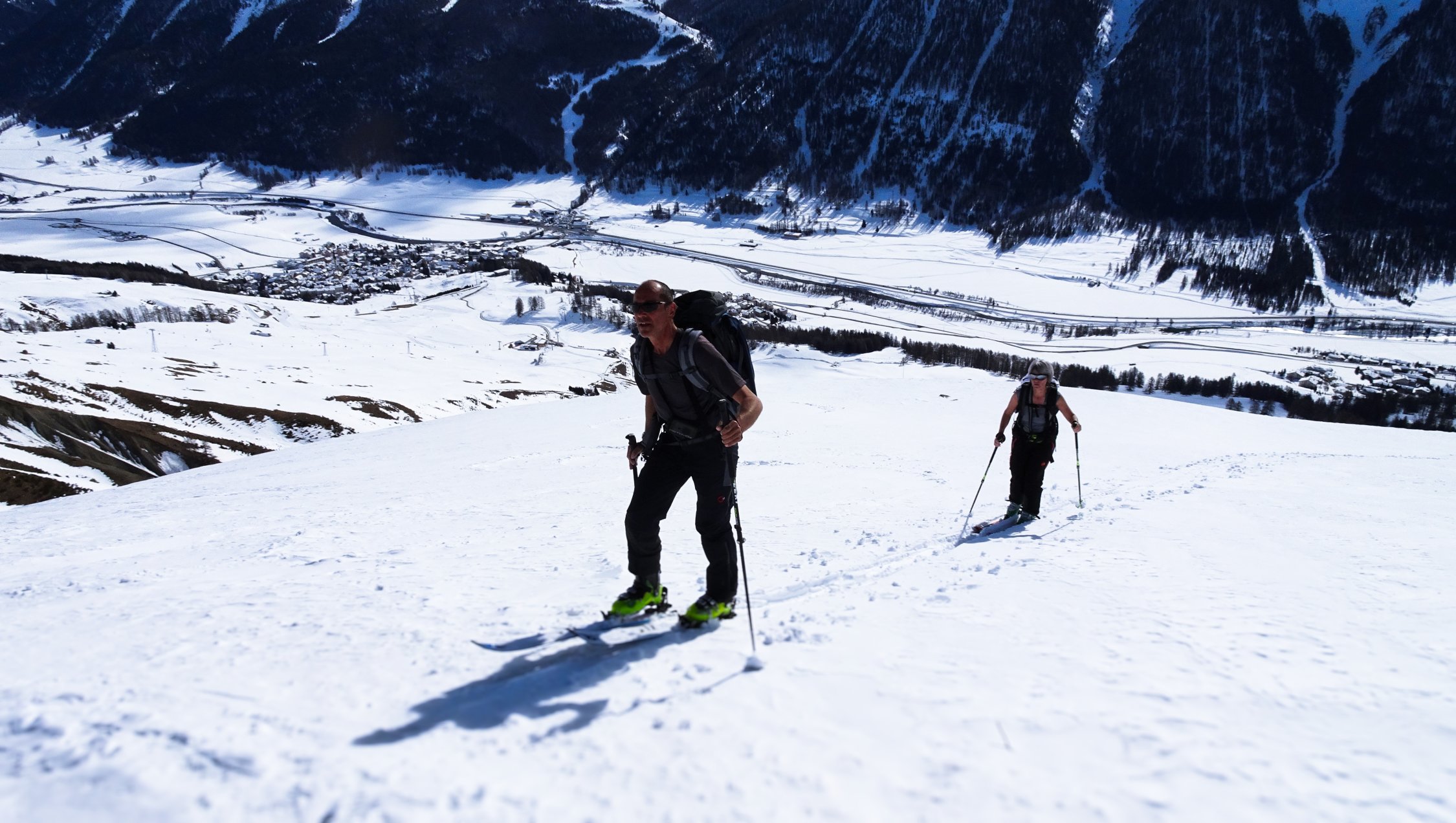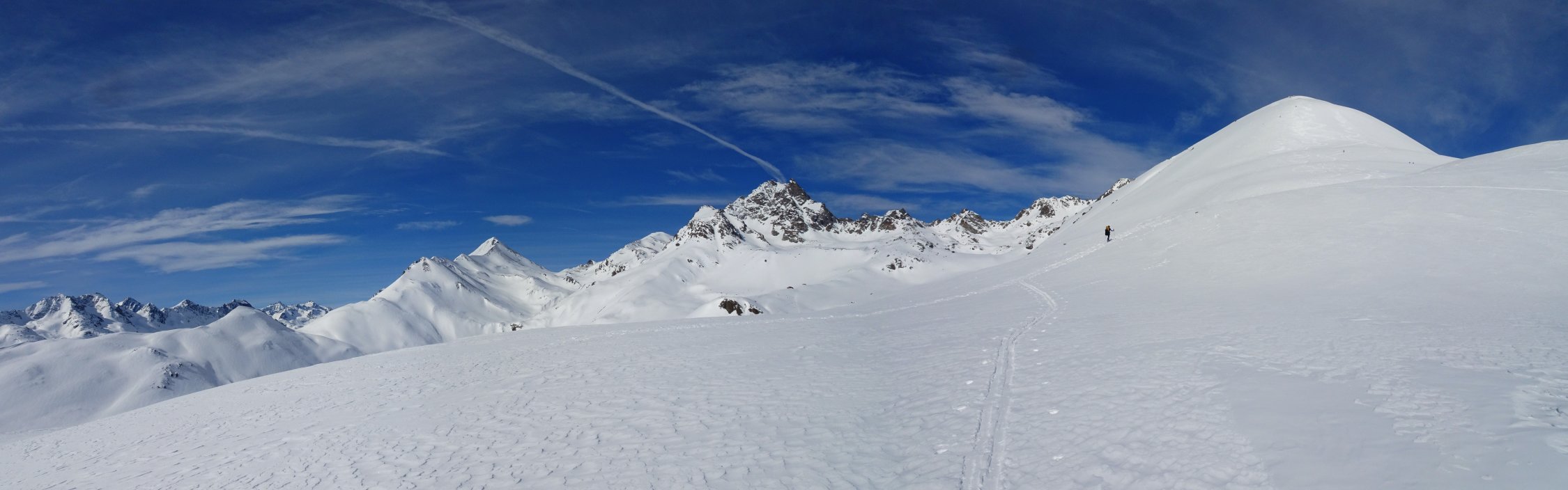 Was für ein Tag - herrlicher Sonnenschein und frischer fast unverspurter Pulverschnee. Im Aufstieg musste wir wegen Stollen an den Fellen etwas beissen. Die Abfahrt durch die Steilhänge des Belvair hat uns dafür mehr als entschädigt.