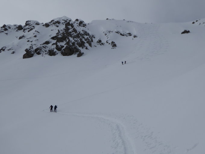 Traumhafte Schneeverhältnisse, etwas Neuschnee vom Donnerstag, unverspurte Hänge, Lichtverhältnisse im Aufstieg etwas eingeschränkt, das Wetter hat jedoch aufgehellt, so dass für die Abfahrt sehr gute Verhältnisse herrschten. Besten Dank, Hanspeter, für die Spurarbeit.