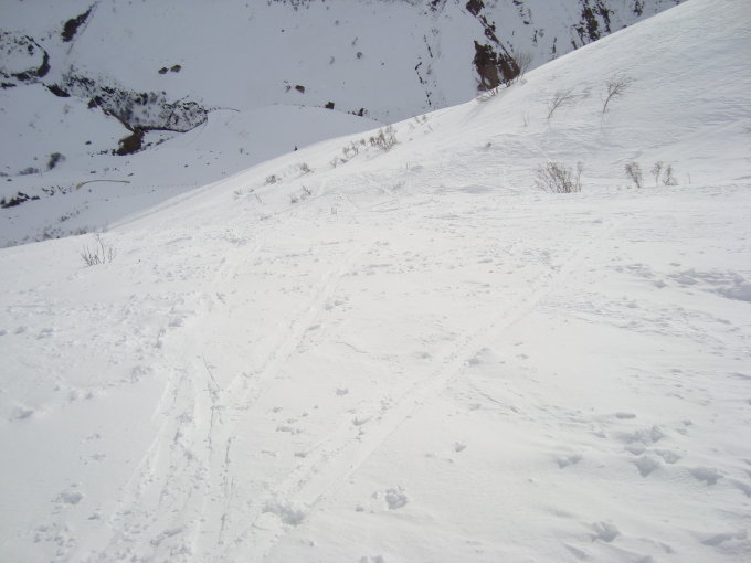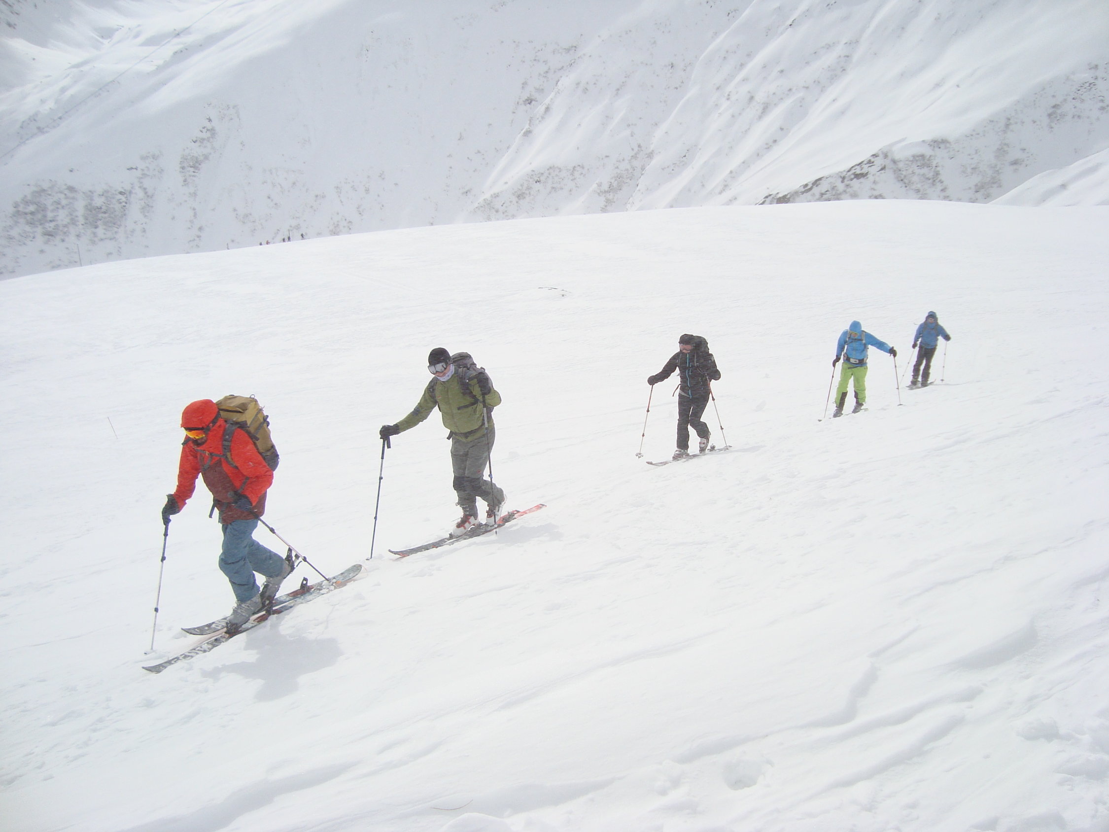 Aufstieg durch die Staudenhänge auf hartkrustigen und abgewehten Untergrund. Der obere Teil des Staudenhanges war dann bis zum Sommer-PP Tätsch, mit dem oben beschriebenen Untergrund und vielen Triebschneelinsen versehen.