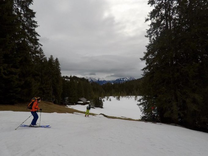 In der Abfahrt von Langis zur Ochsenalp bereits apere Stellen. Wenigstens half der Regen, damit man das Gras gleich mit den Ski abfahren konnte.
