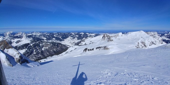 Start bei -8°C. Unten knapp 10 cm lockerer Neuschnee auf guter Unterlage, im Mittelteil dann bis etwa 30cm Pulverschnee auf reichlicher Unterlage. Die Steilstufe ist auf etwa 10hm abgeblasen und ohne Harscheisen kaum zu machen. Habe also für die paar Meter die Skier abgeschnallt und bin hochgelaufen, was gut ging. Die anderen haben die Steilstufe dann später umgangen. Der Gipfelbereich ist stark verblasen, aber es findet sich in praktisch allen Mulden guter Schnee.