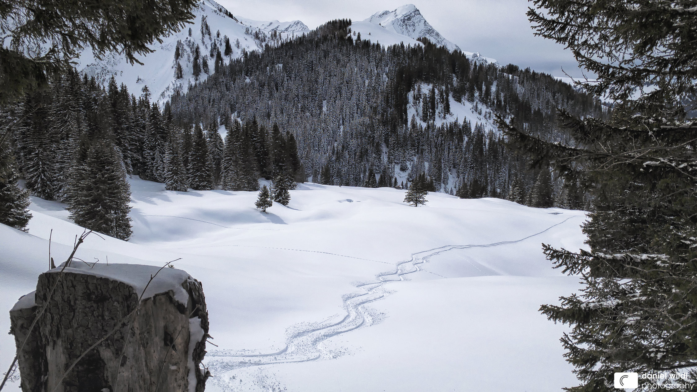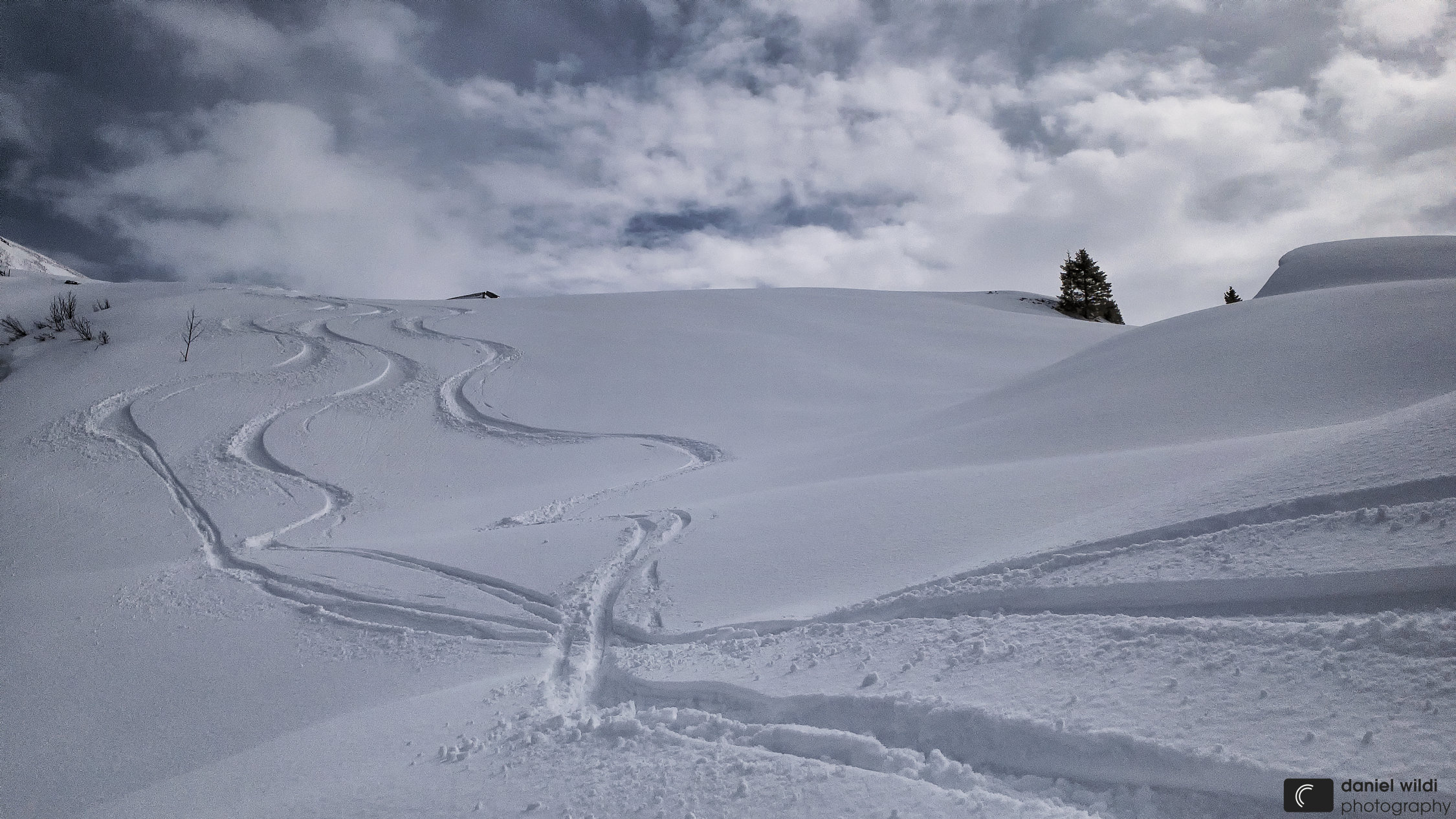 Abfahrt oben hart/eisig, dann toller Pulver und ab ca. 1600 m.ü.M., dann zusehends nasser Bremsschnee bzw. z.T. aper...Skiroute verläuft einen Teil entlang der Alpstrasse -> Skis tragen...dann reicht der Schnee noch grad bis ins Dorf runter...