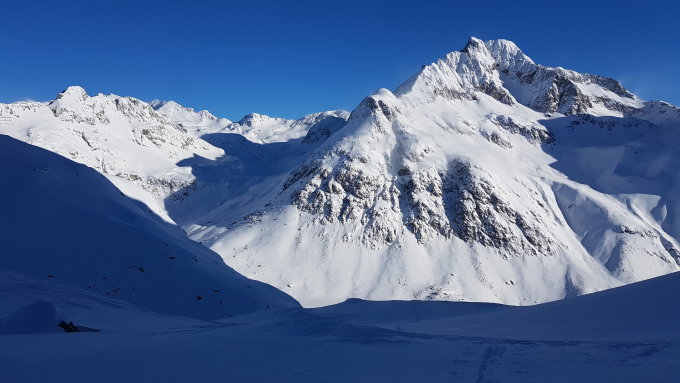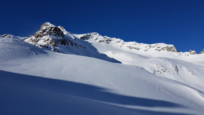 Start um 7:30 ab Parkpltz Julierstrasse bei starkem, kalten Wind. Bin als erster hoch gestiegen und deshalb alles gespurt. Habe im Bereich des See's früher als üblich hoch gezogen. Dies ergab eine regelmässig steigende Spur, dafür etwas länger im Schräghang. Oben wieder stärkerer Wind, entsprechend war der Grat abgeblasen. Vom Sattel auf den Wintergipfel ging ich ein Stück zu Fuss. Dann ein Stück auf der Südseite, dabei einen kleinen Rutsch ausgelöst.